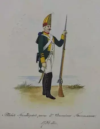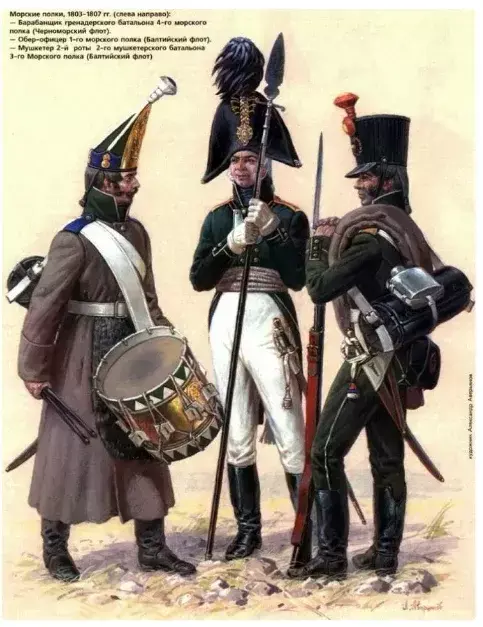 Фузилёр3-го Морского полка (зимняя форма; слева) и матросГвардейского экипажа (зимняя форма), из серии «Русская армия в 1812 году»