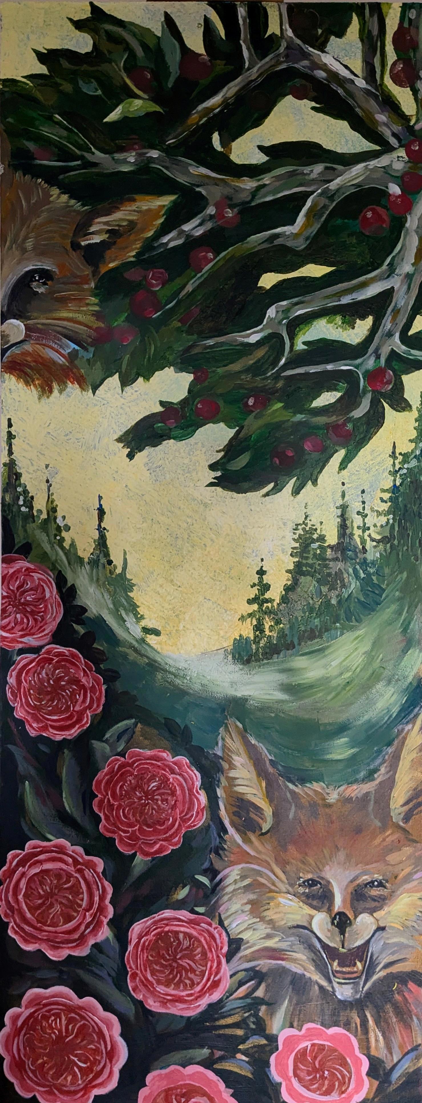 Нарисовала лис, потому что они к нему заходят, и розы, потому что он разводит один редкий сорт.