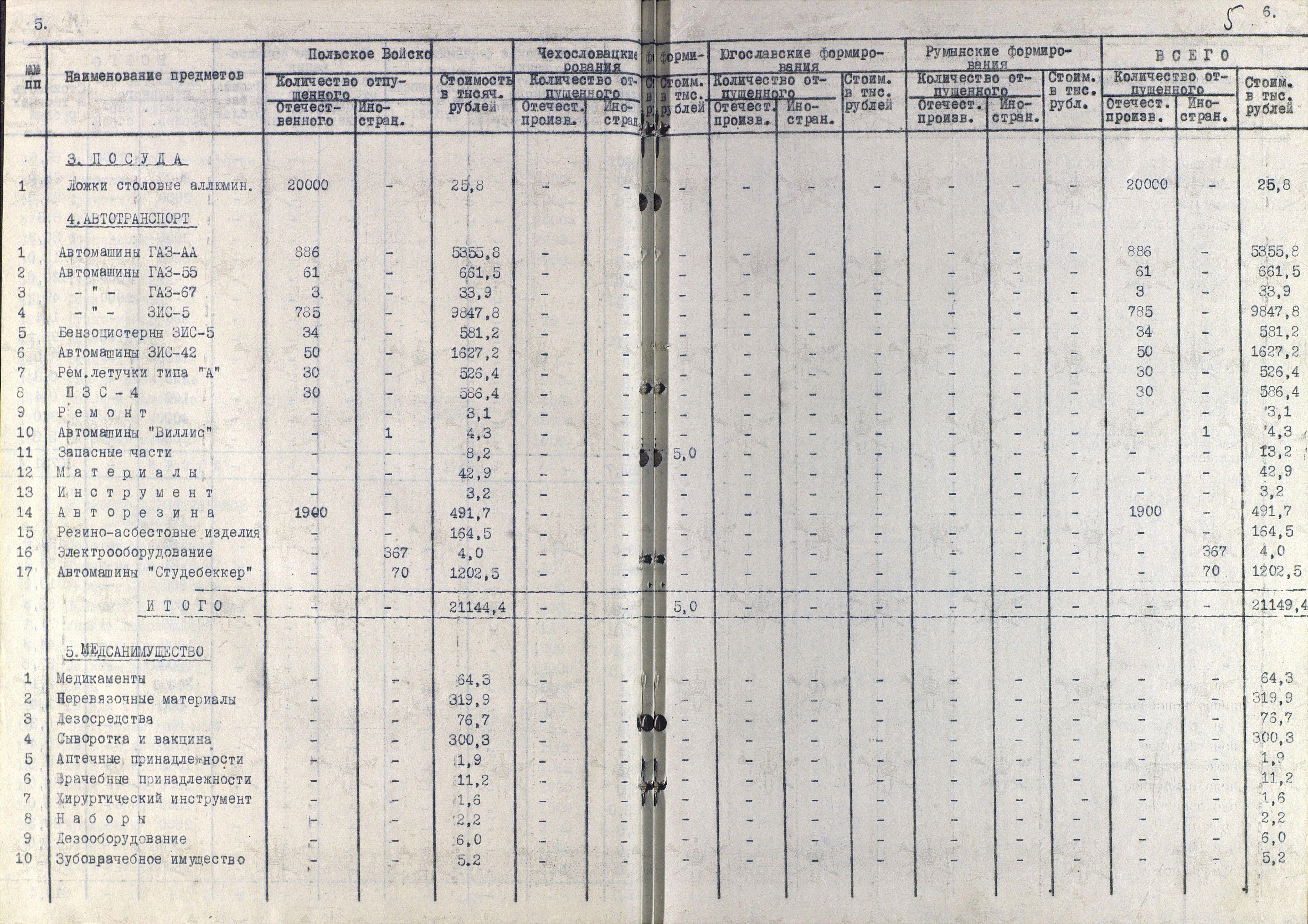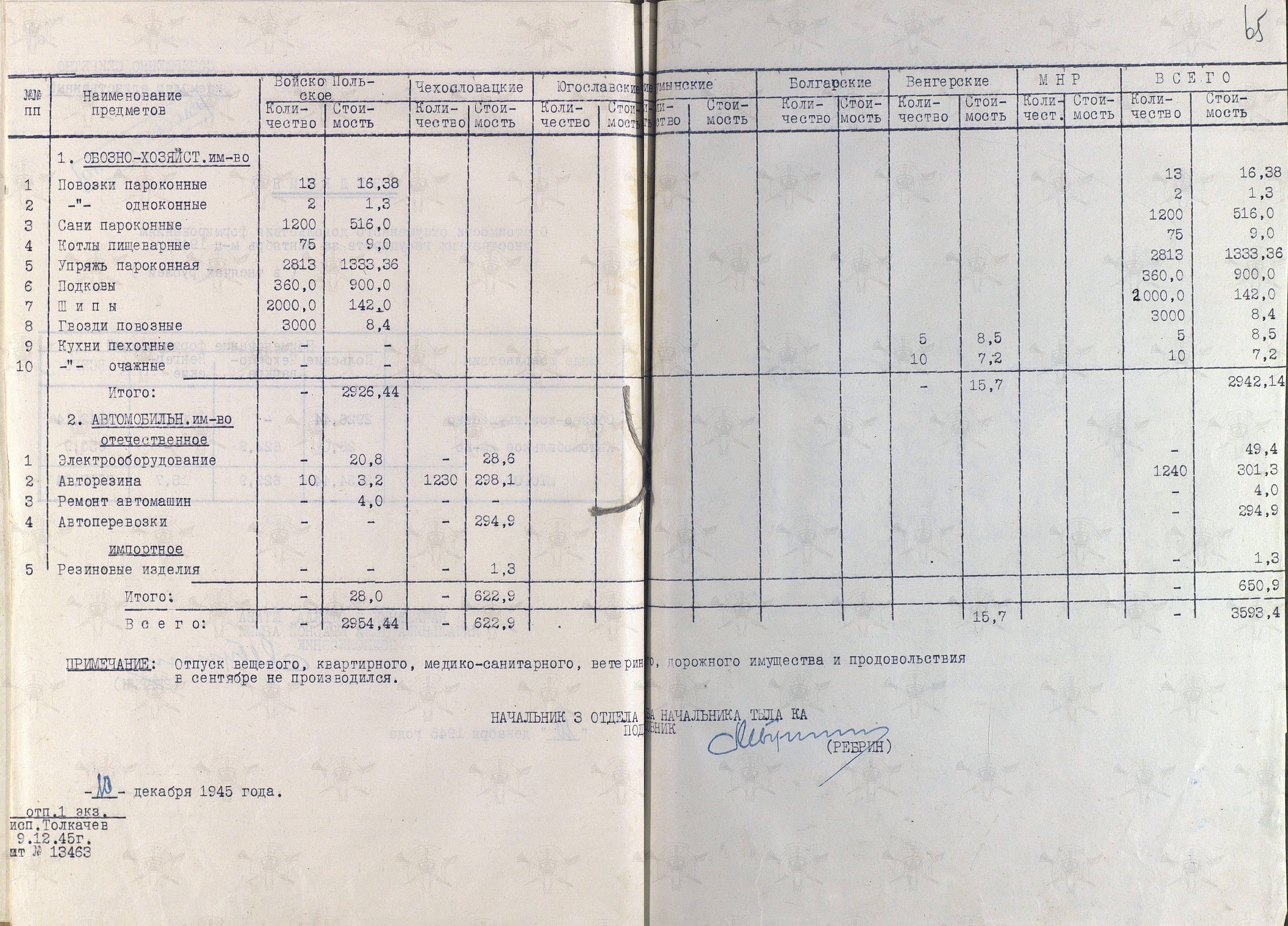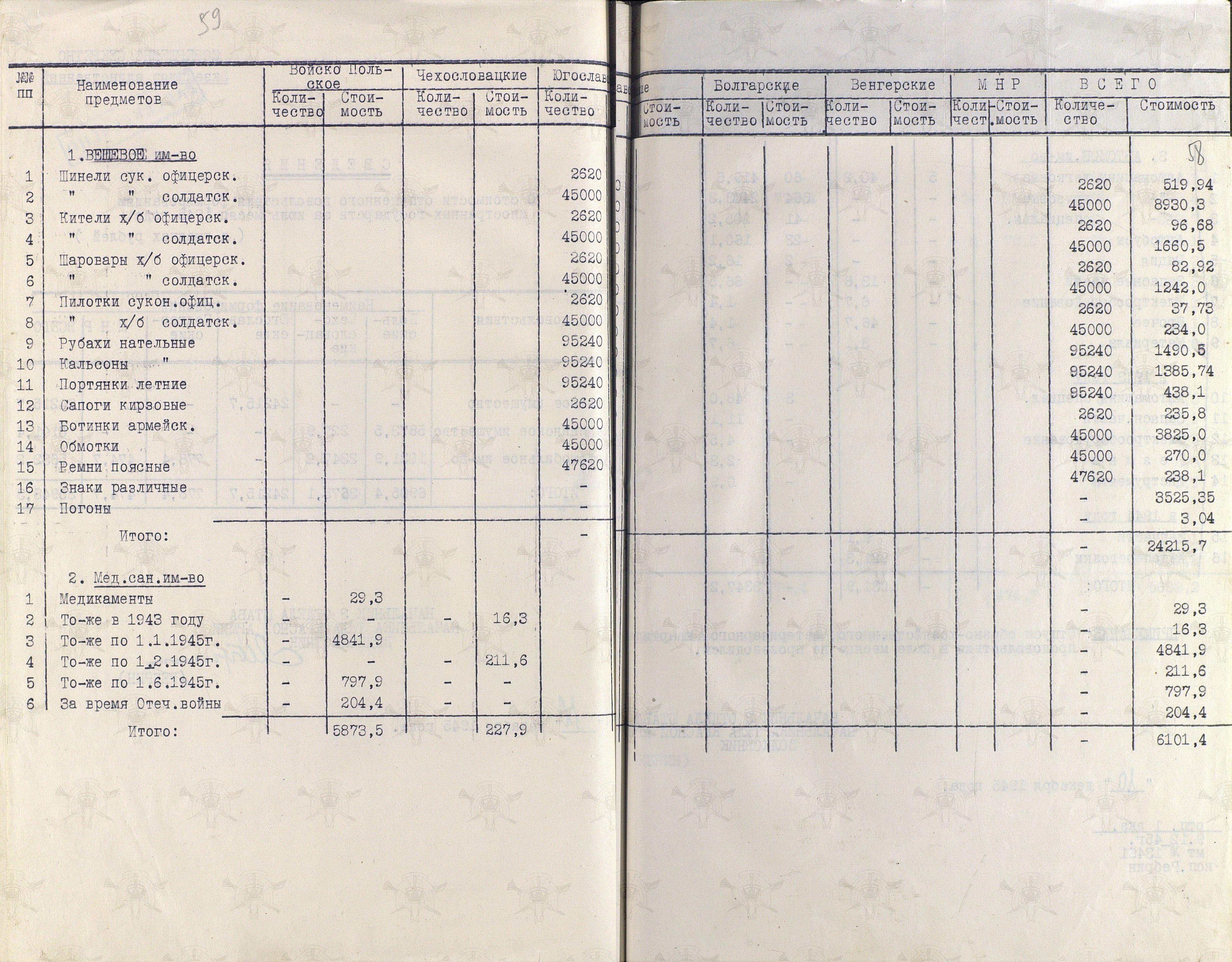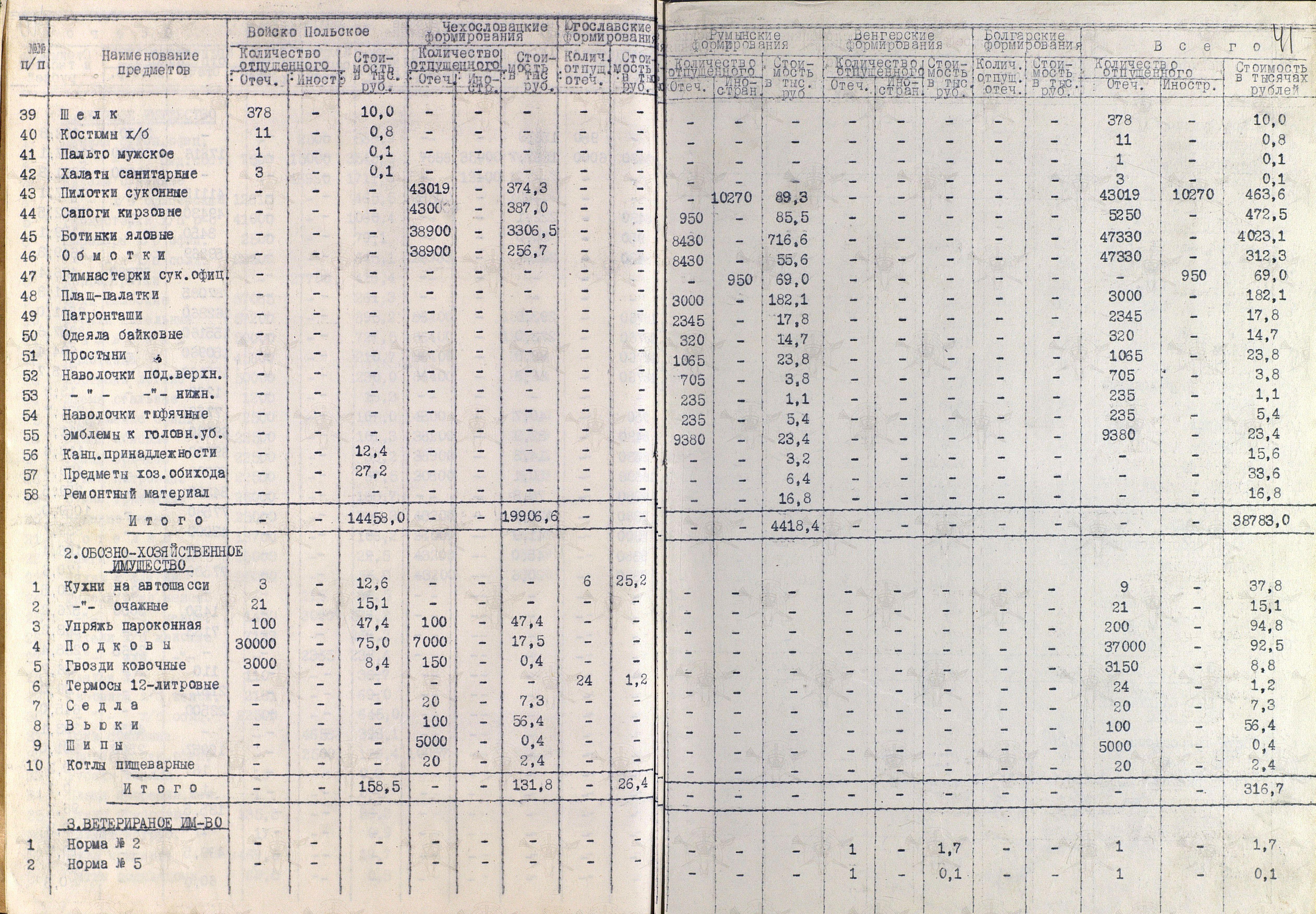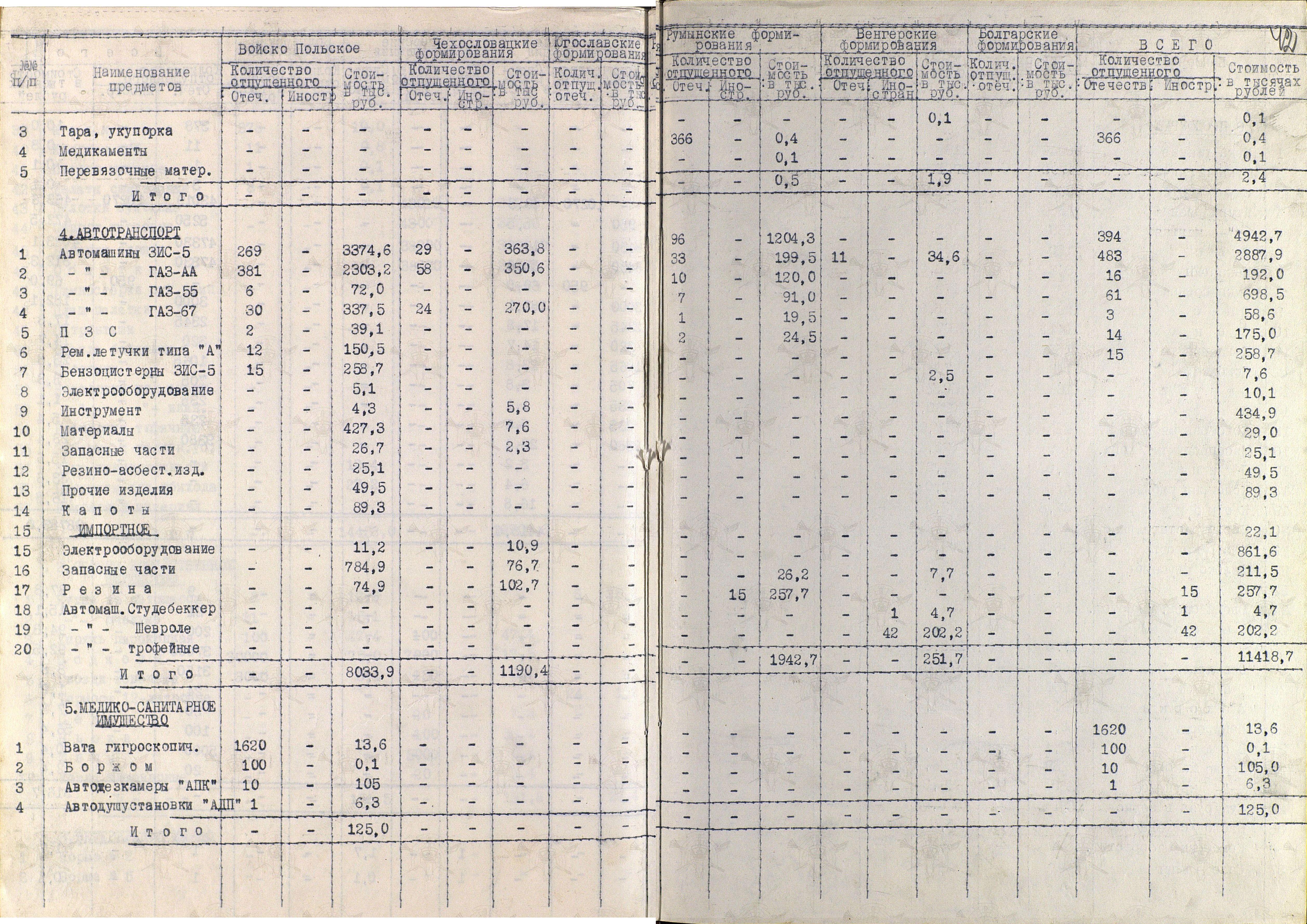 Сразу хочу сказать, что документ - многостраничный, в реальности представляет собой подобие книги учёта, со сводными данными за период от начала формирования и по 1 января 1945 г. и ежемесячные данные по каждой стране. Расход материальных средств считался по каждой службе и видам матсредств отдельно, а именно: