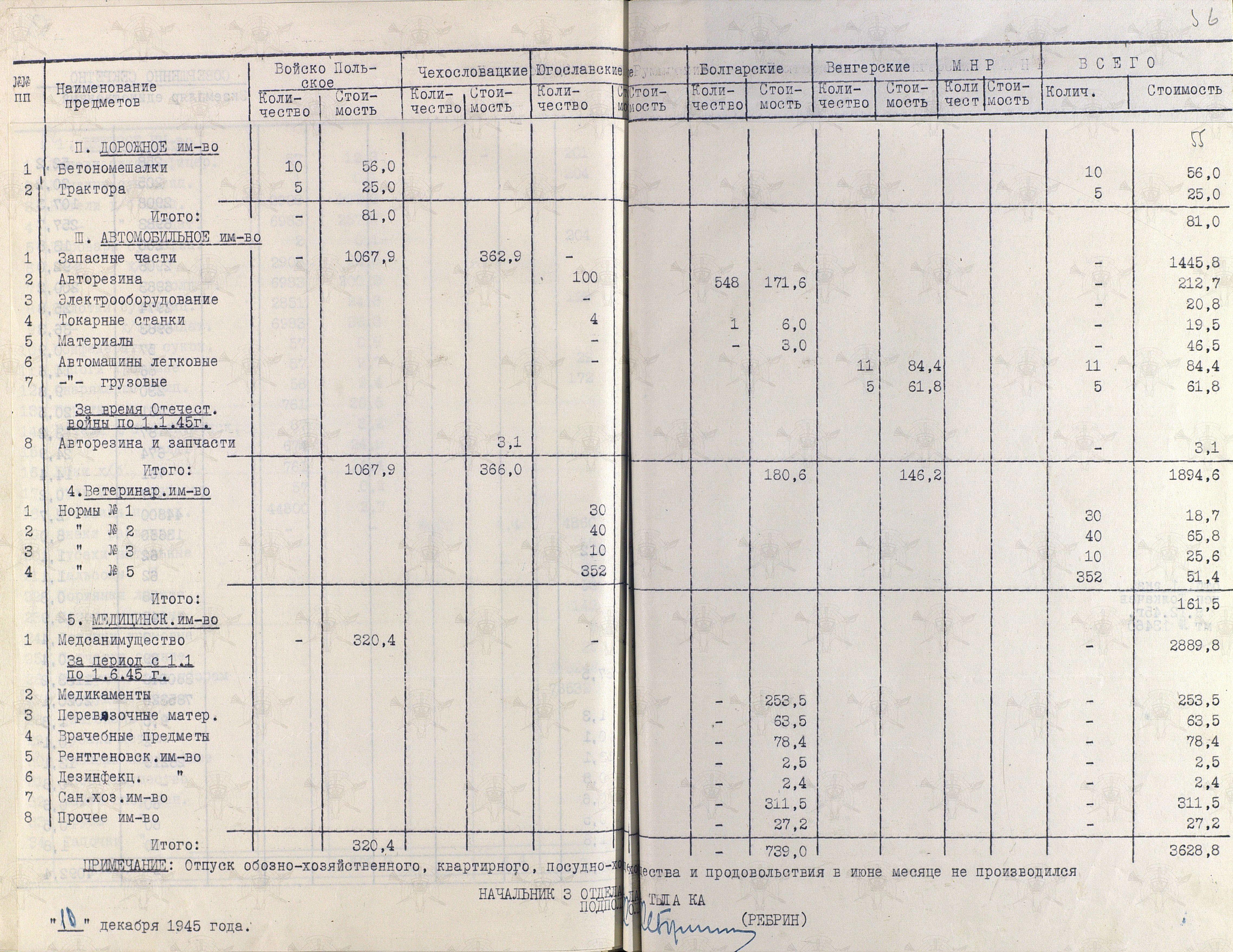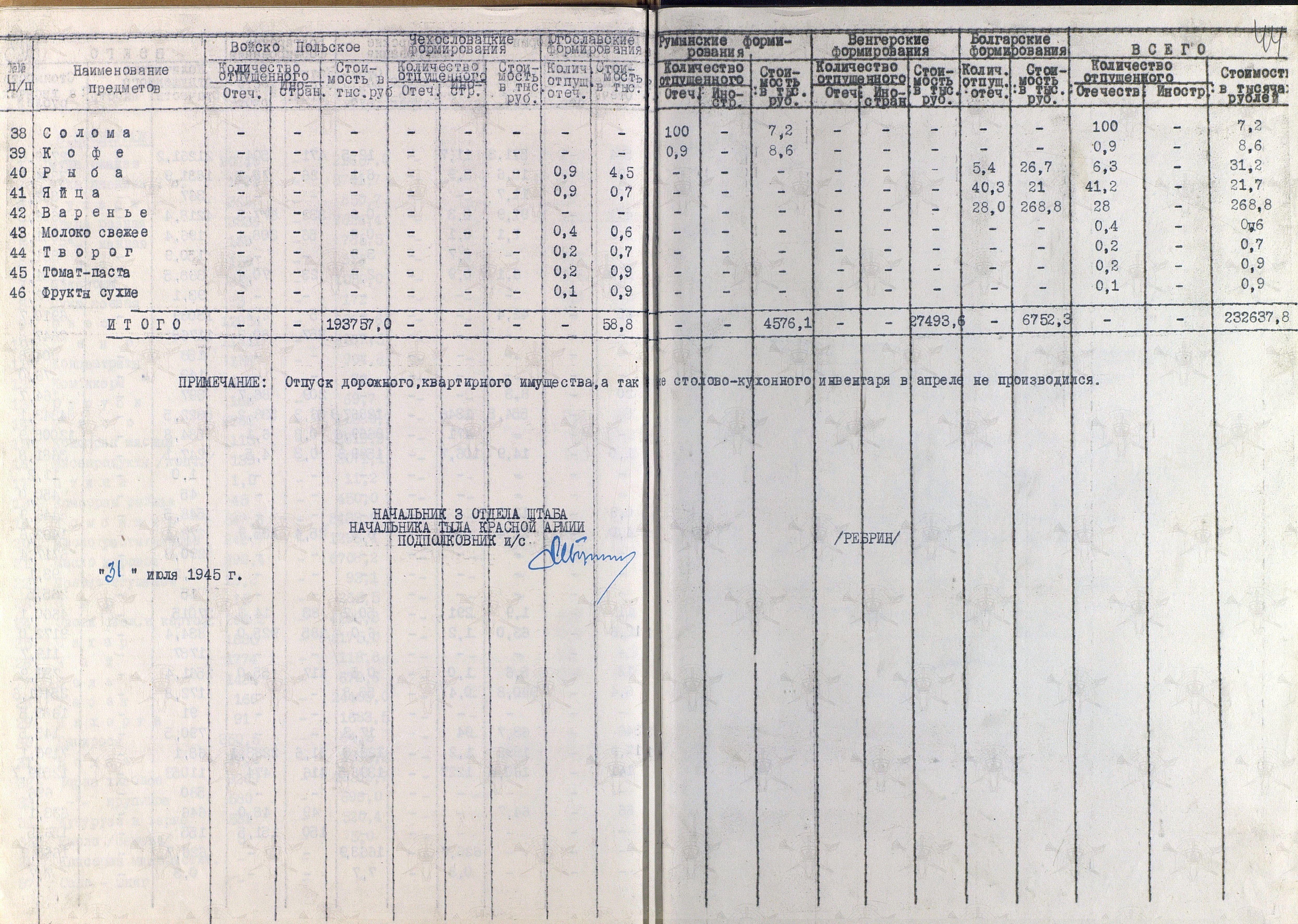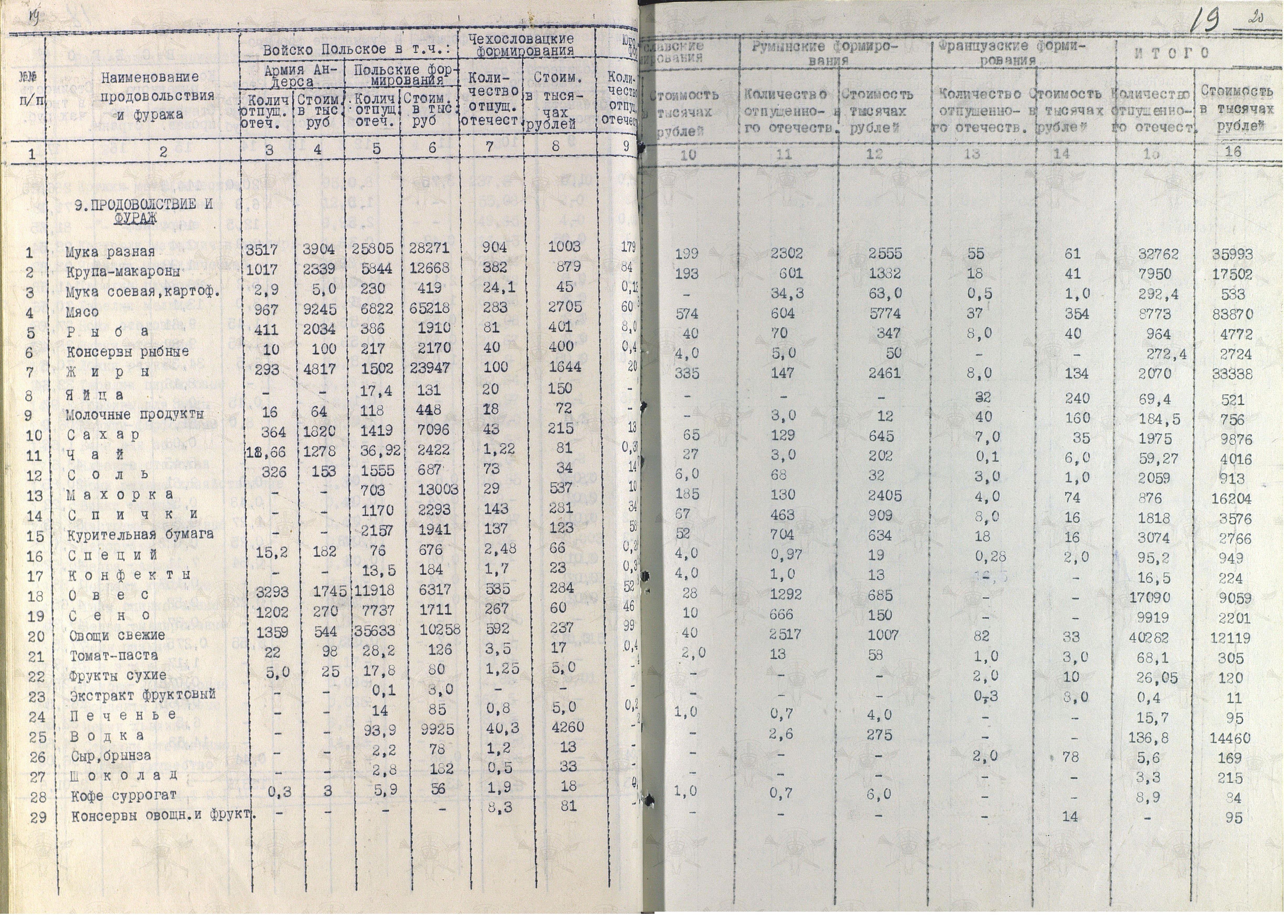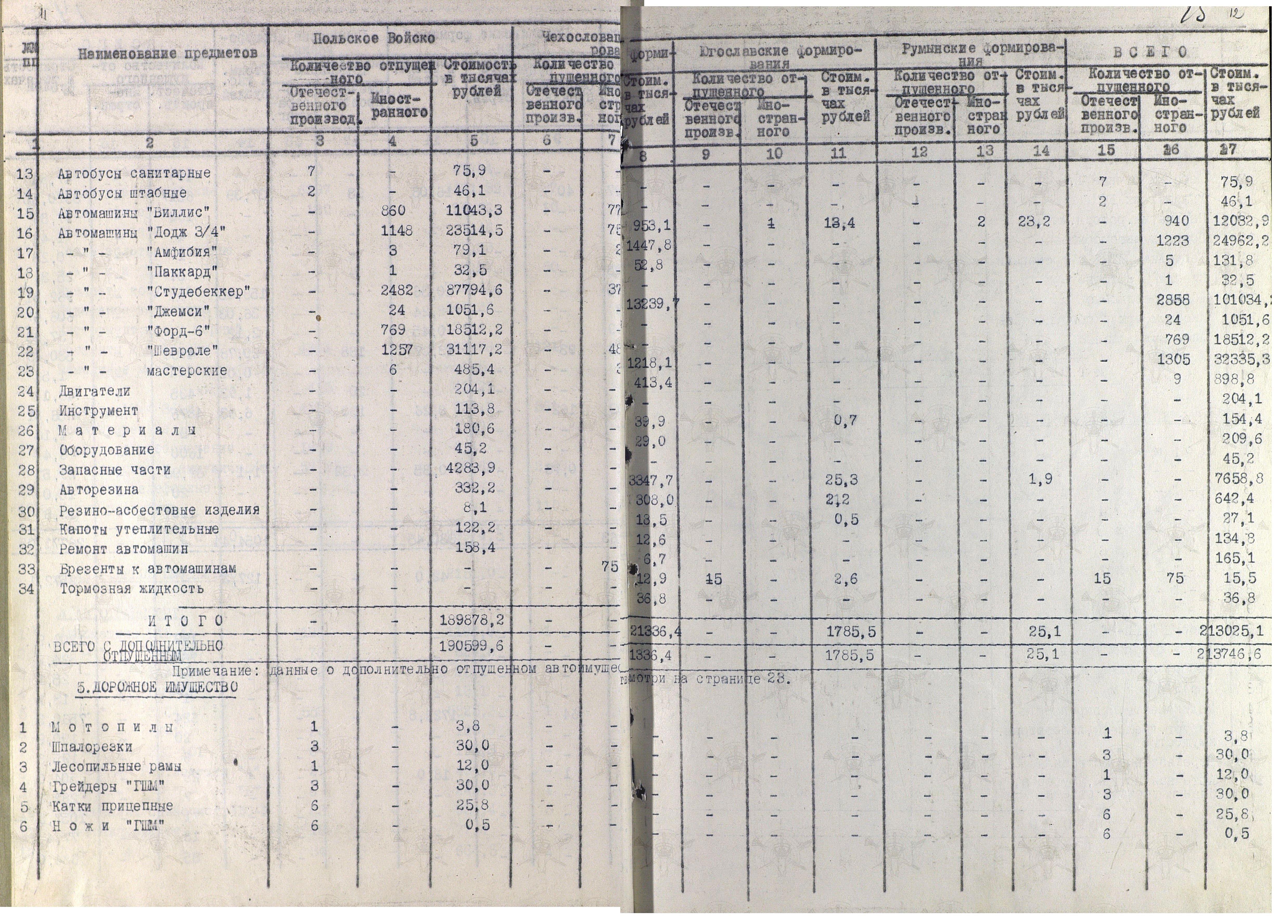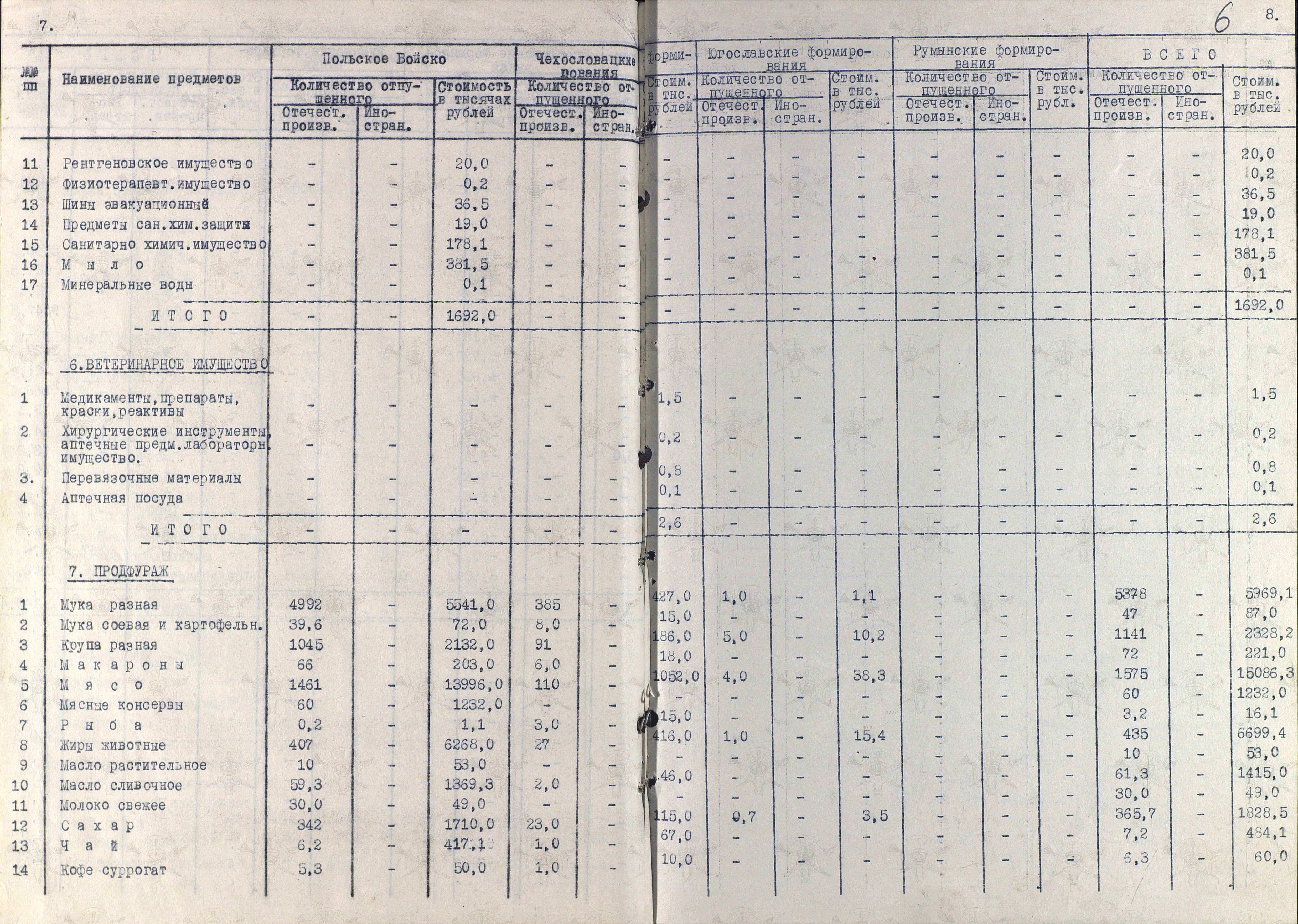 Сразу хочу сказать, что документ - многостраничный, в реальности представляет собой подобие книги учёта, со сводными данными за период от начала формирования и по 1 января 1945 г. и ежемесячные данные по каждой стране. Расход материальных средств считался по каждой службе и видам матсредств отдельно, а именно: