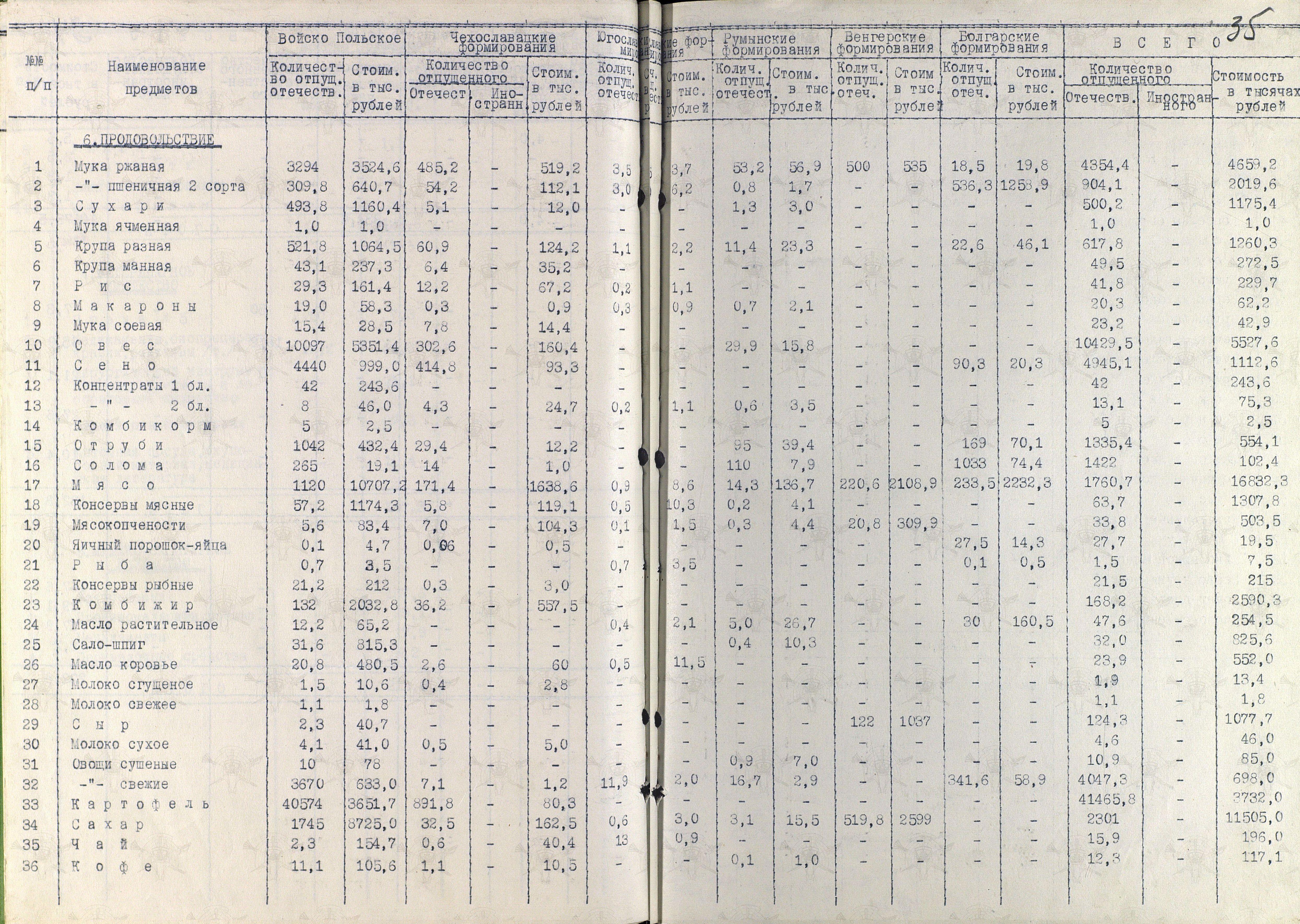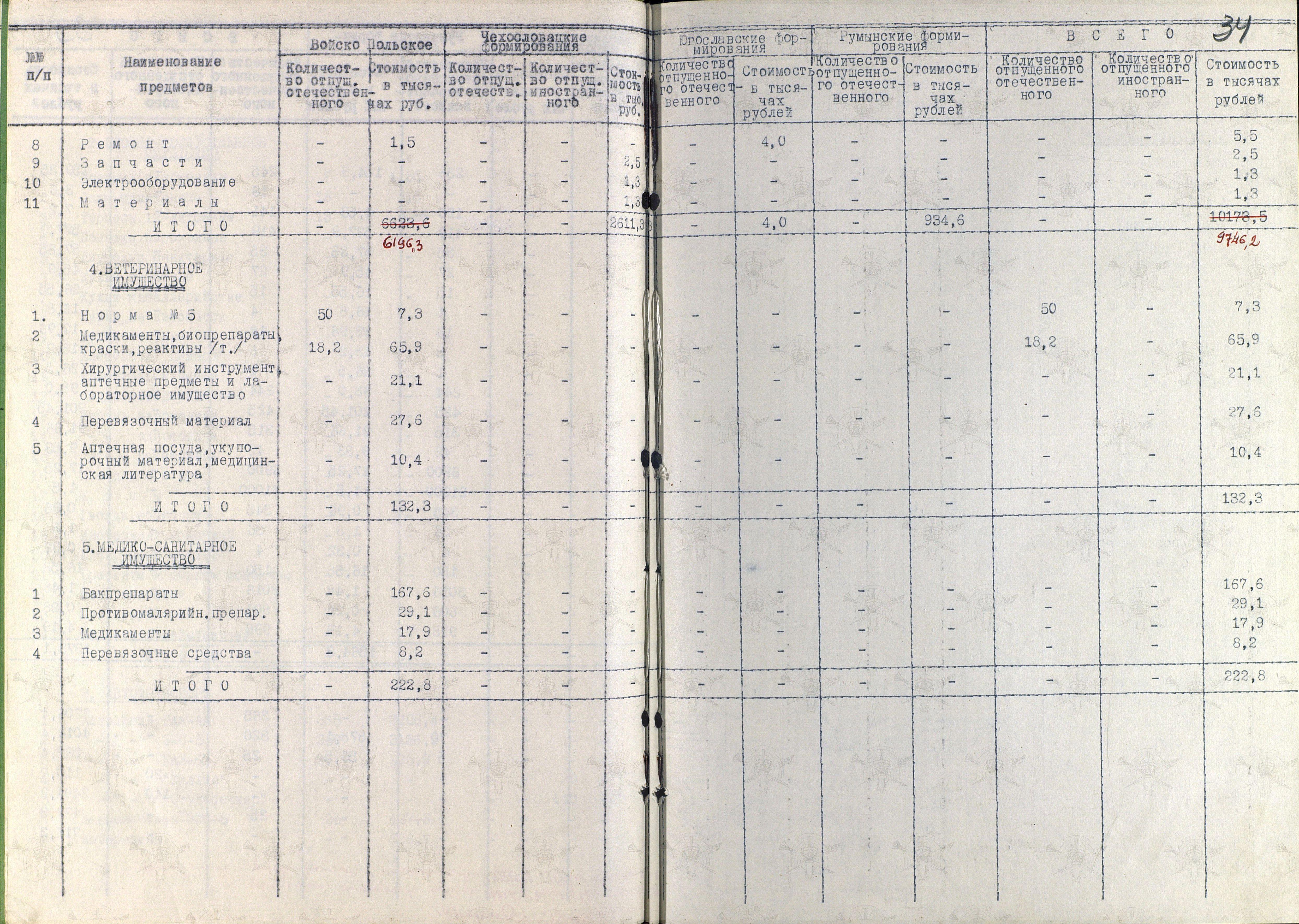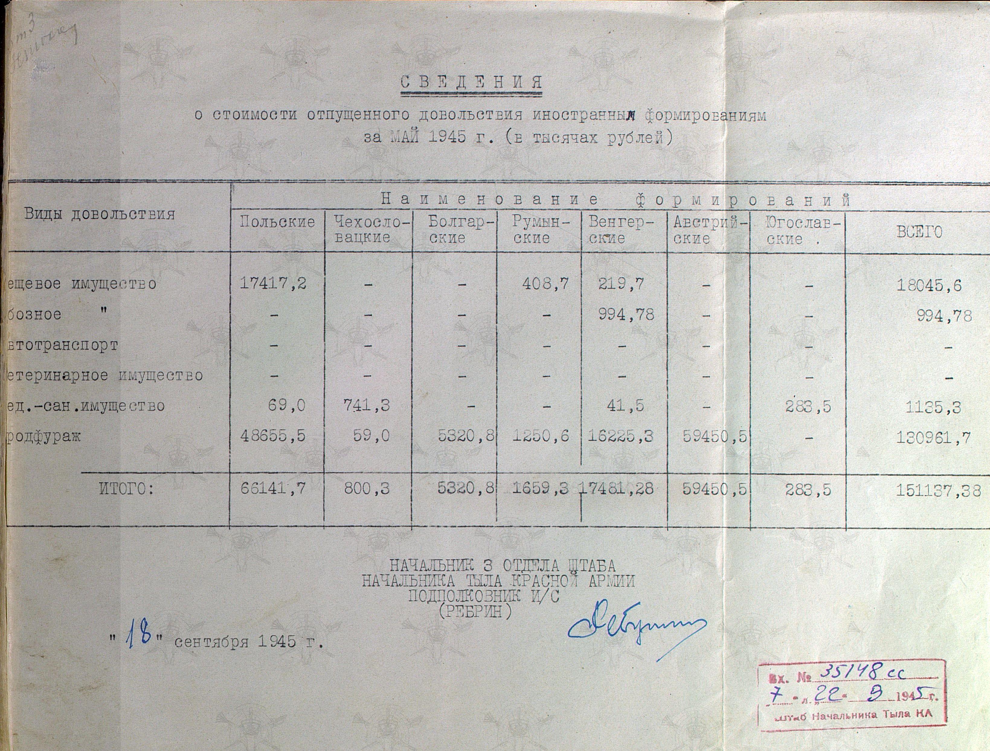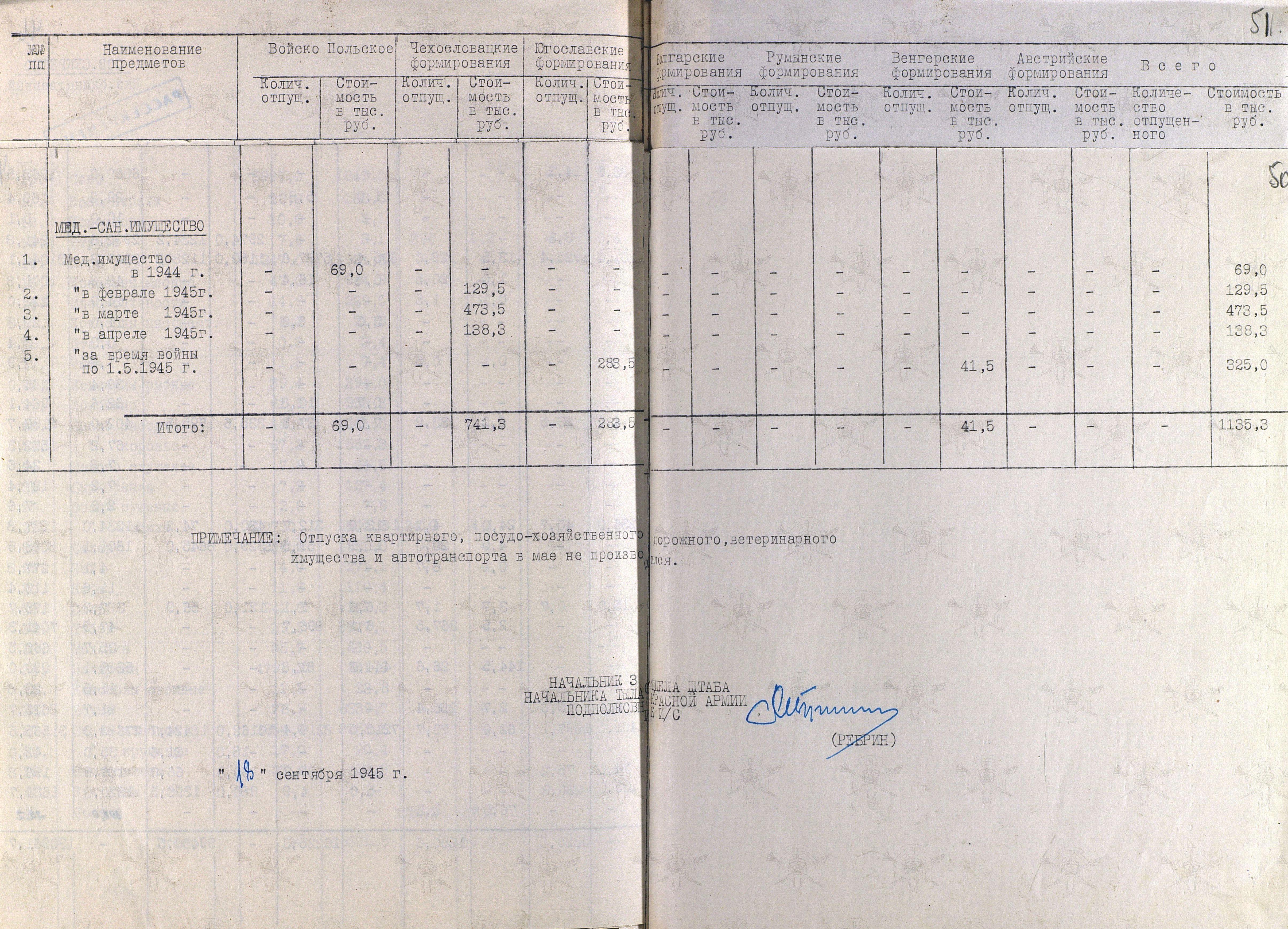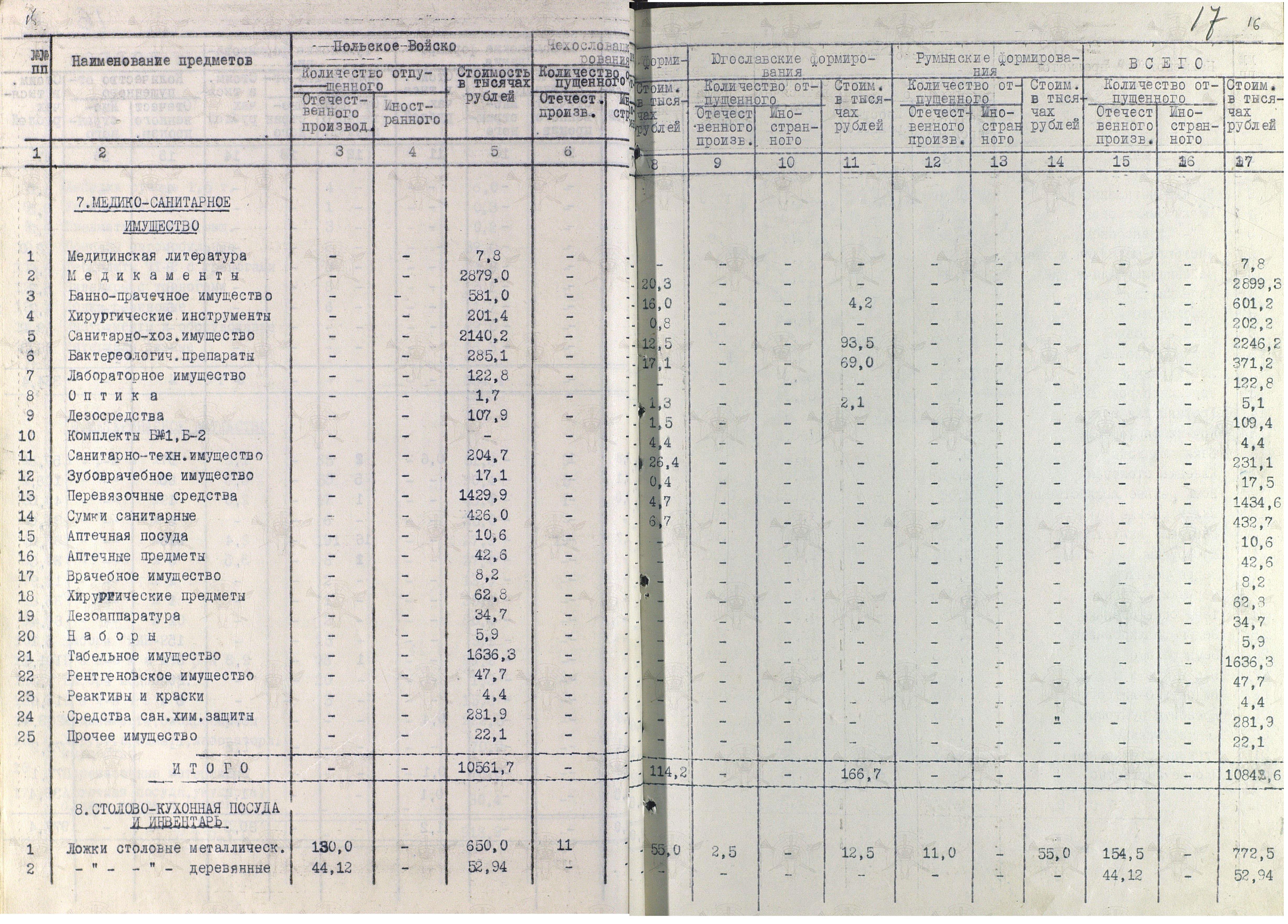 Сразу хочу сказать, что документ - многостраничный, в реальности представляет собой подобие книги учёта, со сводными данными за период от начала формирования и по 1 января 1945 г. и ежемесячные данные по каждой стране. Расход материальных средств считался по каждой службе и видам матсредств отдельно, а именно: