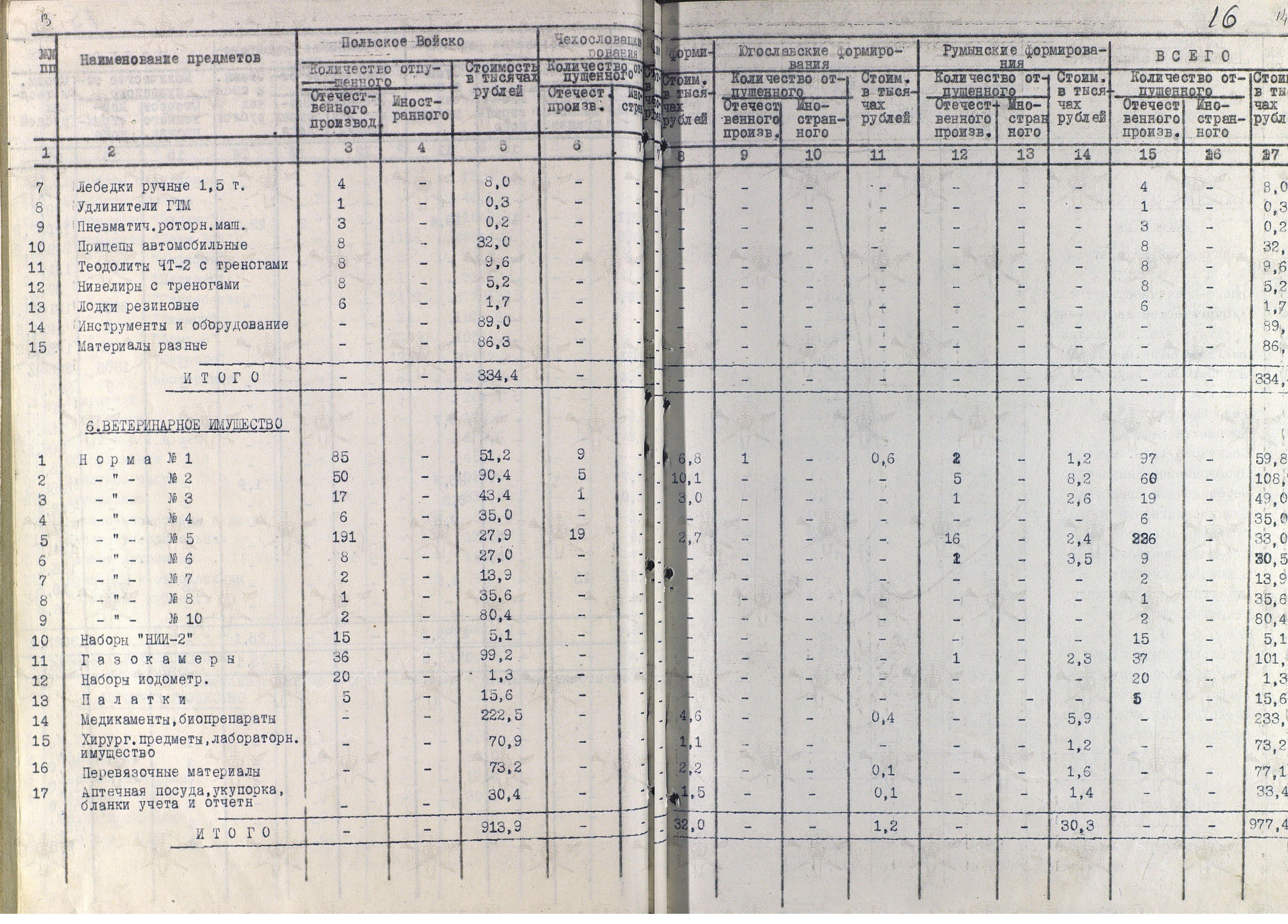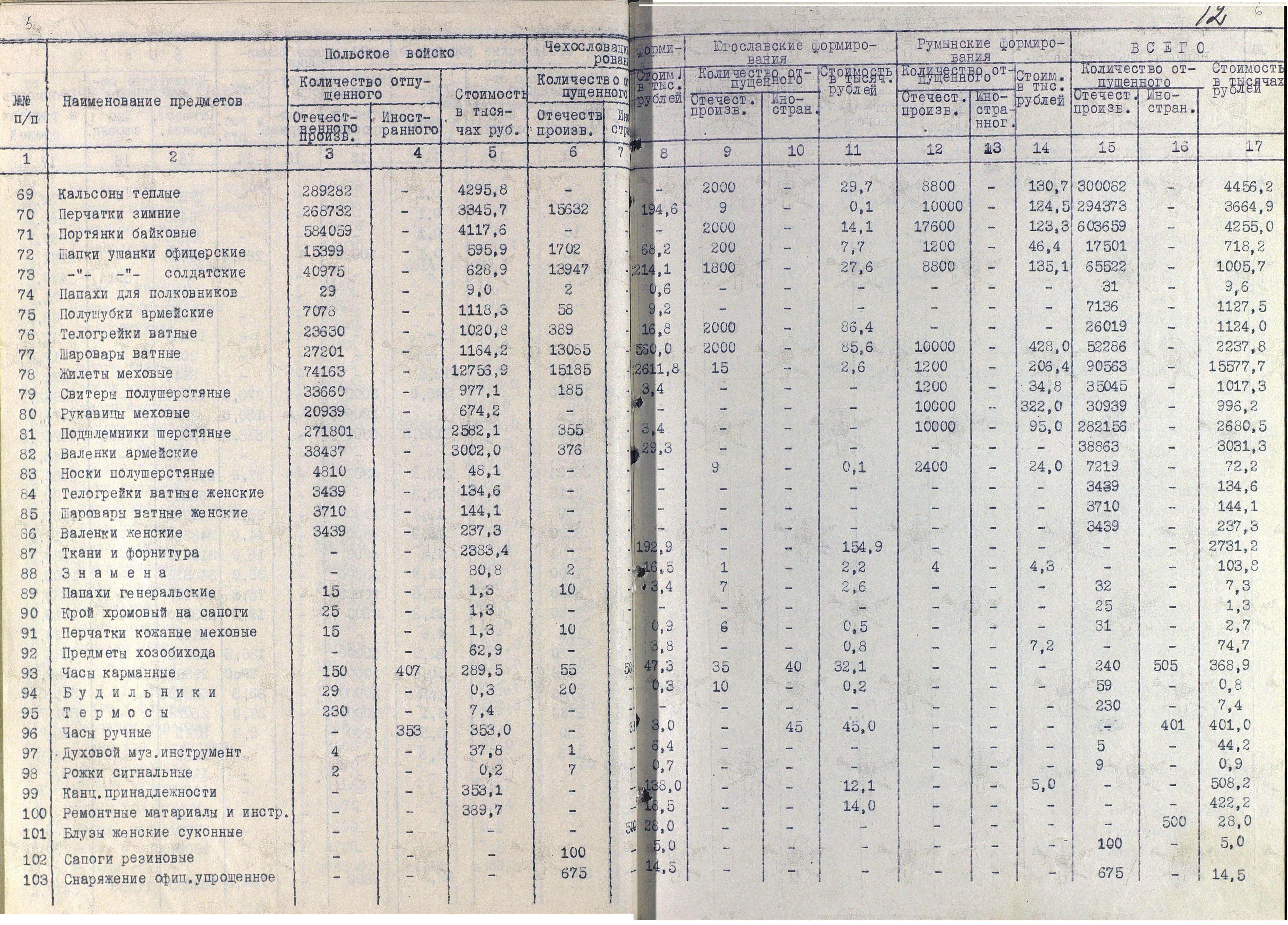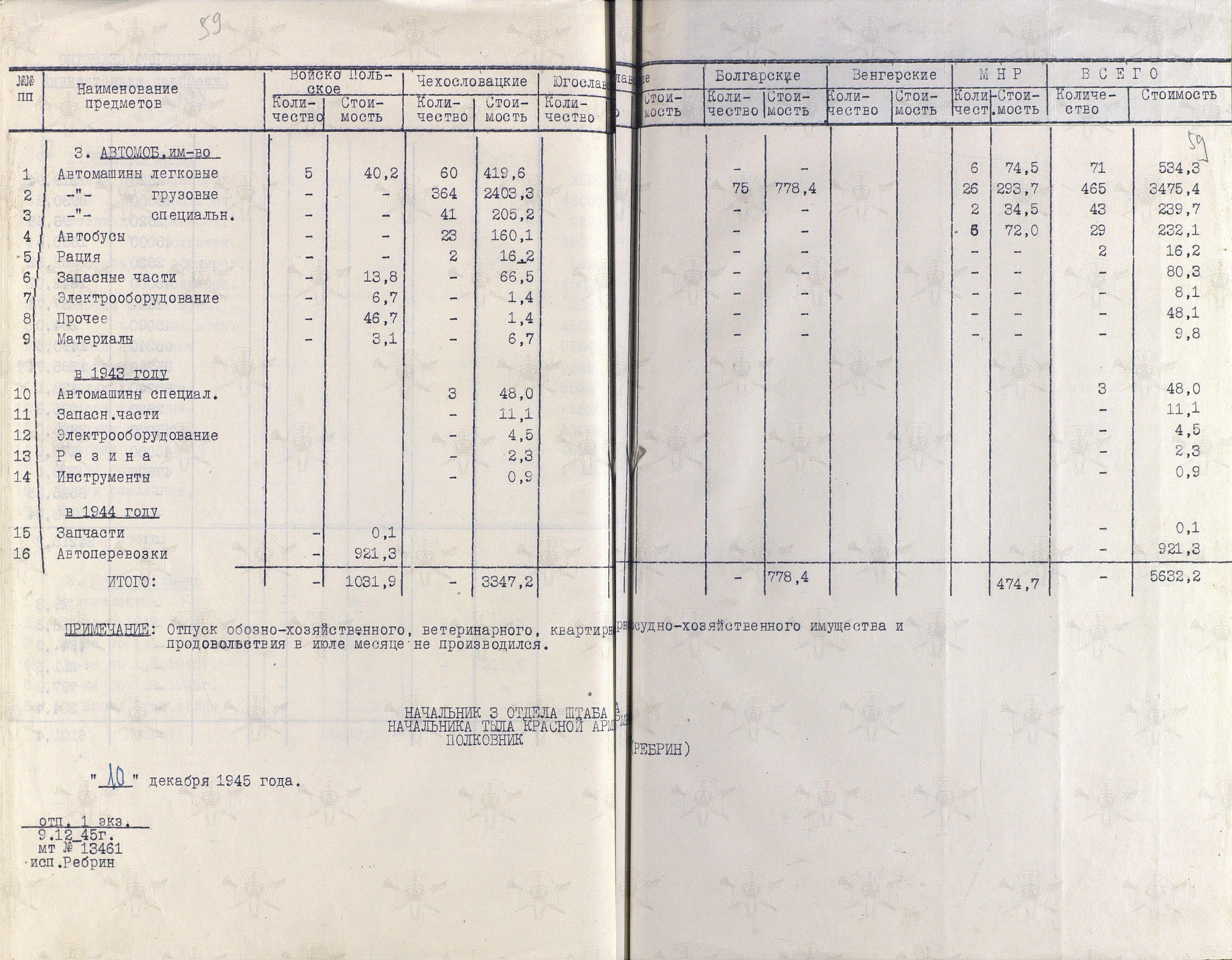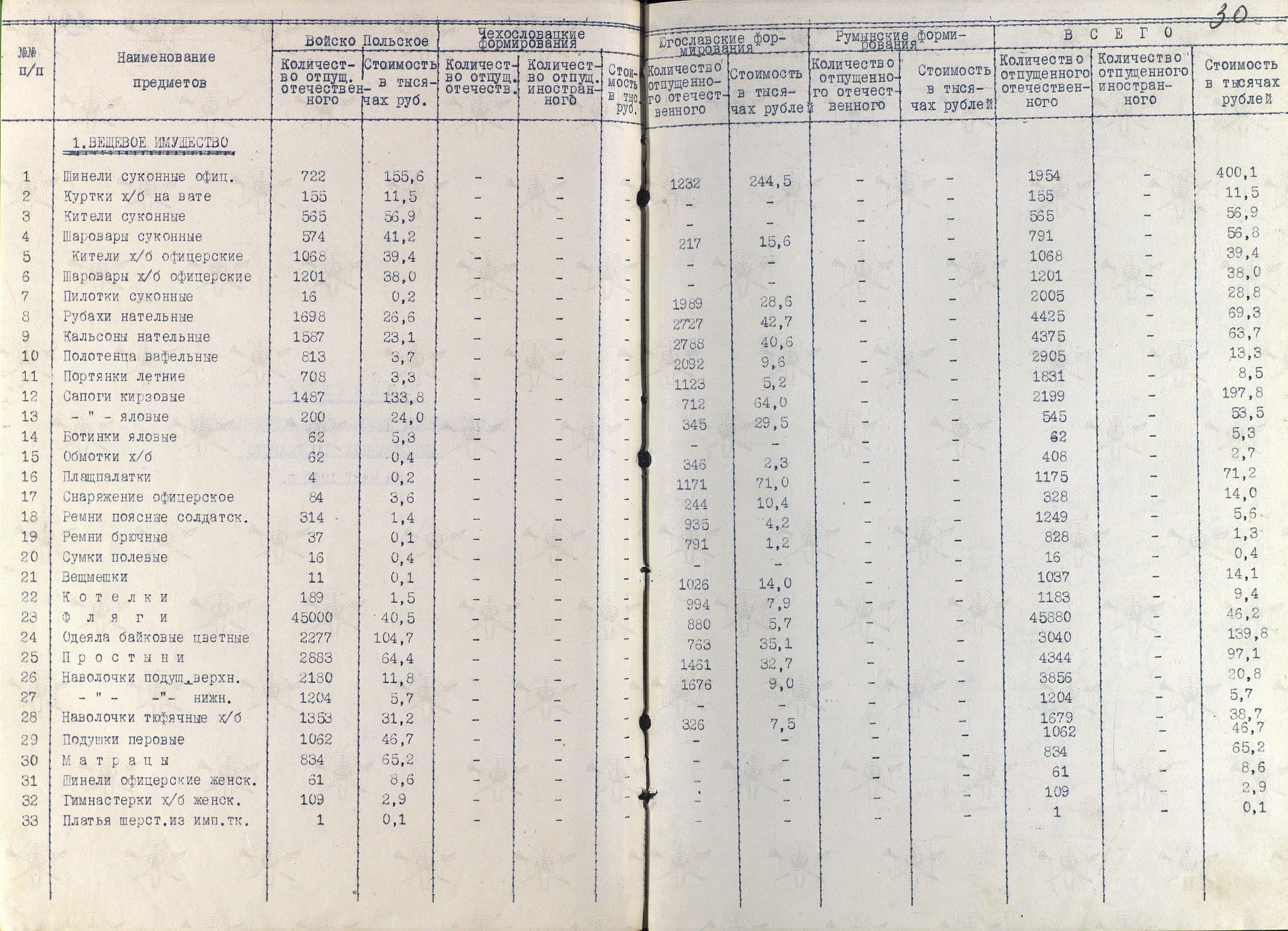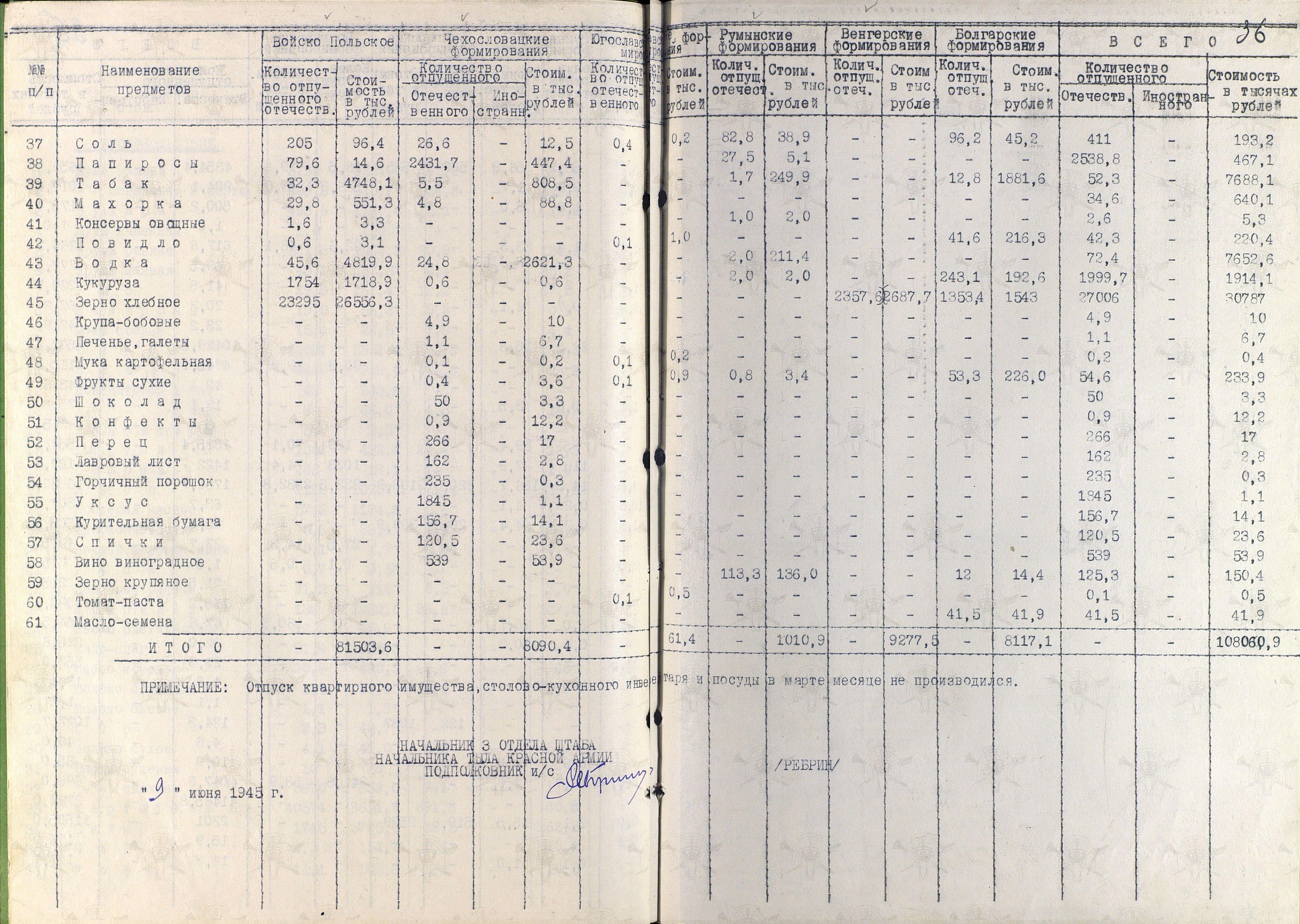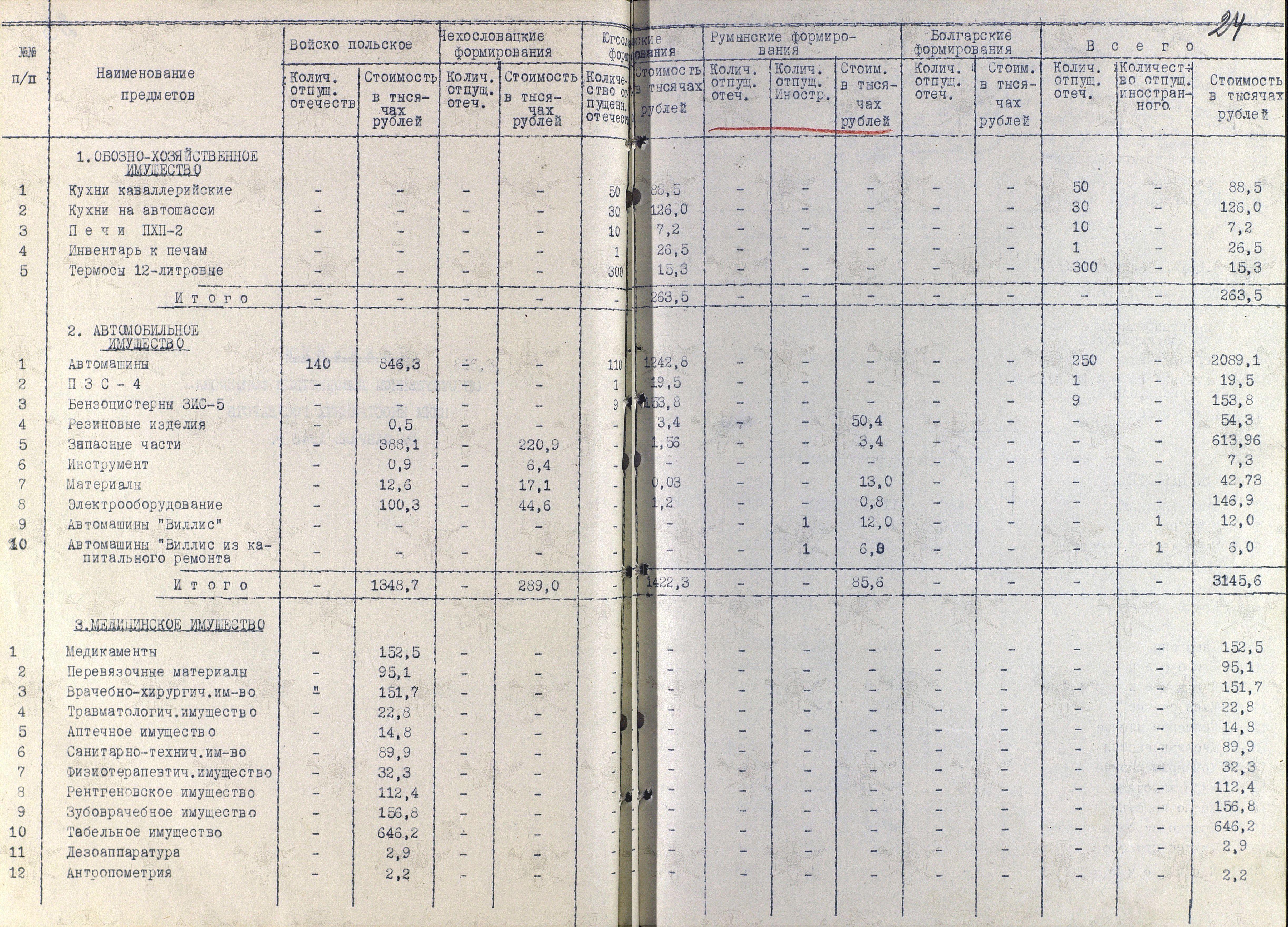 Сразу хочу сказать, что документ - многостраничный, в реальности представляет собой подобие книги учёта, со сводными данными за период от начала формирования и по 1 января 1945 г. и ежемесячные данные по каждой стране. Расход материальных средств считался по каждой службе и видам матсредств отдельно, а именно: