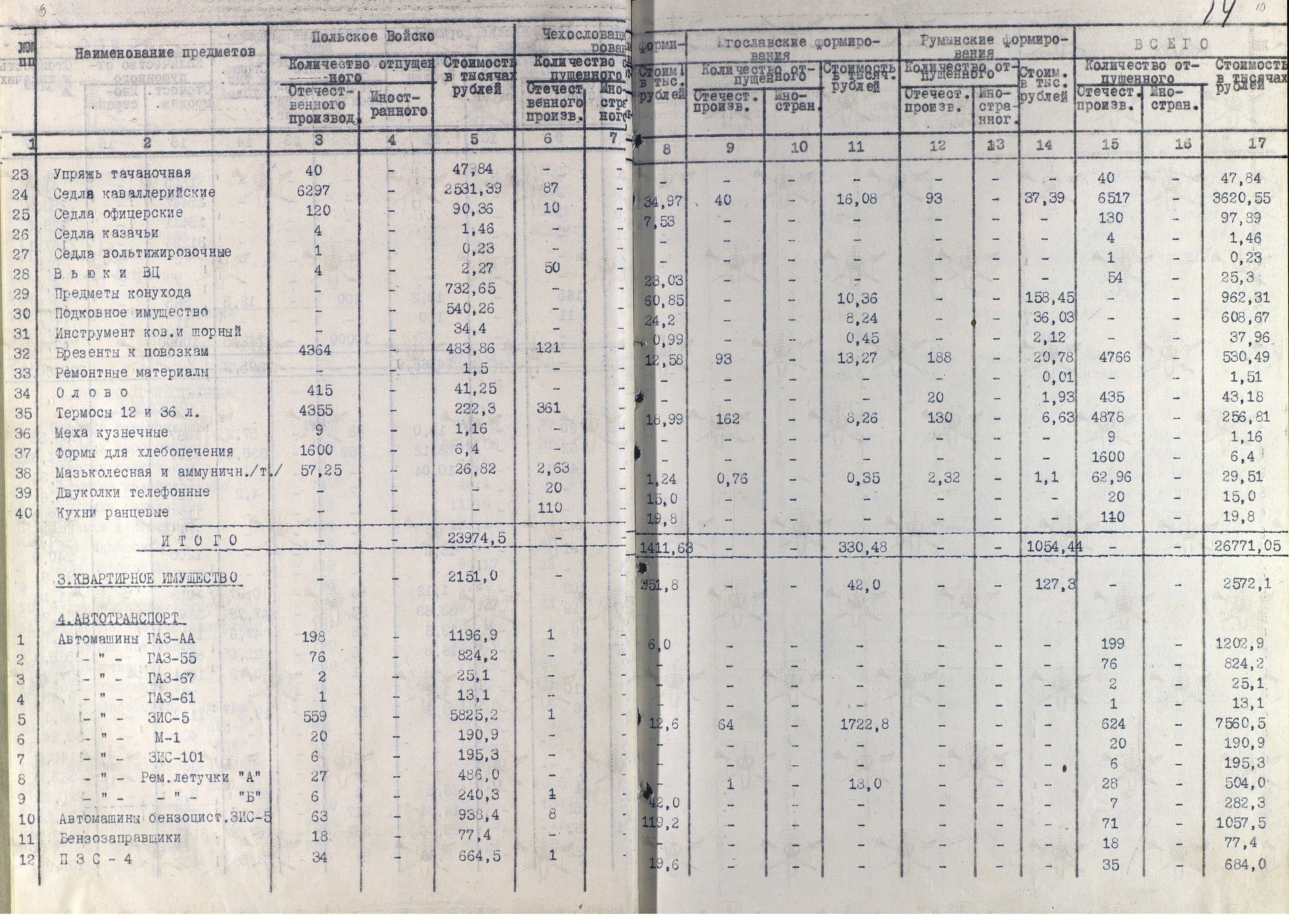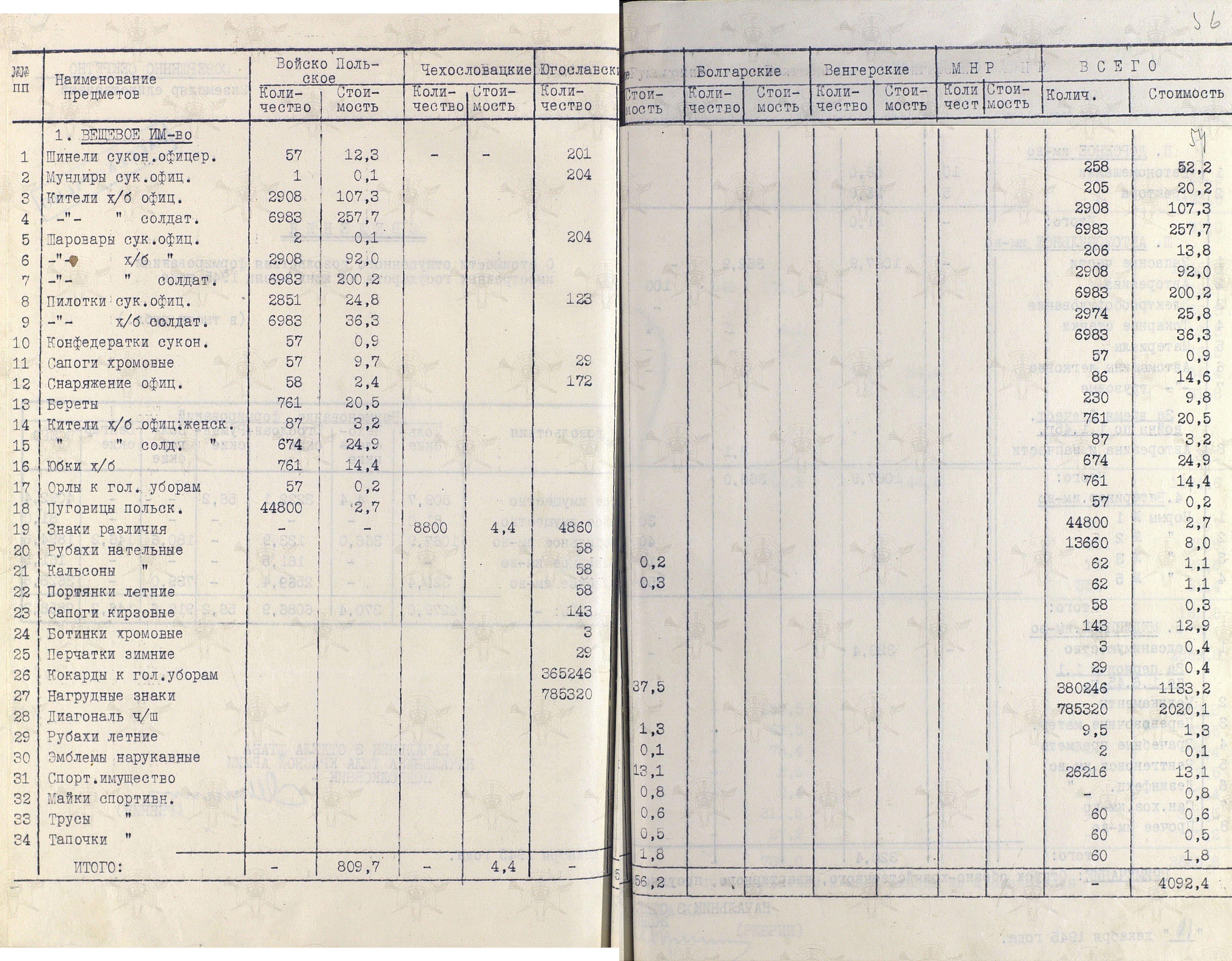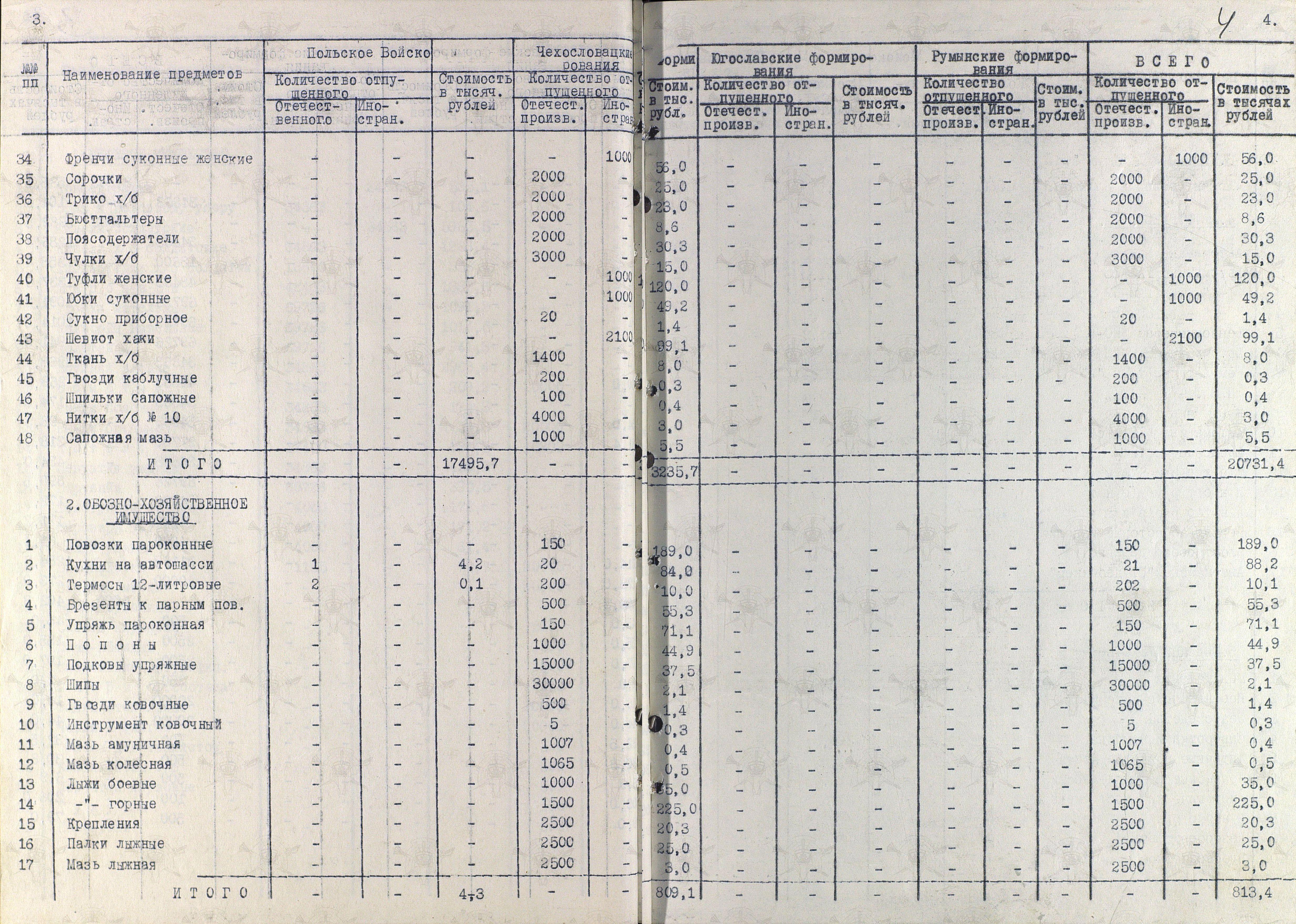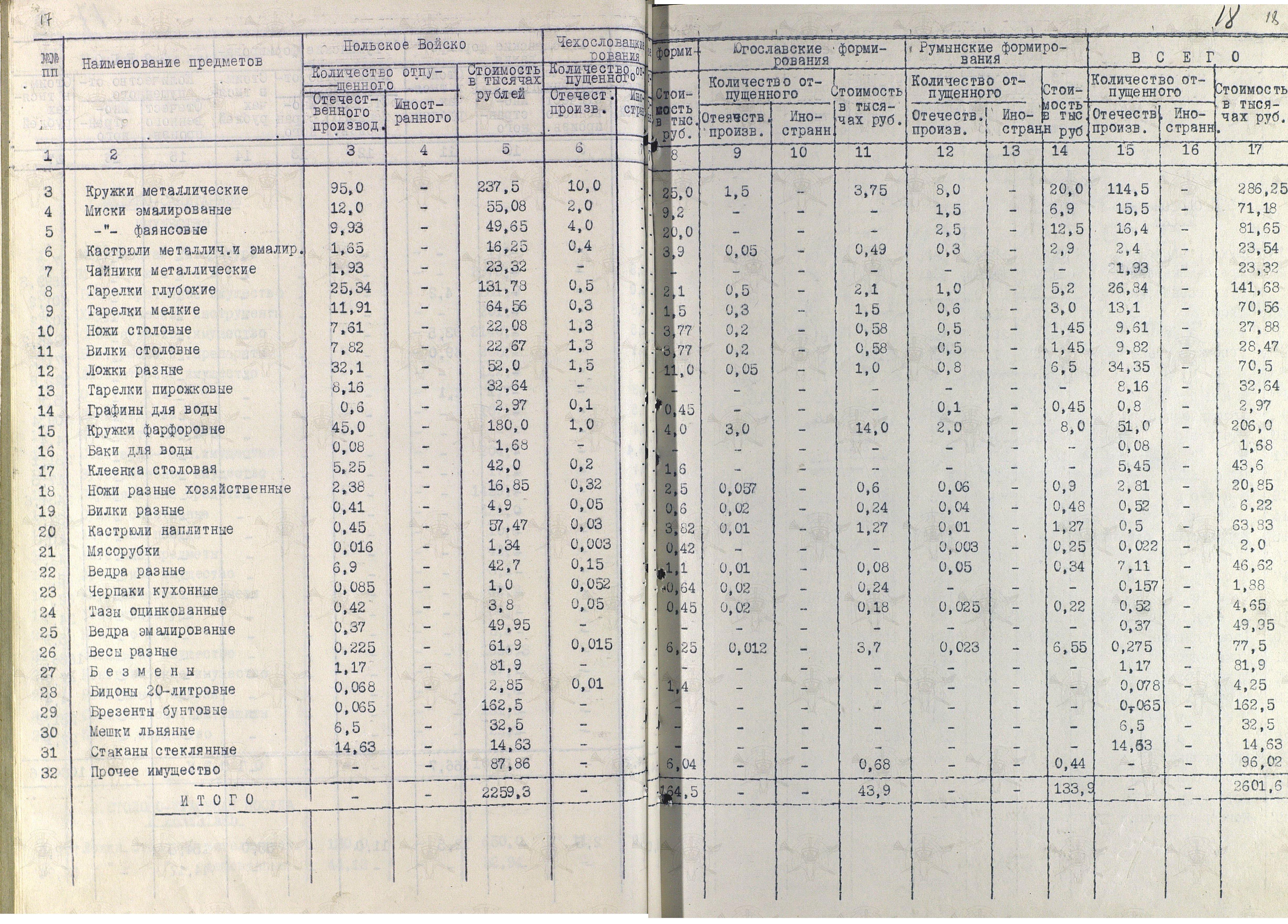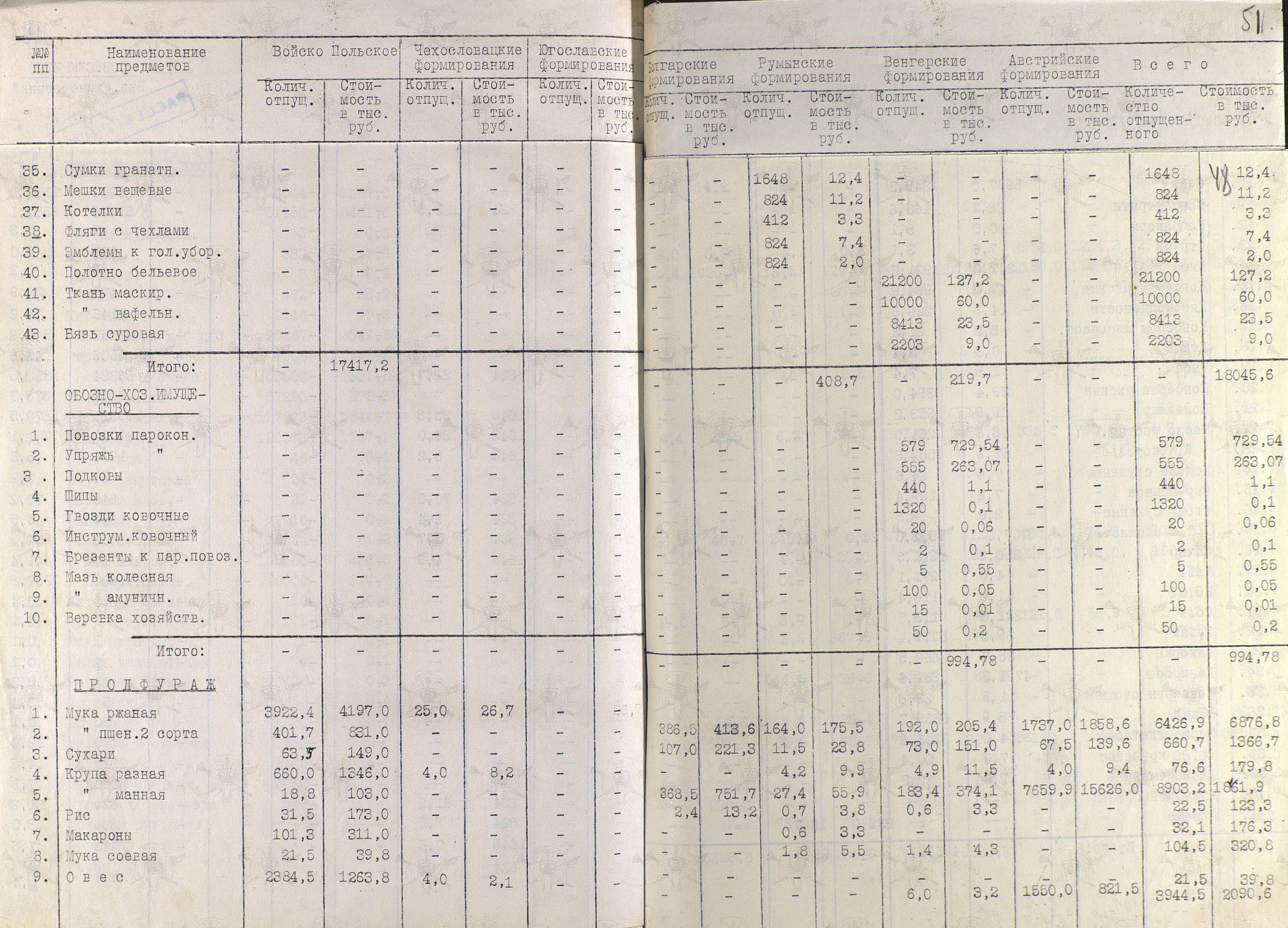Сразу хочу сказать, что документ - многостраничный, в реальности представляет собой подобие книги учёта, со сводными данными за период от начала формирования и по 1 января 1945 г. и ежемесячные данные по каждой стране. Расход материальных средств считался по каждой службе и видам матсредств отдельно, а именно: