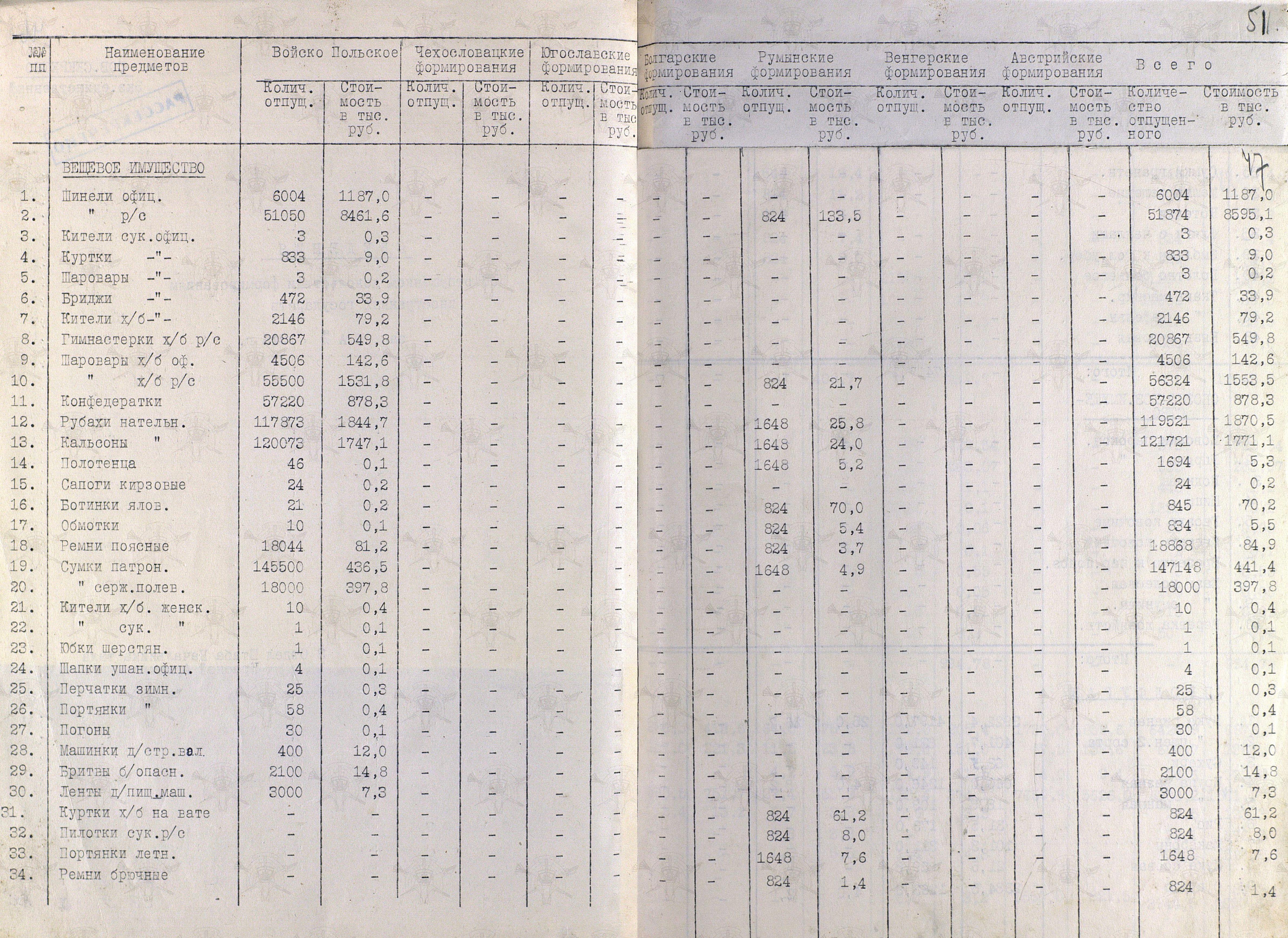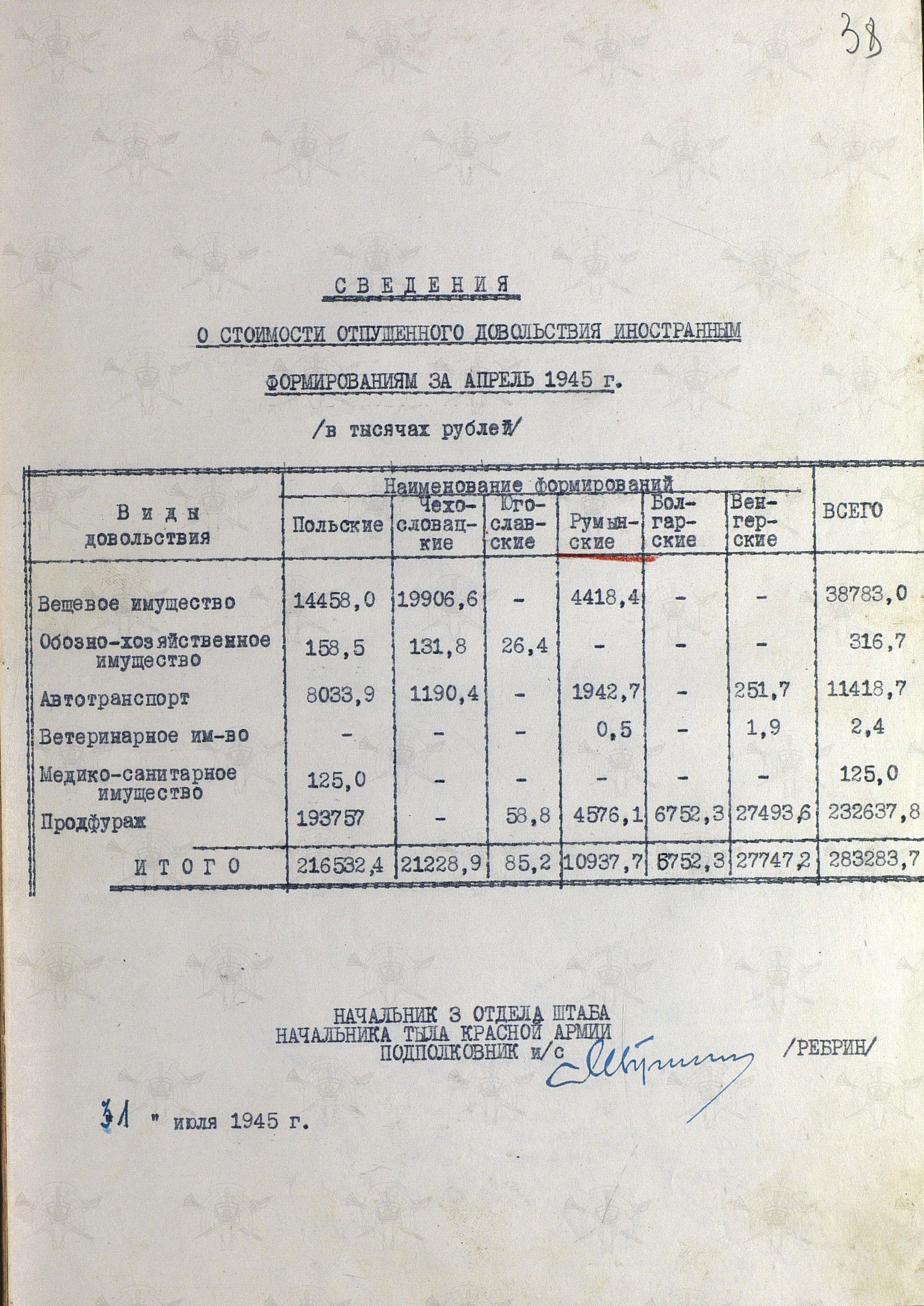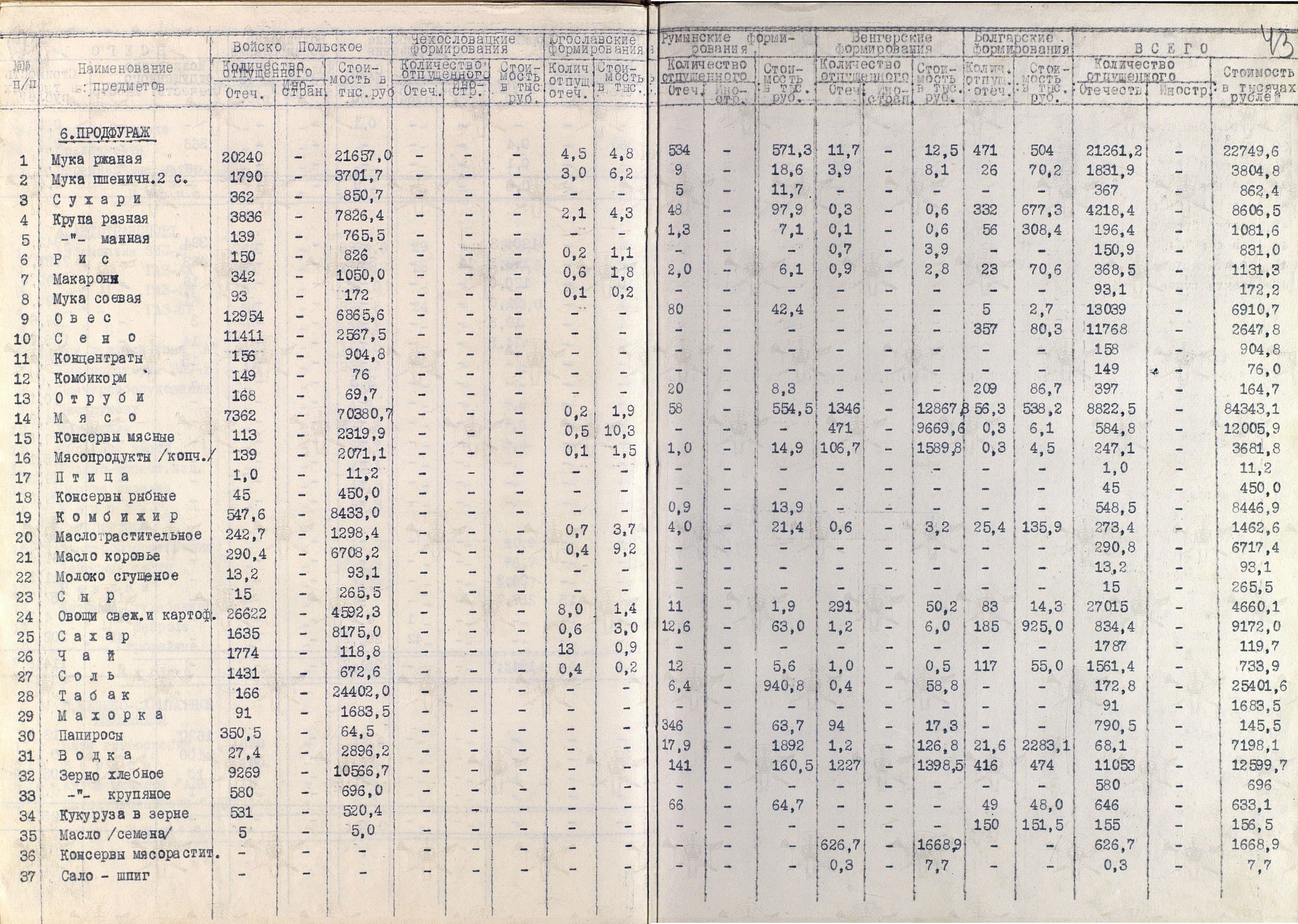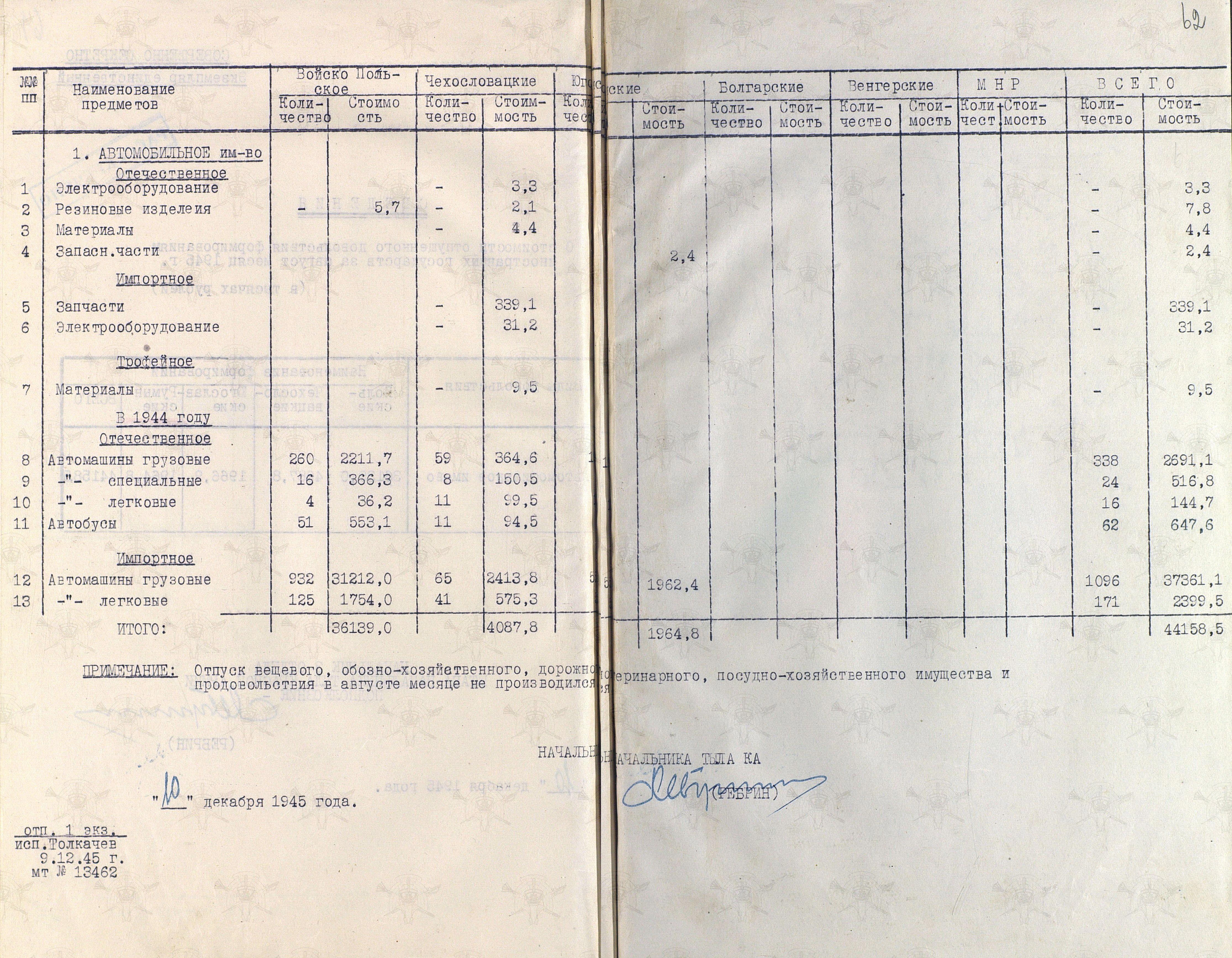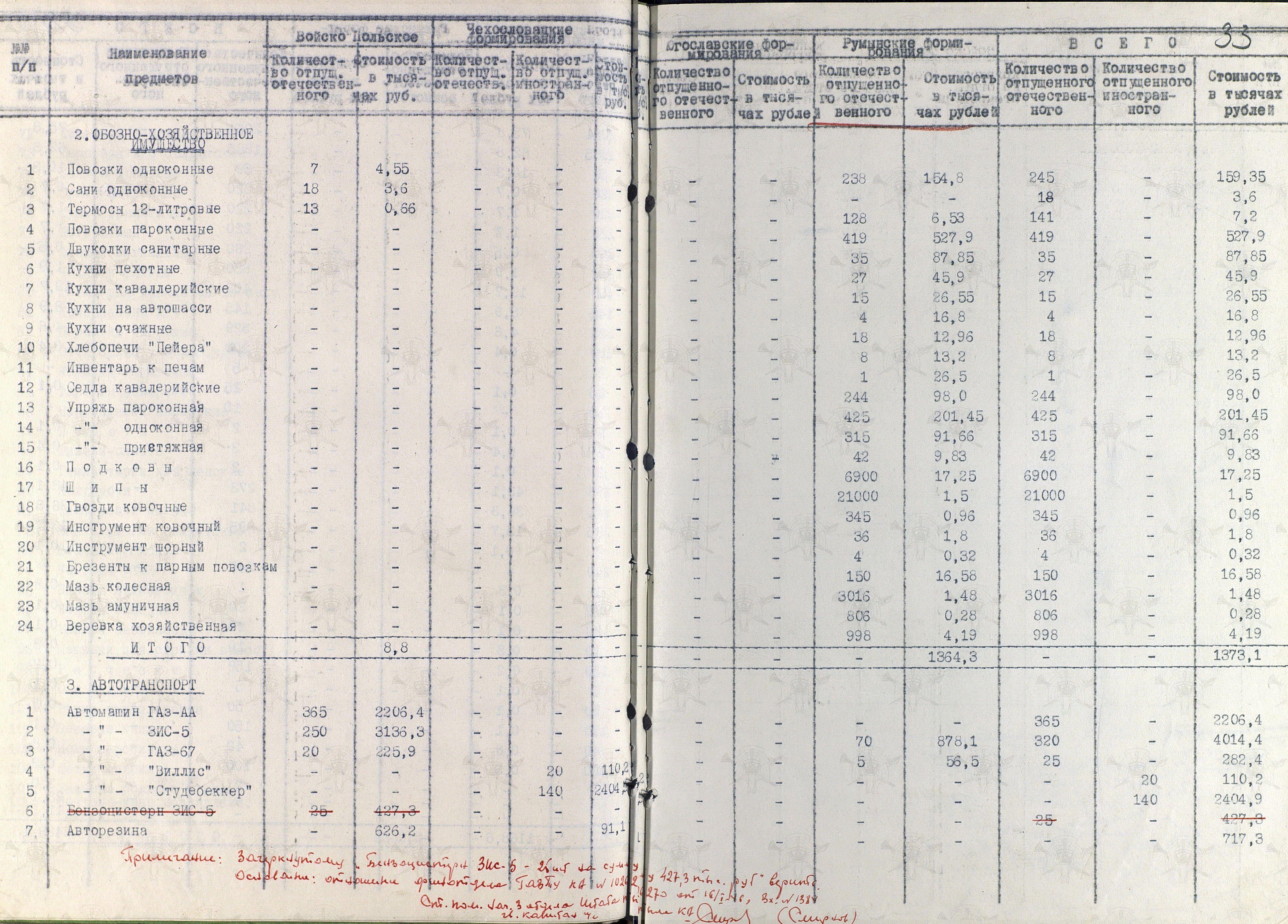 Сразу хочу сказать, что документ - многостраничный, в реальности представляет собой подобие книги учёта, со сводными данными за период от начала формирования и по 1 января 1945 г. и ежемесячные данные по каждой стране. Расход материальных средств считался по каждой службе и видам матсредств отдельно, а именно: