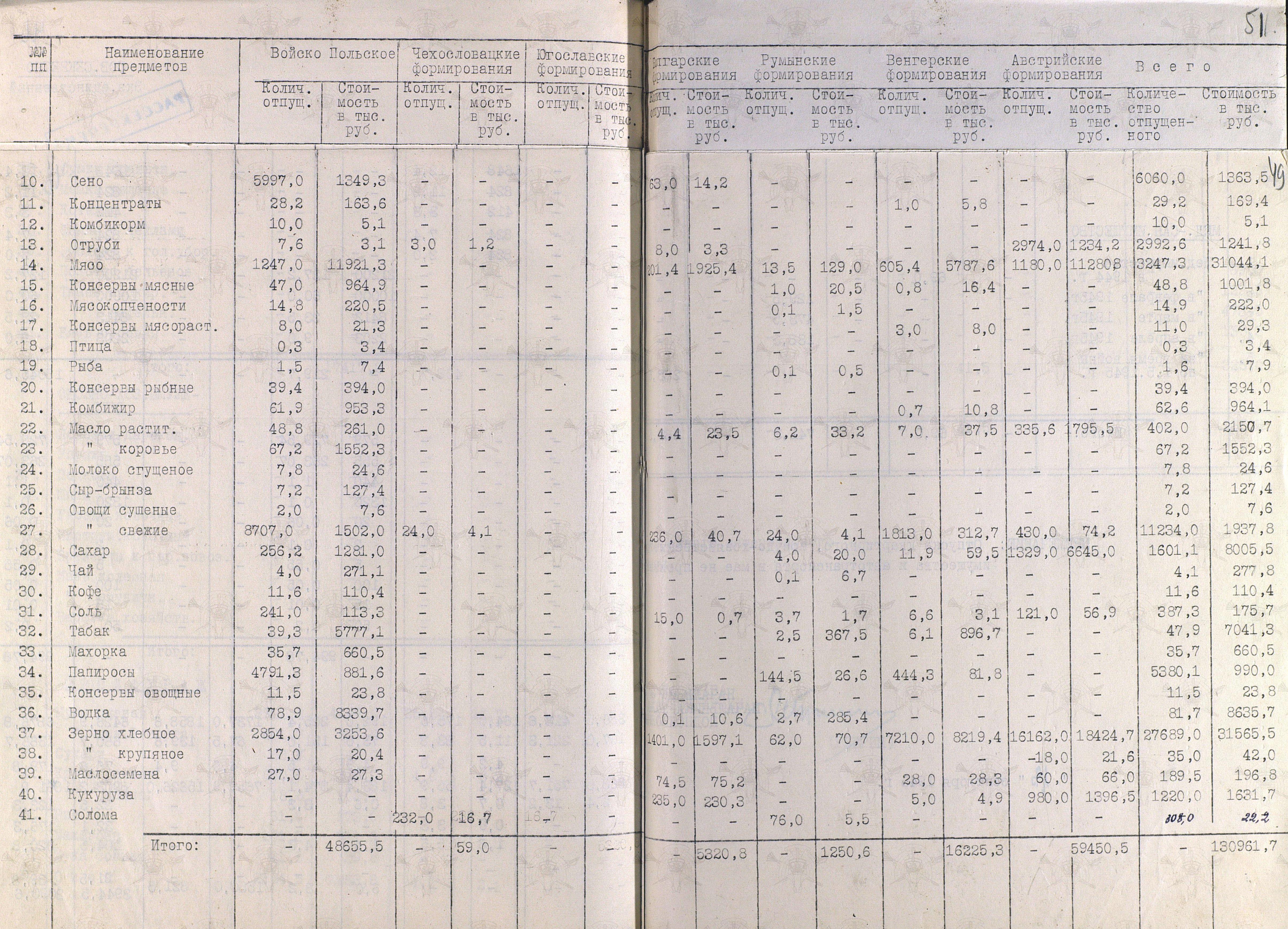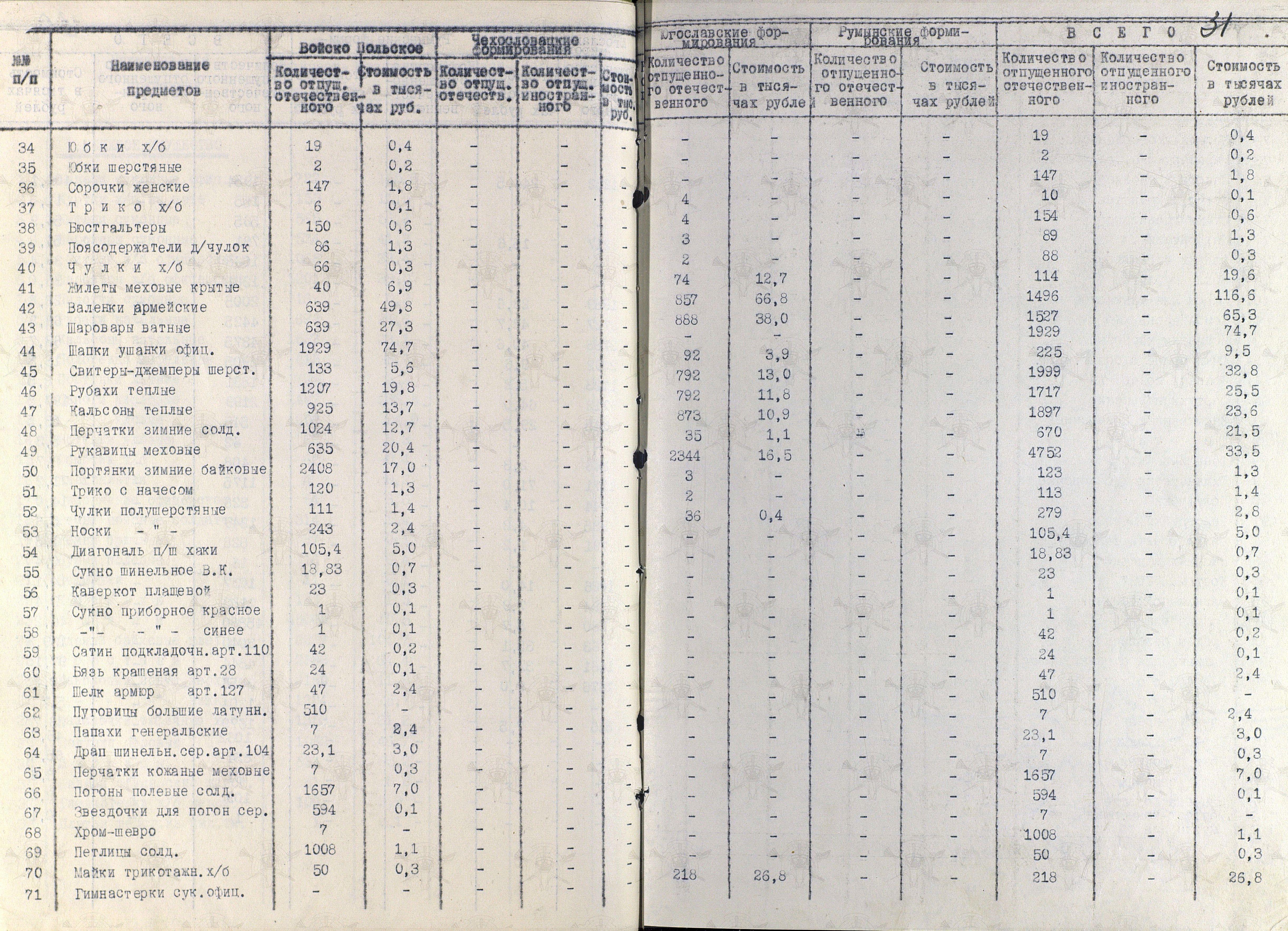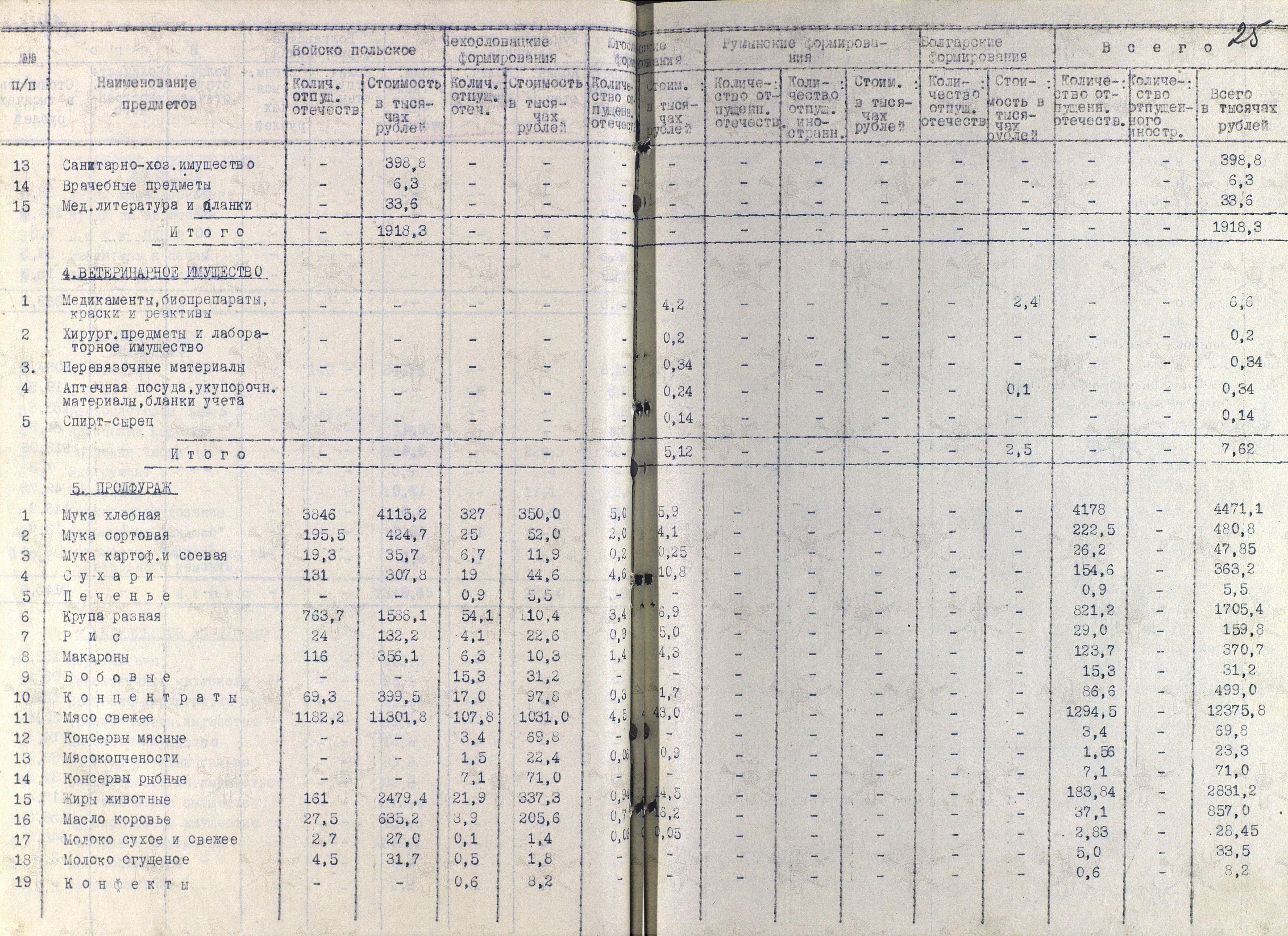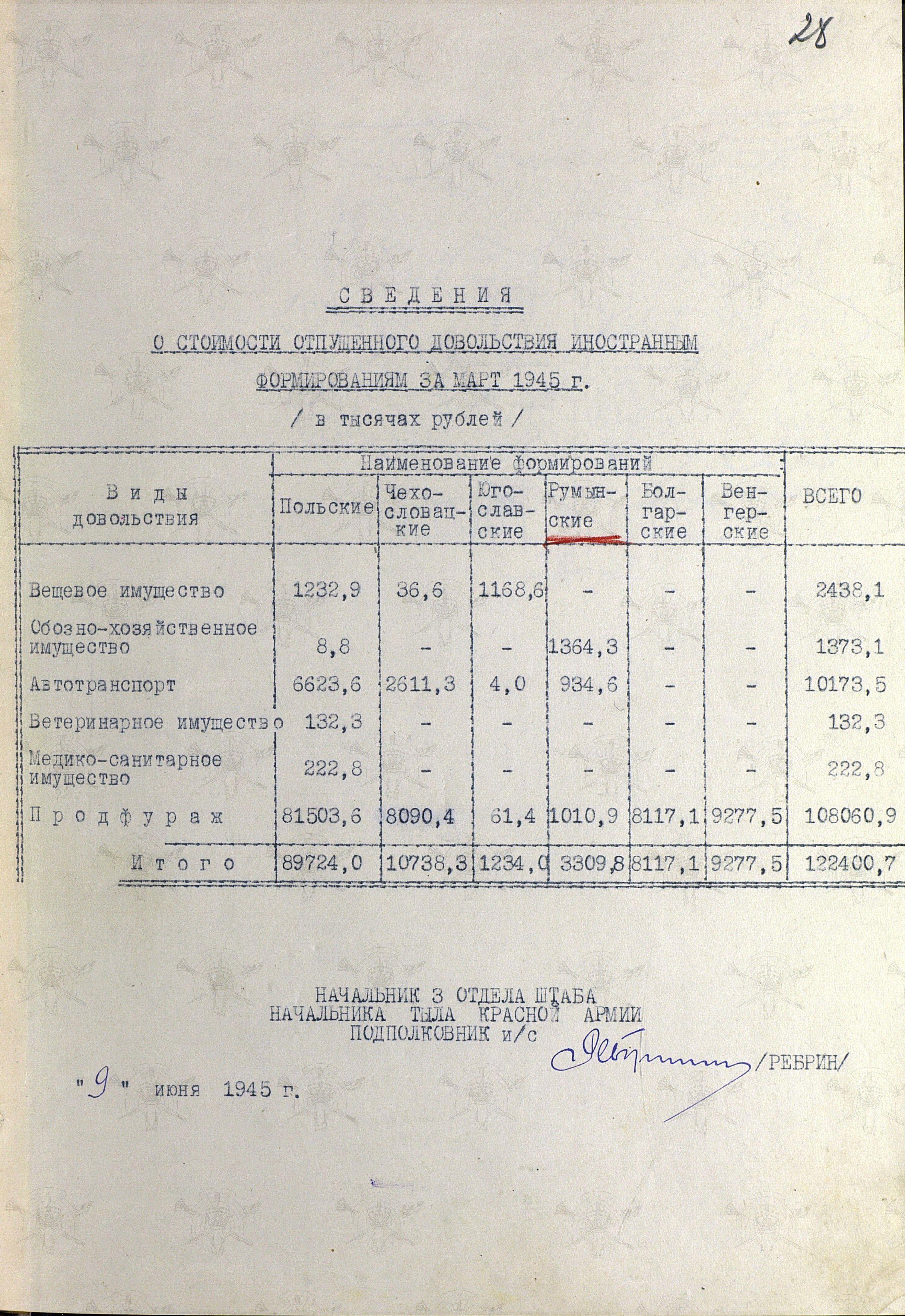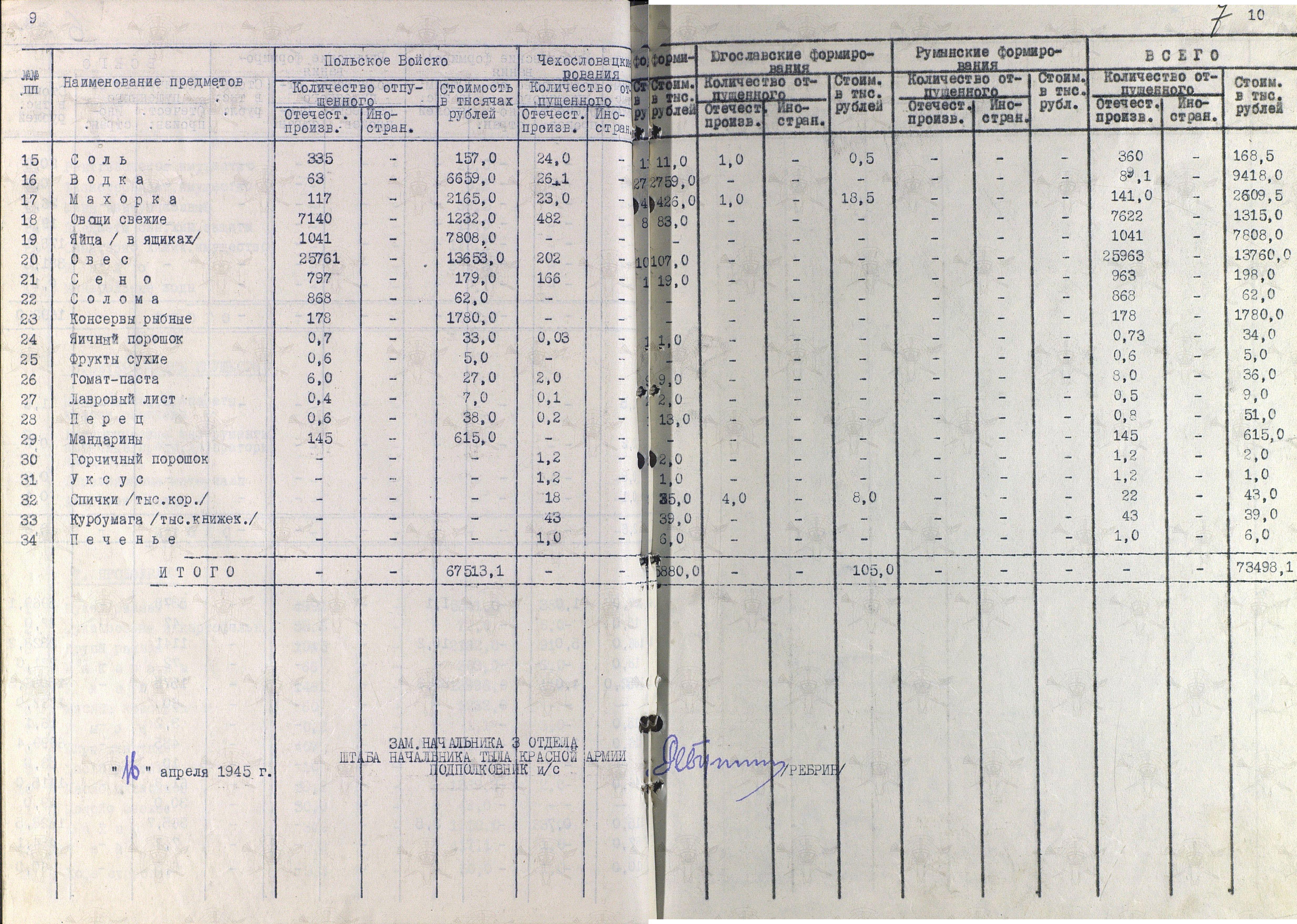 Сразу хочу сказать, что документ - многостраничный, в реальности представляет собой подобие книги учёта, со сводными данными за период от начала формирования и по 1 января 1945 г. и ежемесячные данные по каждой стране. Расход материальных средств считался по каждой службе и видам матсредств отдельно, а именно: