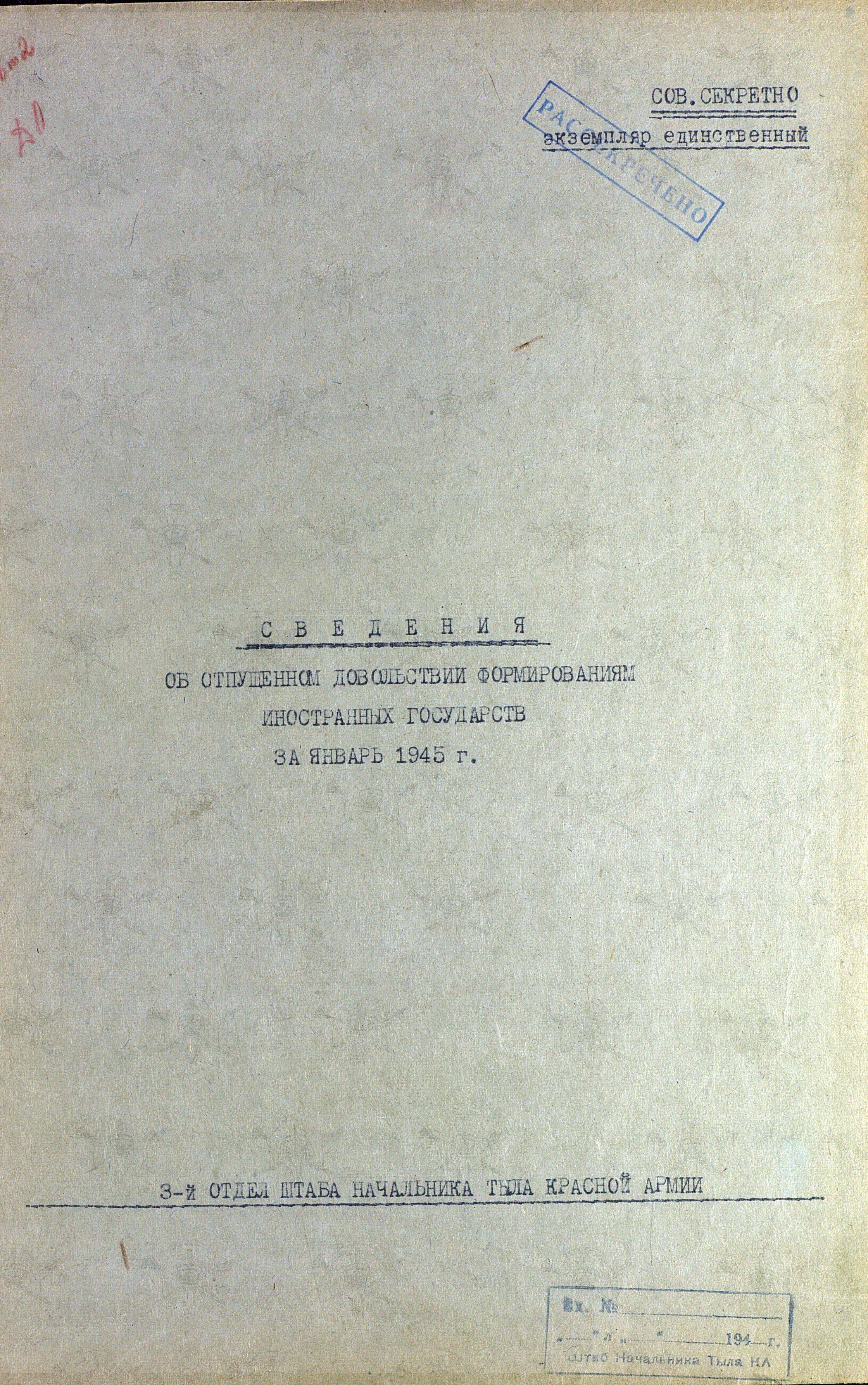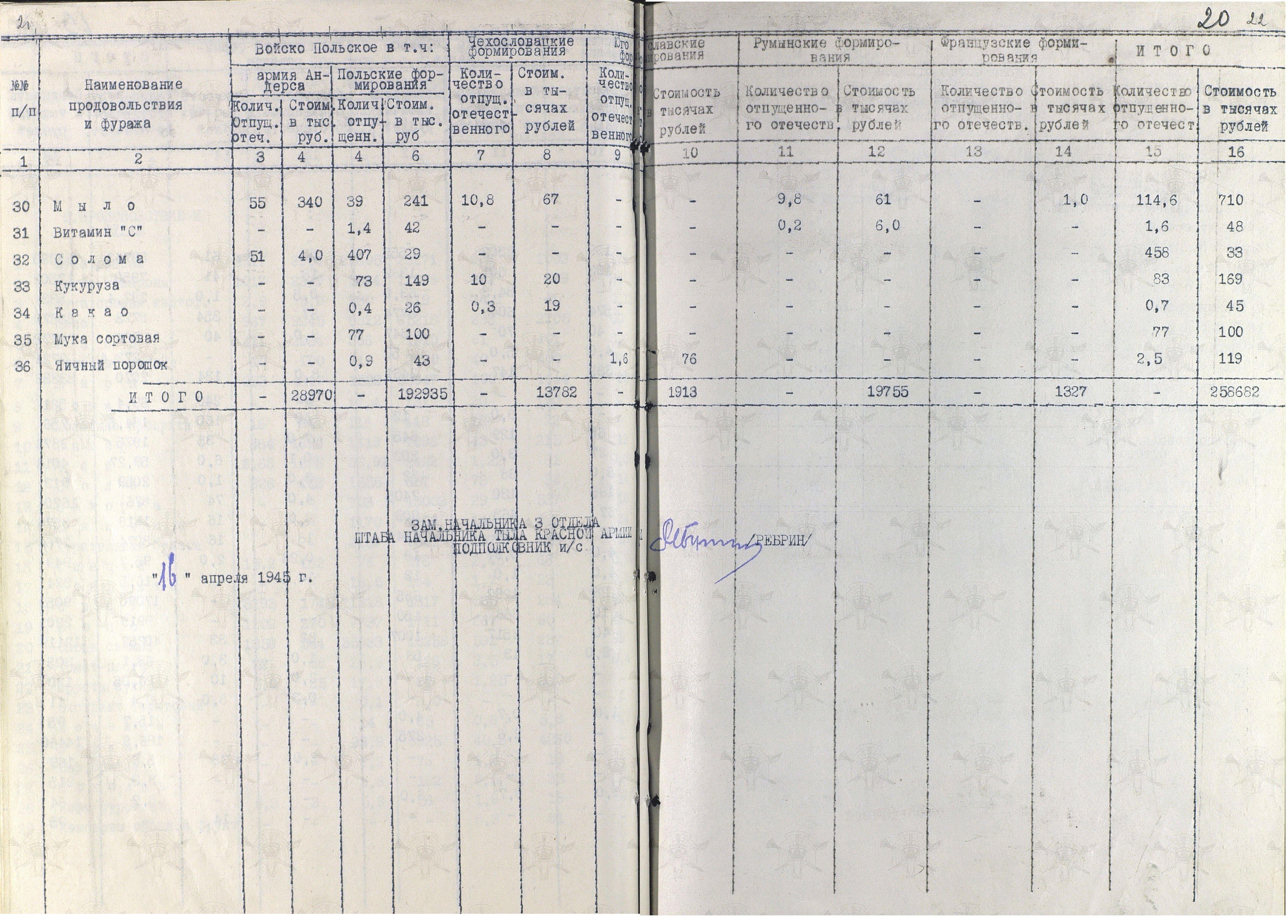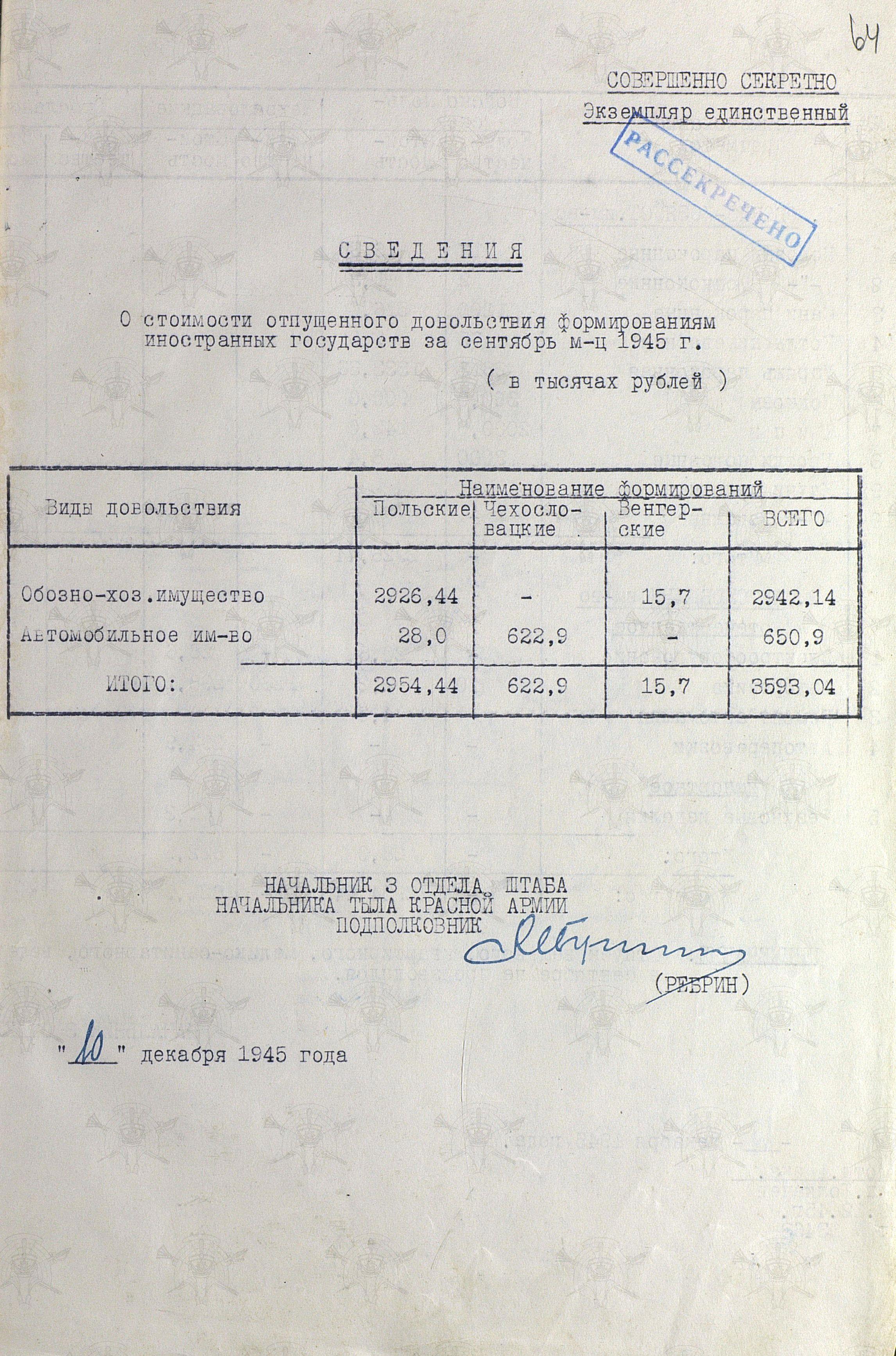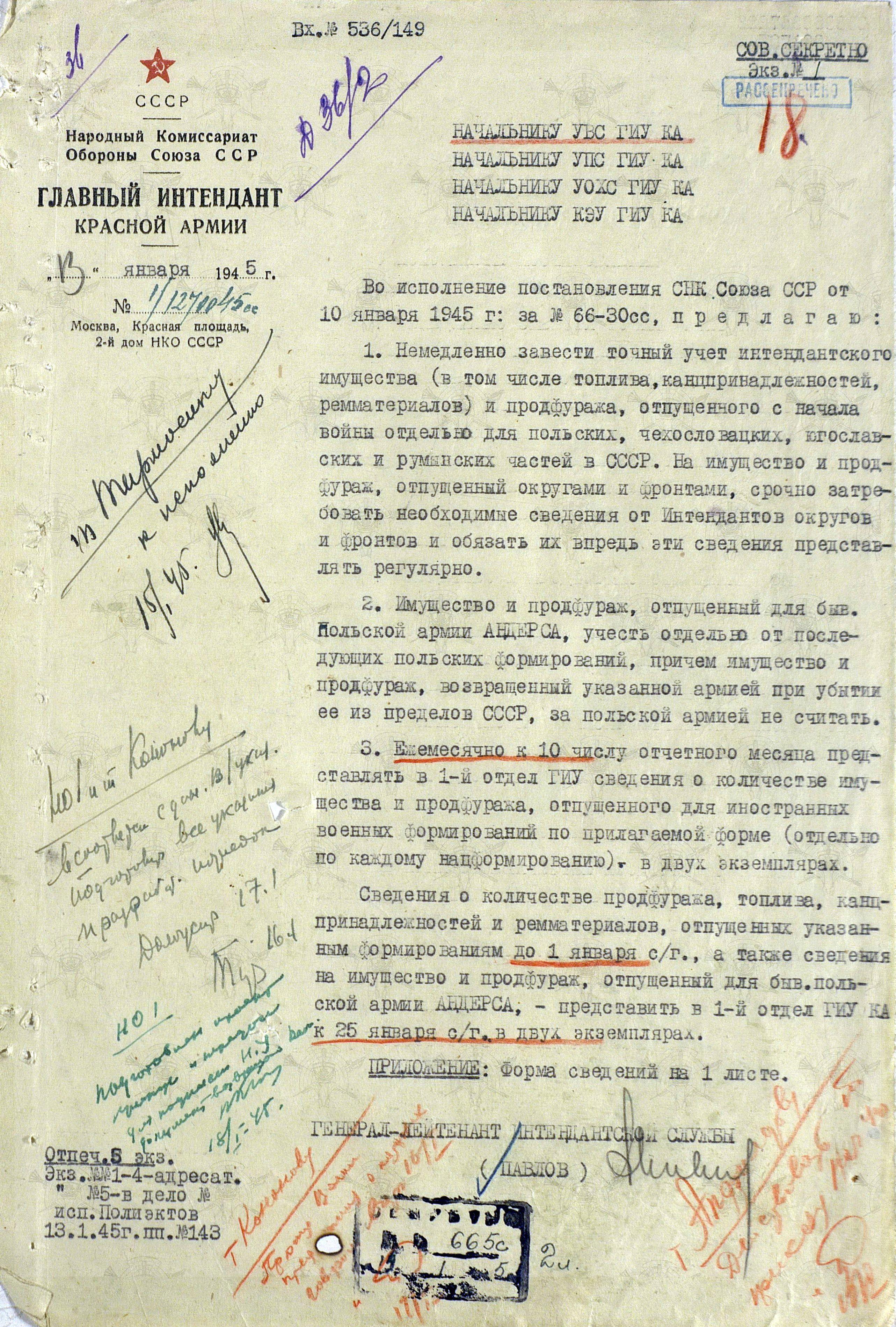Ещё один документ был подписан Главным Интендантом Красной Армии 13 января 1945 г. В соответствии с ним, учет имущества и продфуража, отпущенных для бывшей армии Андерса должен был вестись отдельно от последующих польских формирования, при этом и итоговые сведения по этой армии оформлялись отдельным документом.