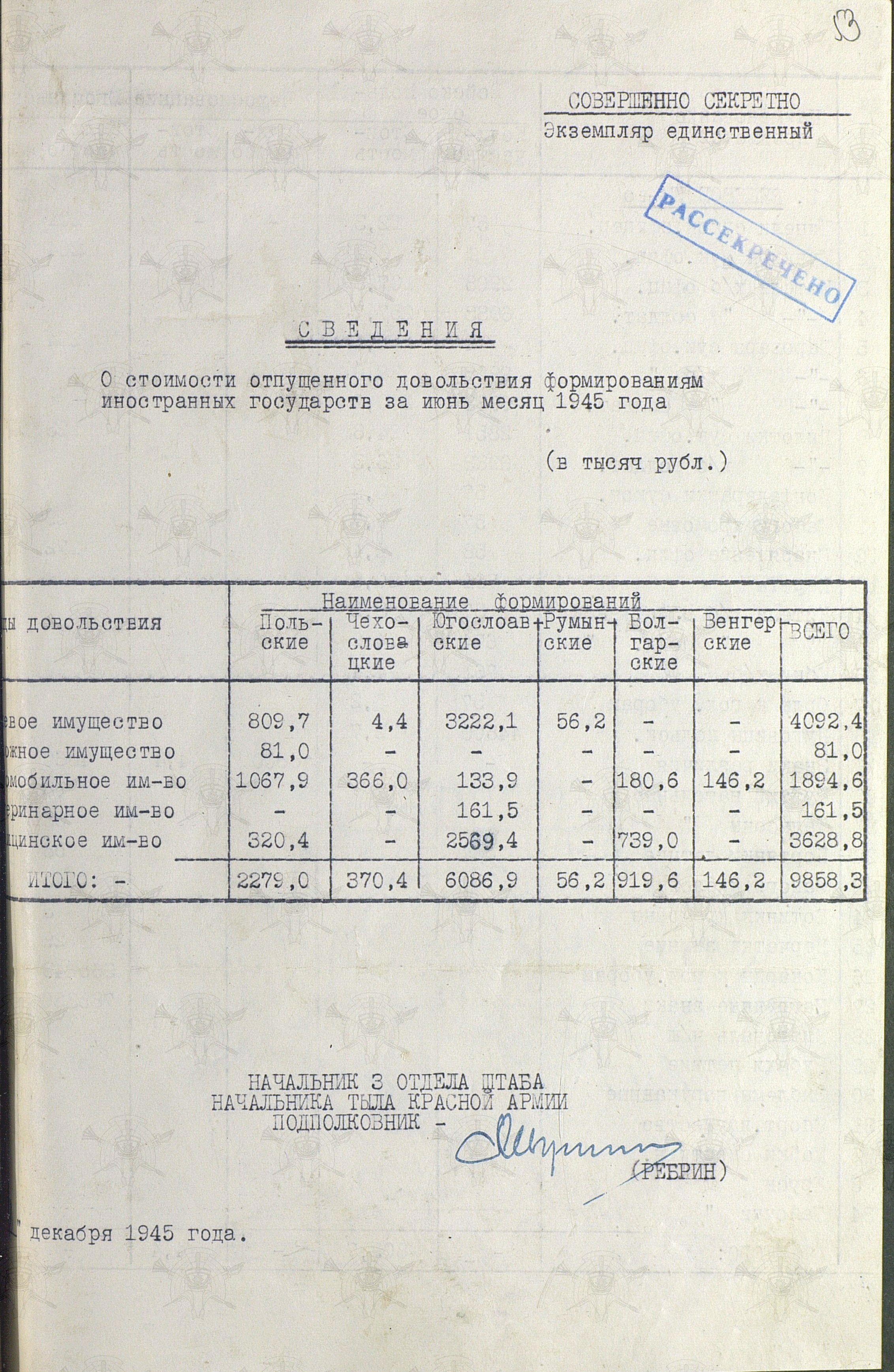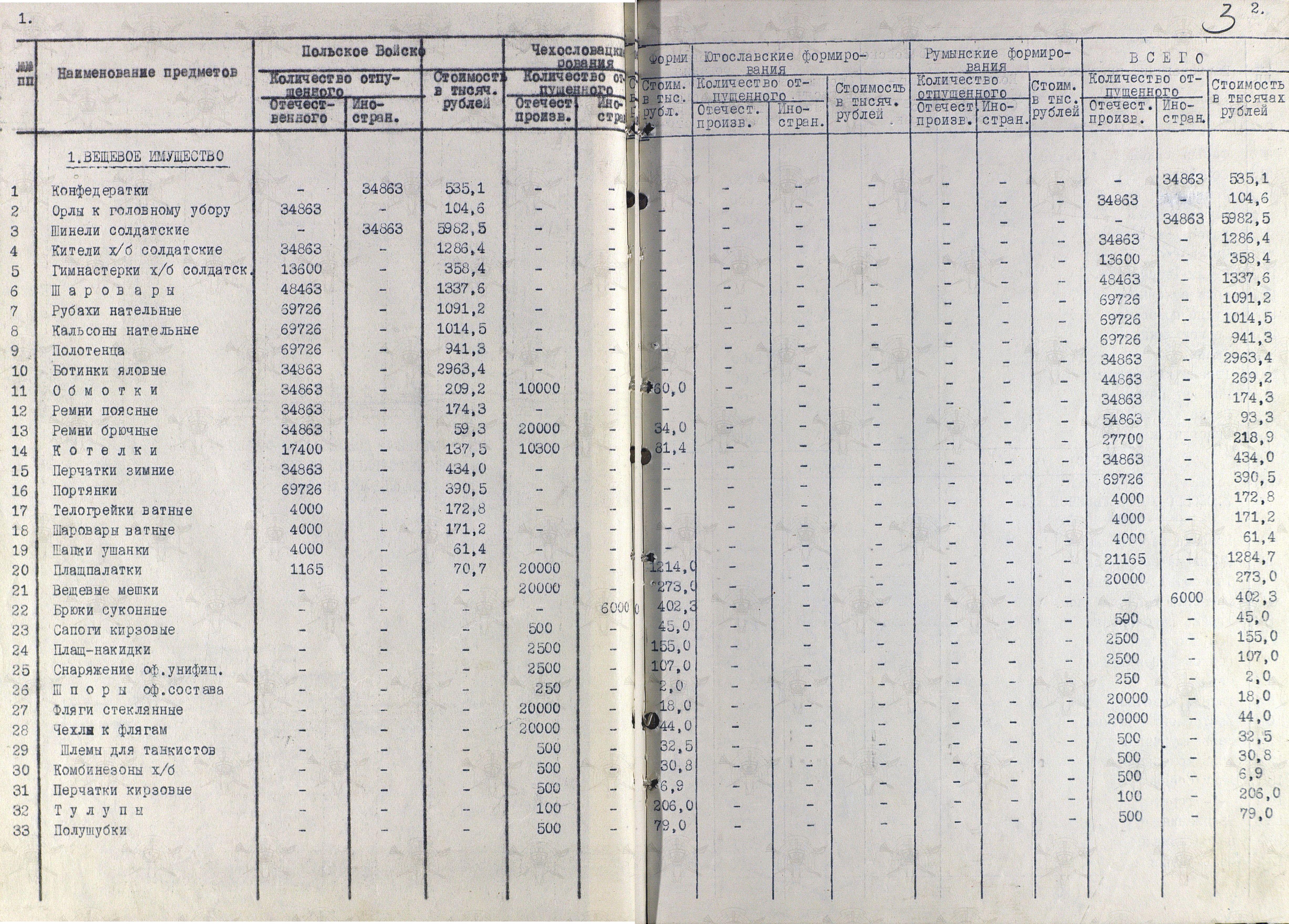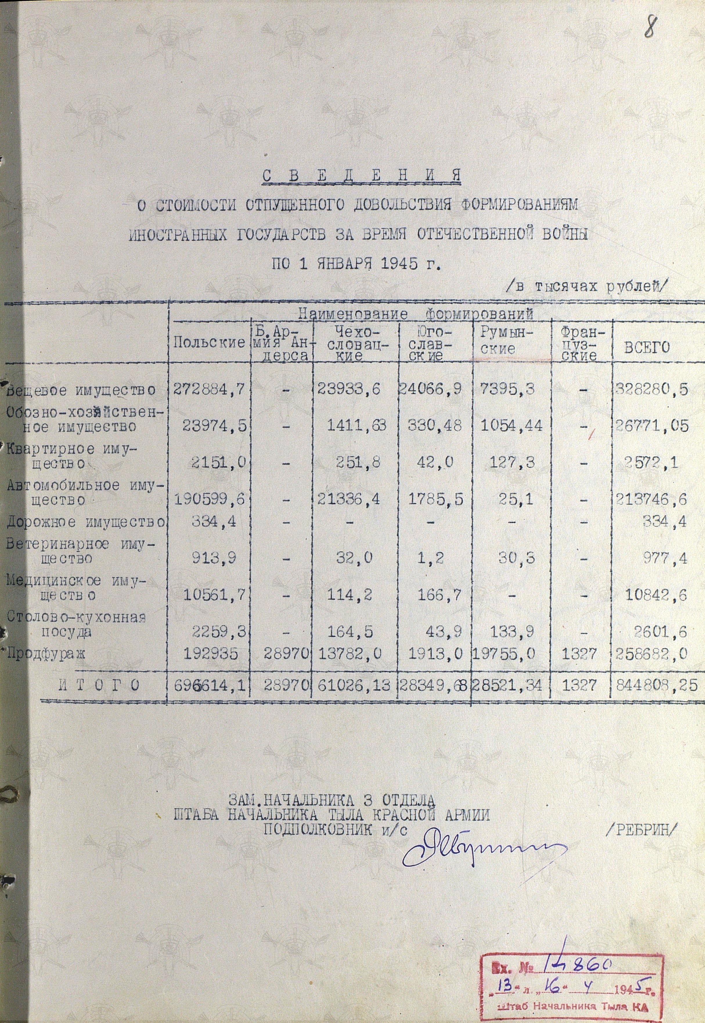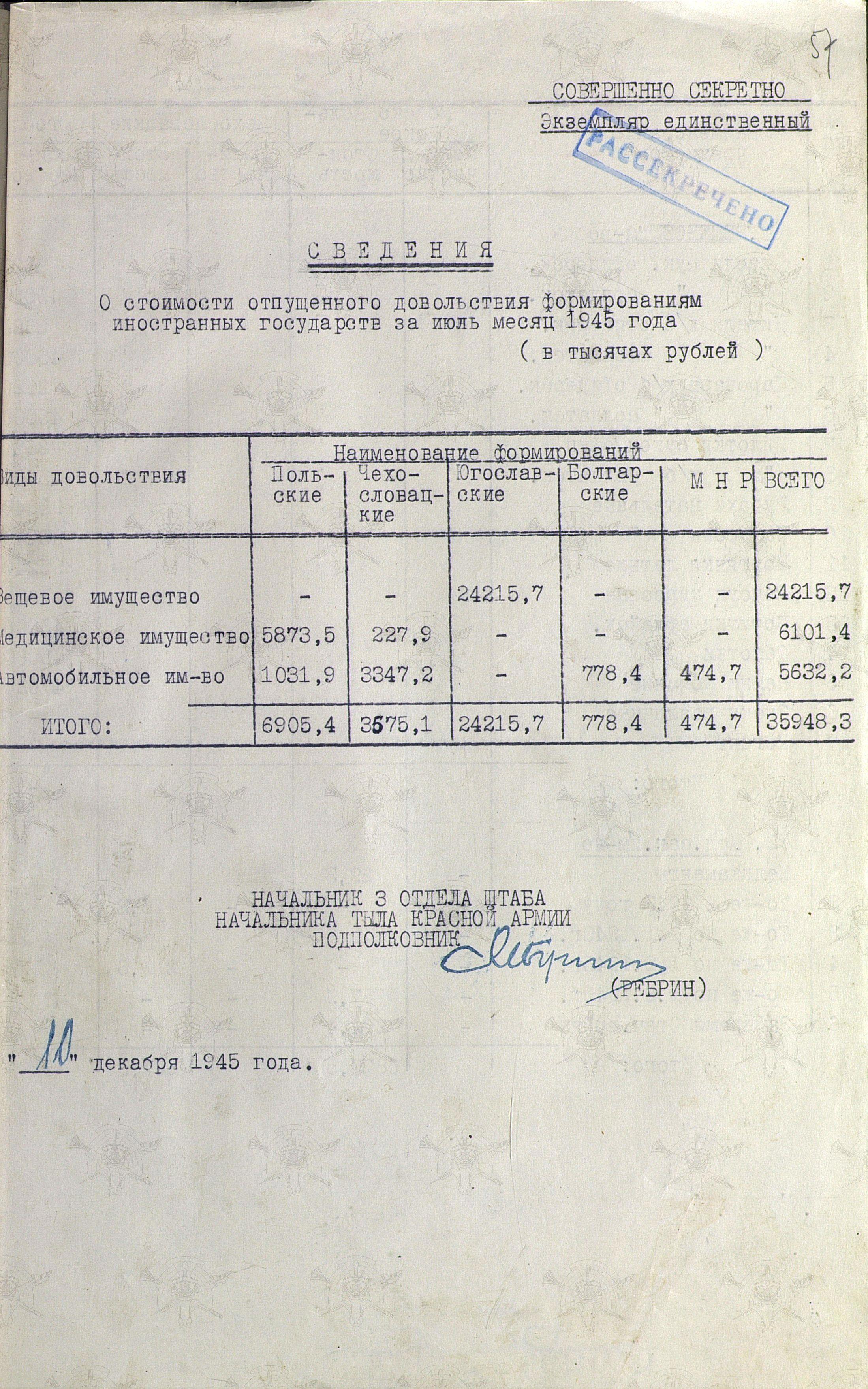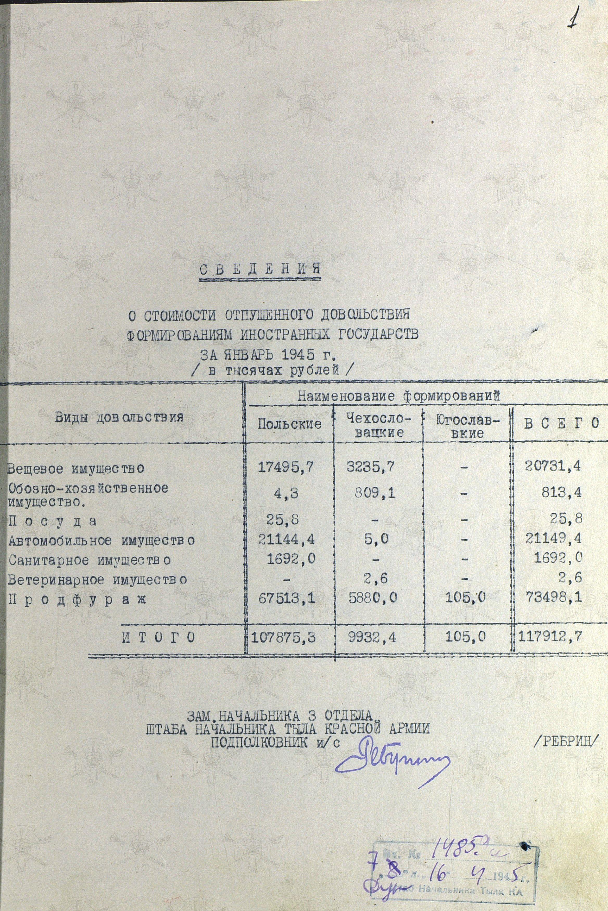 Ещё один документ был подписан Главным Интендантом Красной Армии 13 января 1945 г. В соответствии с ним, учет имущества и продфуража, отпущенных для бывшей армии Андерса должен был вестись отдельно от последующих польских формирования, при этом и итоговые сведения по этой армии оформлялись отдельным документом.