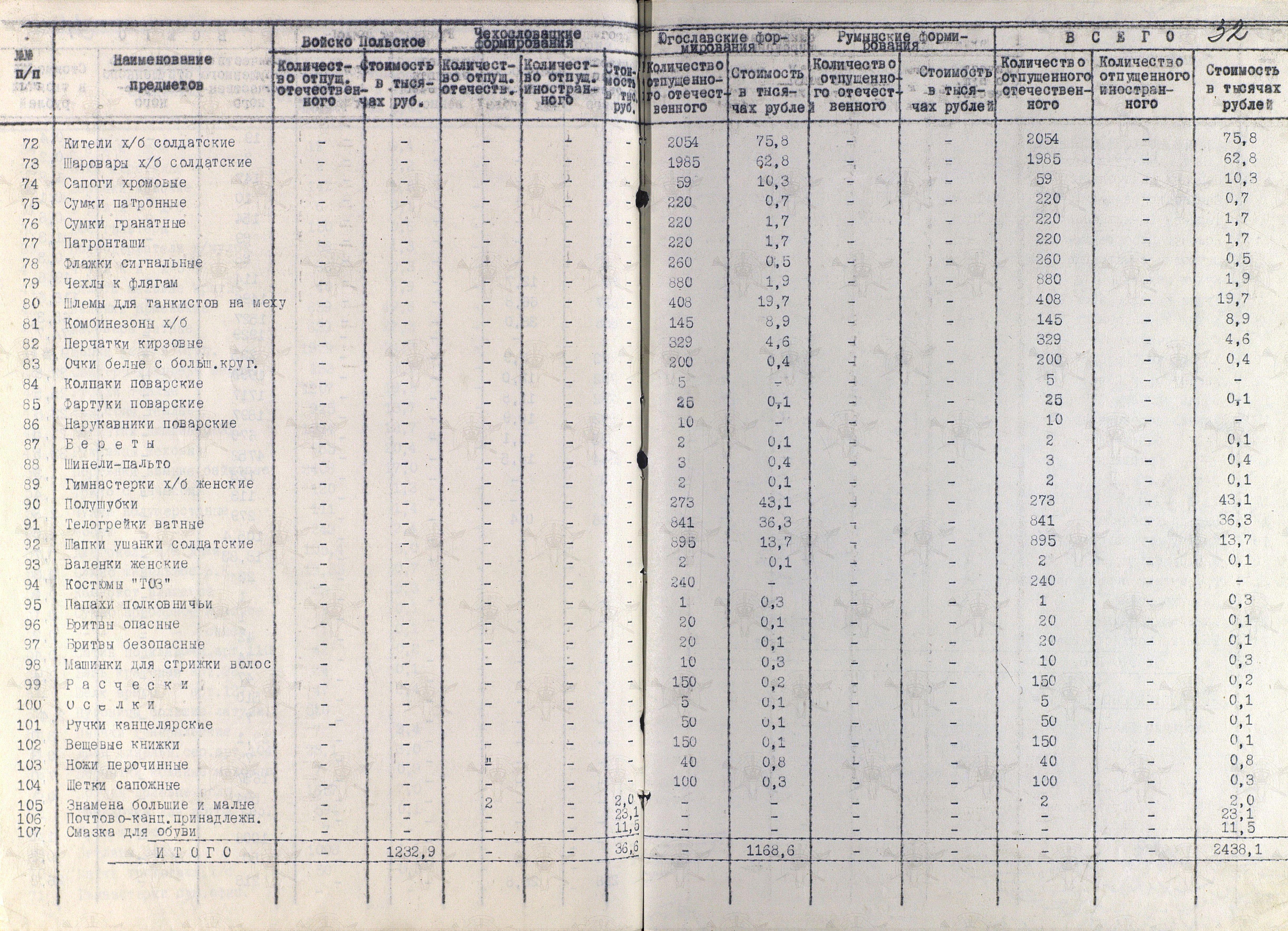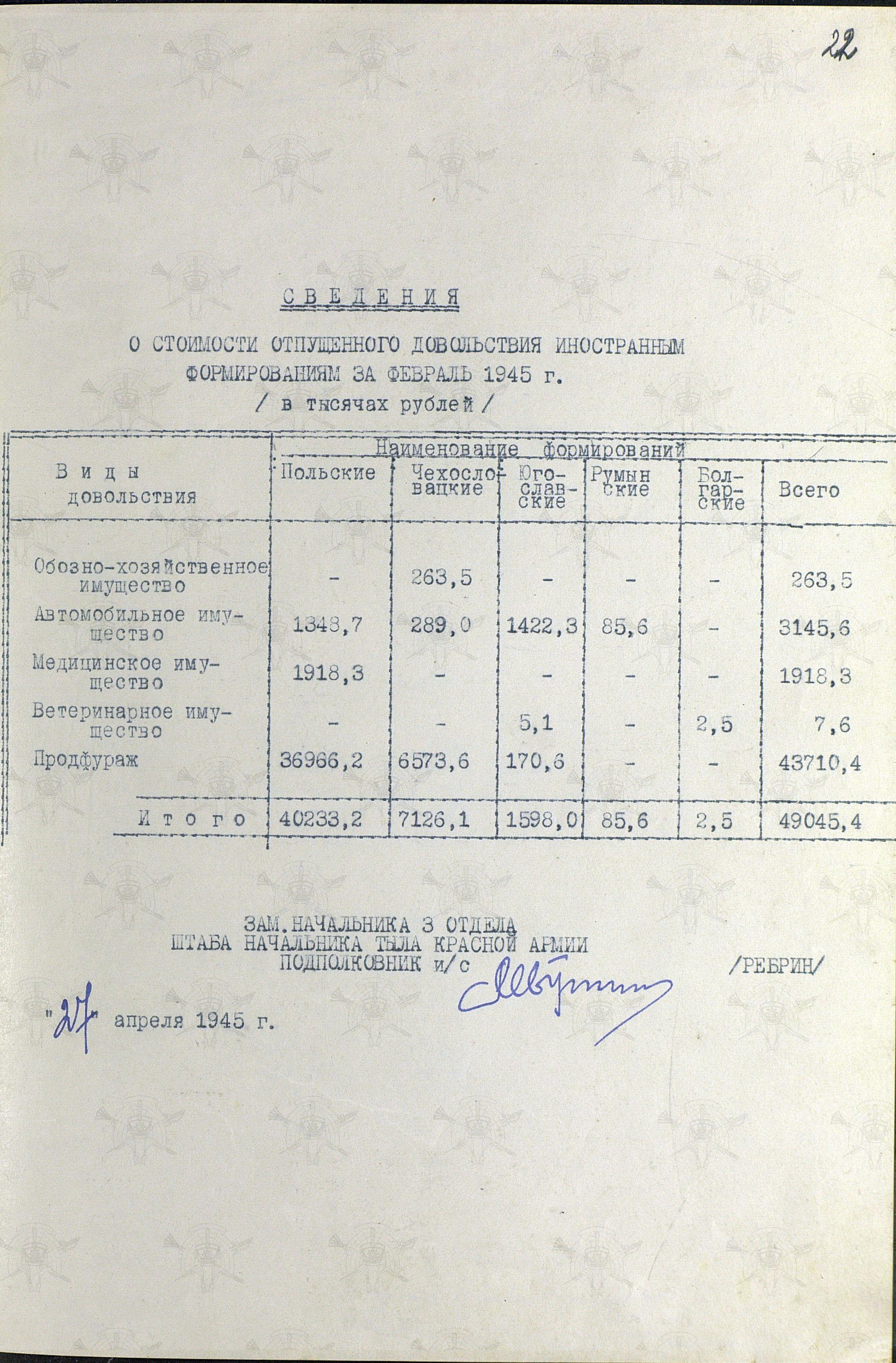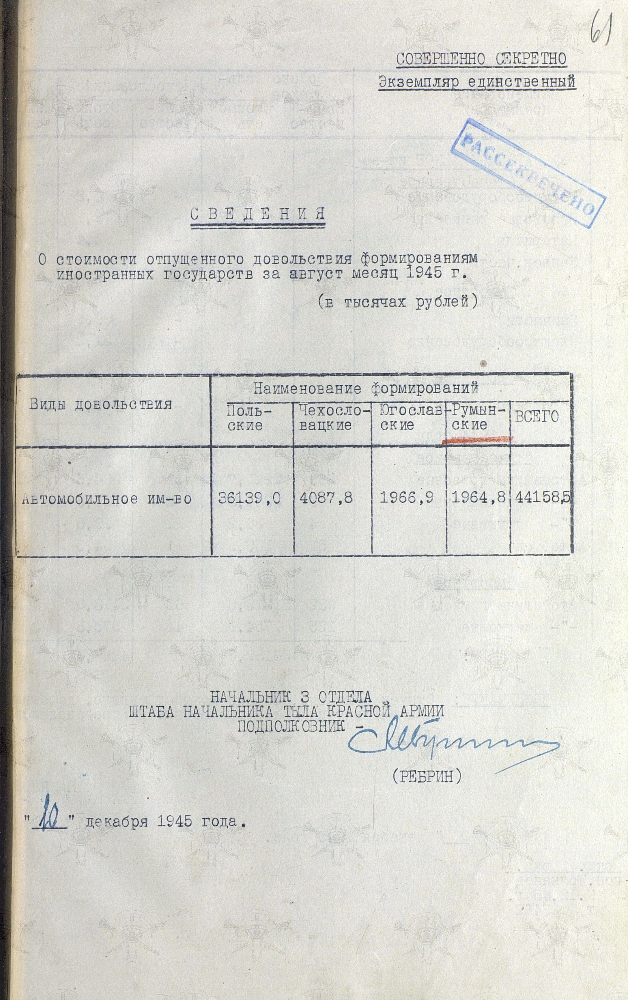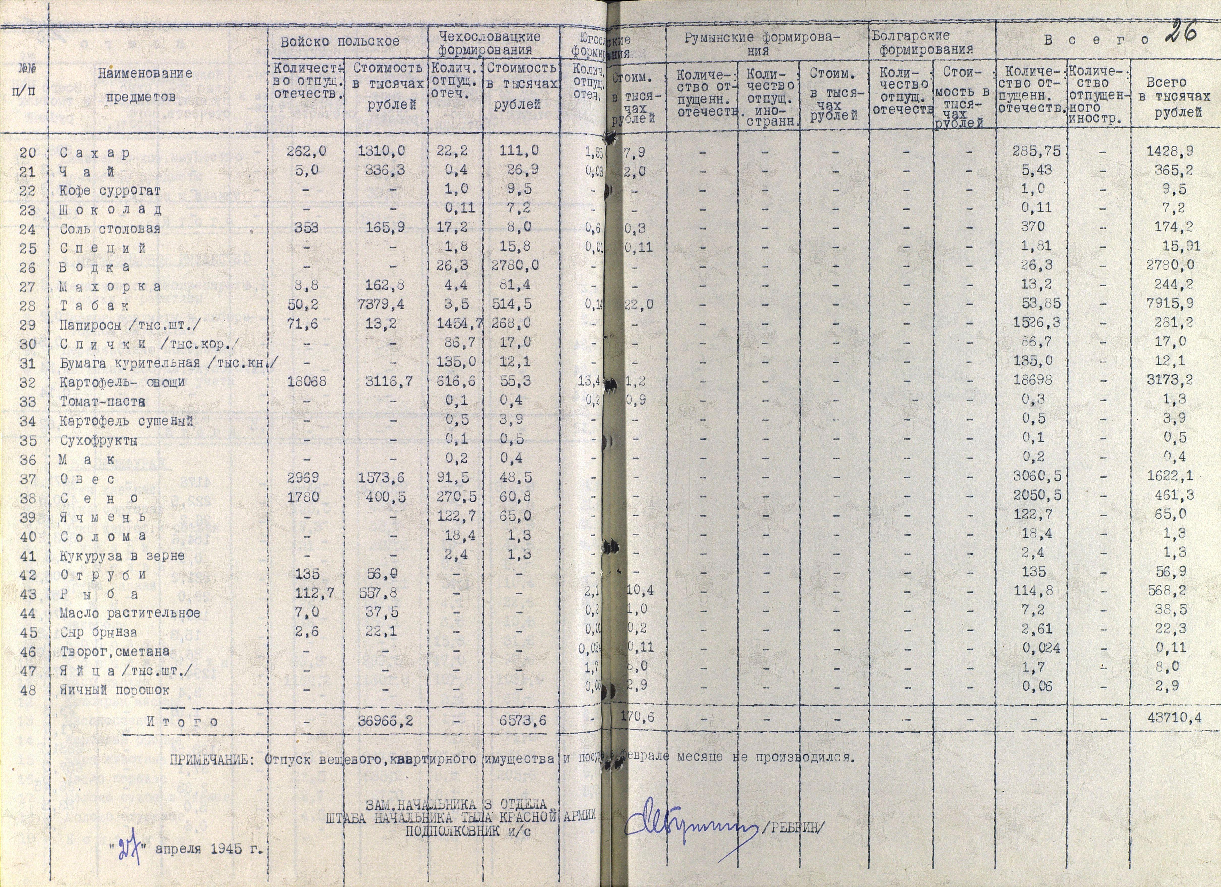 Ещё один документ был подписан Главным Интендантом Красной Армии 13 января 1945 г. В соответствии с ним, учет имущества и продфуража, отпущенных для бывшей армии Андерса должен был вестись отдельно от последующих польских формирования, при этом и итоговые сведения по этой армии оформлялись отдельным документом.
