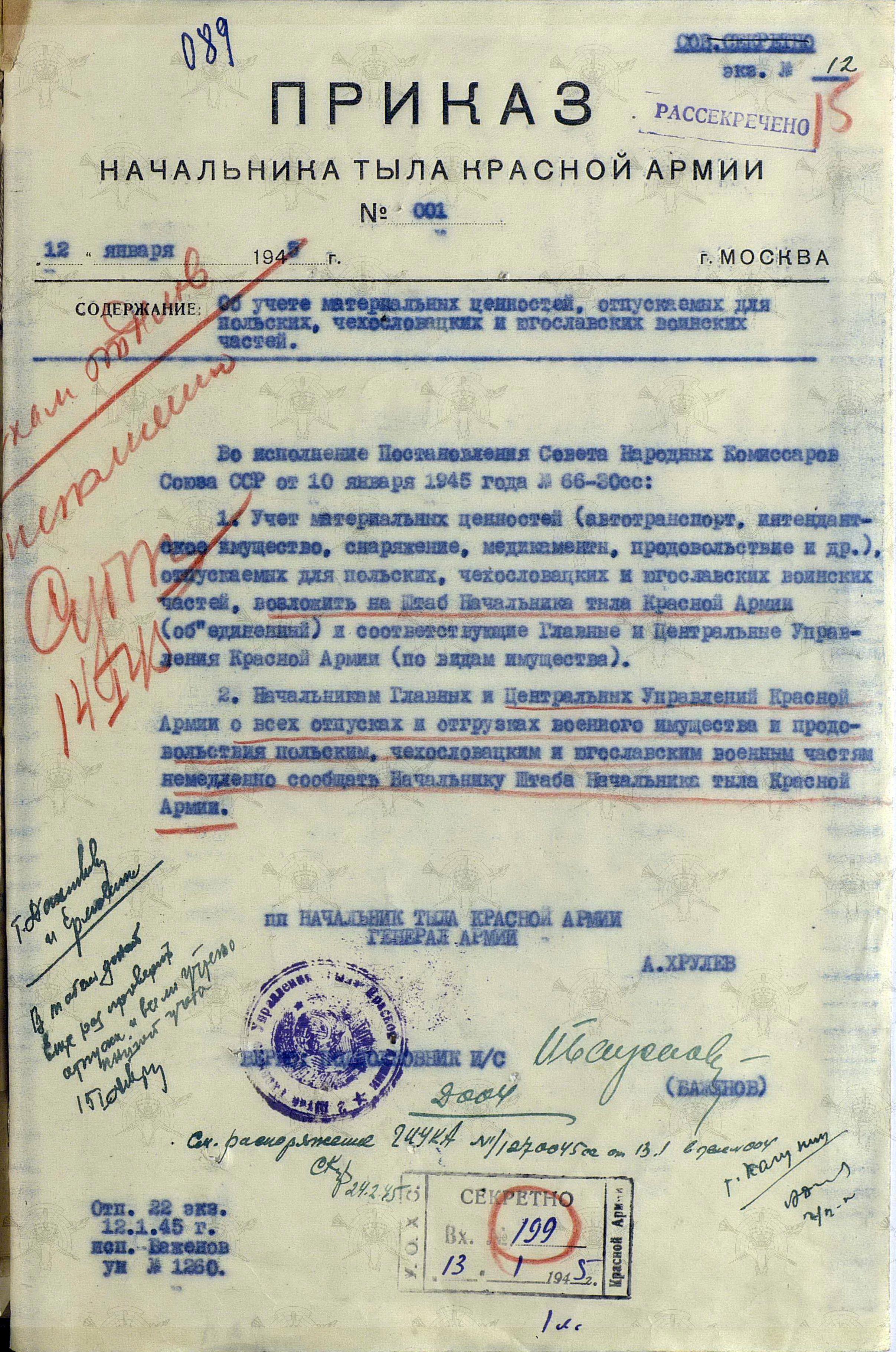Приказ Начальника Тыла Красной Армии от 12.01.1945 г. № 001 «Об учете материальных ценностей, отпускаемых для польских, чехословацких и югославских воинских частей».