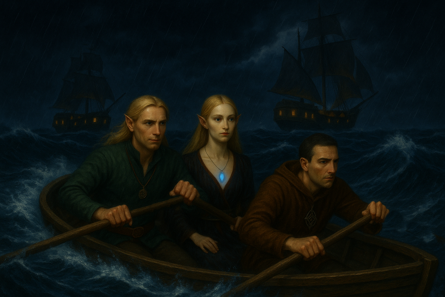 Освободив лодку, Крид и эльфы начали опускать её на верёвках в воду. Корабль покачивало на волнах, которые становились всё больше, и от этого лодка несколько раз с гулким звуком ударилась о борт. Оставалось лишь надеяться, что она осталась цела. Где-то на палубе послышались шипящие и щёлкающие звуки громкой речи ящеров, но поблизости никого не было. Крид молил Тариуса, чтобы так и продолжалось, и хозяева корабля лишь готовились к шторму, а не разыскивали беглецов. Опустив лодку на воду, беглецы начали спускаться. Первой вниз по веревке слетела Айриль. Ловко приземлившись, она махнула Криду. Священник сжал зубы, и, вцепившись в веревку, перелез через борт. Медленно спускаясь, он не смотрел вниз, но всё равно ощущал под собой большие волны, готовые поглотить его.