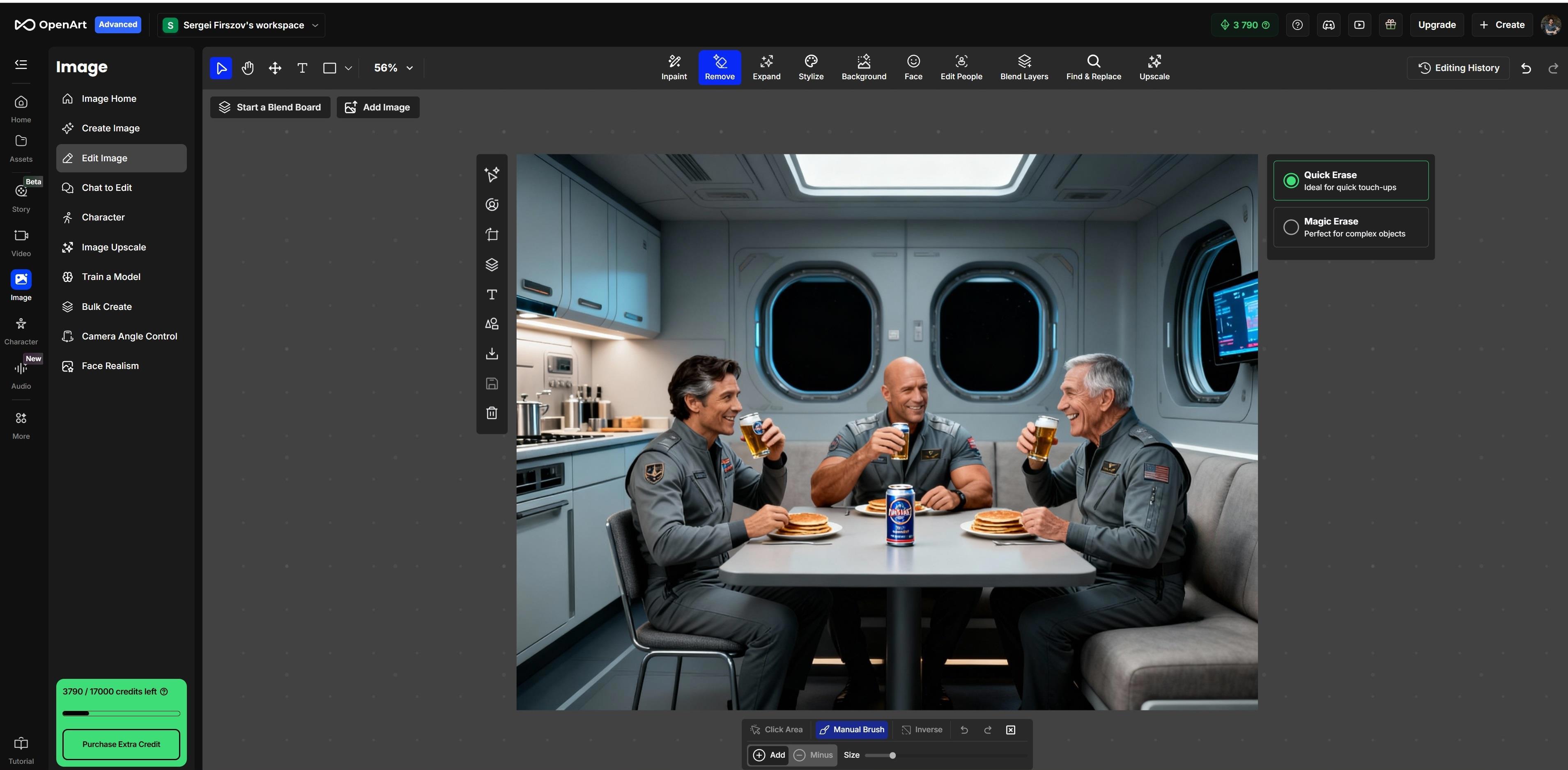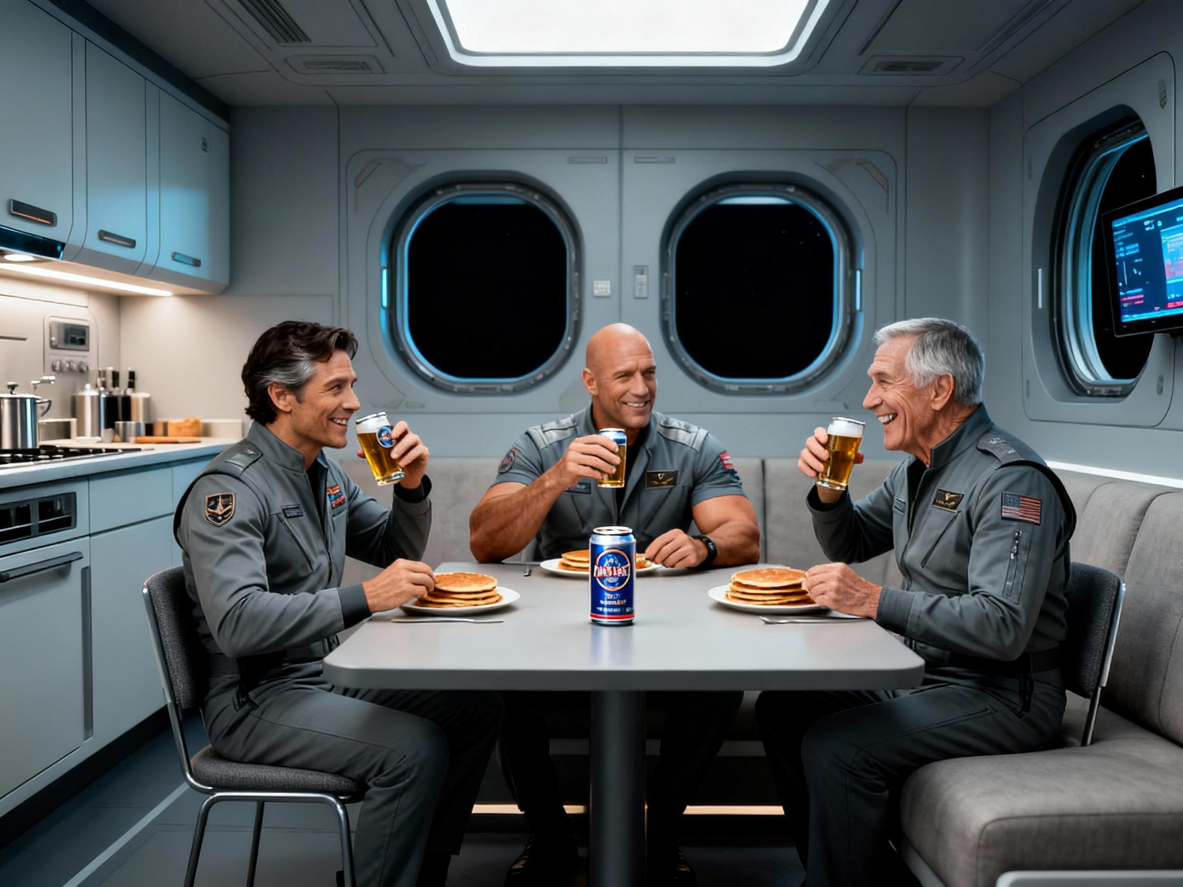 Здесь объединились три персонажа из романа "Звездные дальнобойщики" и там где я захотел ,с блинчиками и пивом.могут быть косяки.персонаж справа прямо на стуле вьехал в диван.:)))Но это устраняется легко в том же open art.