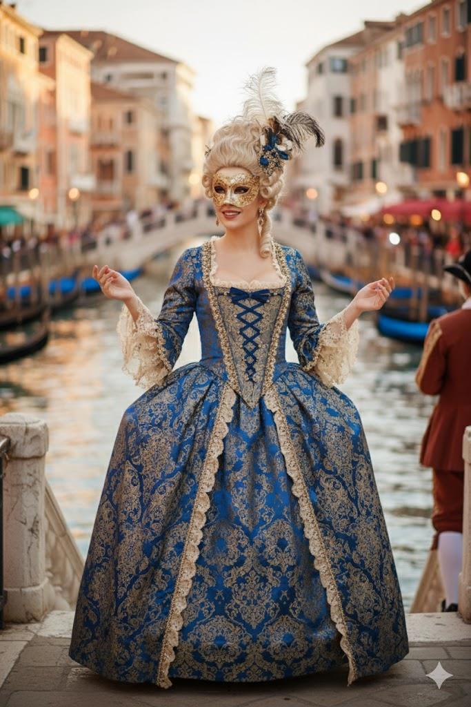 Я попросил переместить девушку в Венецию на карнавал и одеть в платье 18 века.Велосипед убрать.Результат: