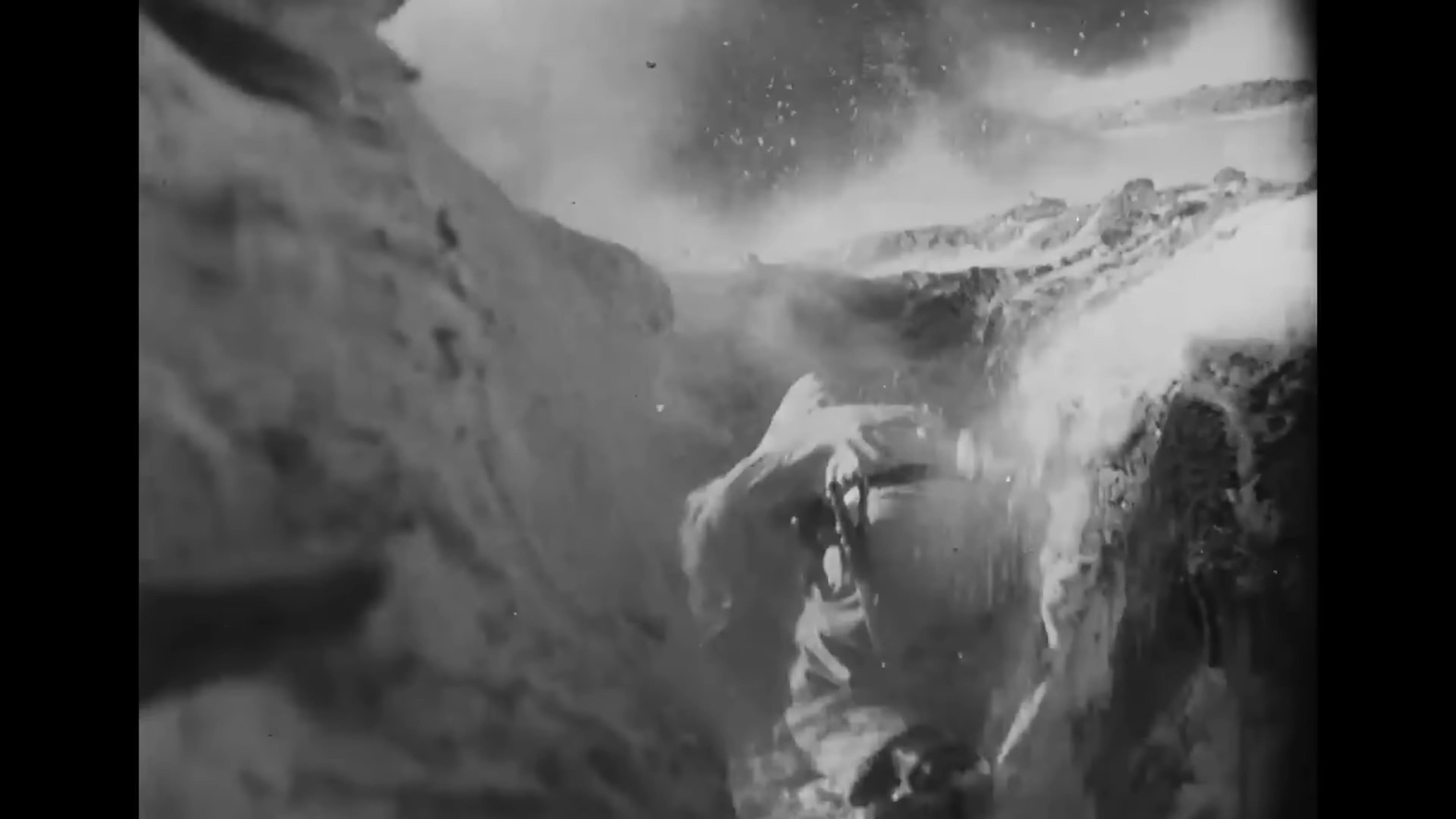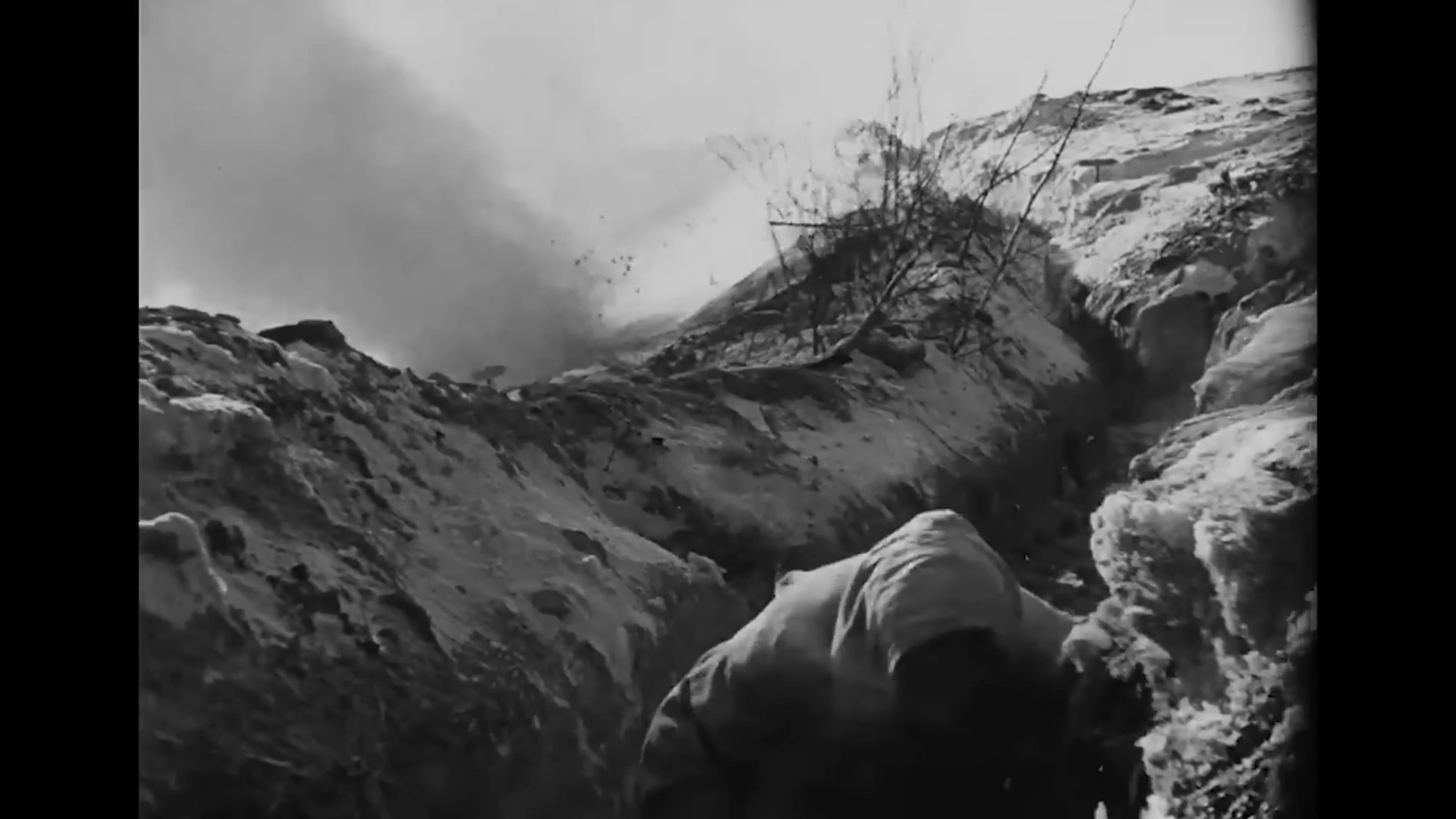 Но сейчас-то очевидно, что так удачно разрывы - именно в нужном месте и в момент съемки в реале не лягут, да и шанс прилета в окоп при такой густоте слишком велик. Но это сейчас, уже сильно потом. Представляю, как ощущалось это немцами - зрителями тогда!