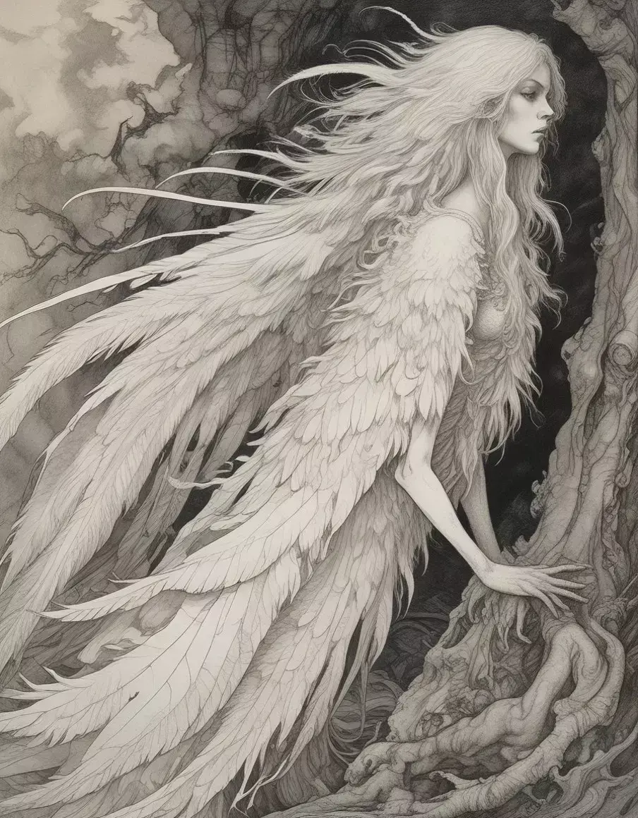 "Я рассказывал, что меня изрядно потаскало по свету, да только ты, наверно, не слушала. Как и обычно. Был я и в Синих горах, и в Седых гаванях, что на утесе. Был еще юнцом, когда мать таскала с собой по дорогам. Не знала, где голову приклонить, просила тепла и работы у встречных людей. Тогда я и увидел ее, Сольвег. Потом думал, что сон, что привиделось, что мало ли что увидишь в потемках, в долгих сумерках, в бликах от факелов. Они везли ее на Серебристые шахты. Отправляли в клетке на утлой лодчонке с одним рулевым. Он бы доплыл, оставил там, бросил, на берегу бы истлели ее белые кости. Знаешь, что увидел я издали в темноте в этой клетке? Только на миг, потом ее заслонили, прогнали меня, отправили к матери. Этих желтых глаз я вовек не забуду, точно у волка в ночи золотые, с тусклыми искрами. Голодные, страстные, дикие, в пол-лица, в пол такого прекрасного лица, а тело все будто в бронзовых перьях, пестрых и длинных. Улыбка кроткая, тихая, а когти на лапах точно ножи, да и кровь запеклась на них темной пленкой. И перья в крови. И клетка в крови. И нежная женская шея. Не в ее крови, Сольвег."