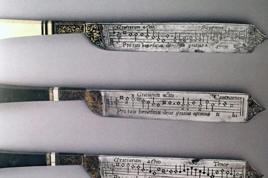 Или вот еще замечательные примеры совмещение, казалось бы, несовместимого — ножи с текстами благодарственных молитв и нотными записями этих молитв.