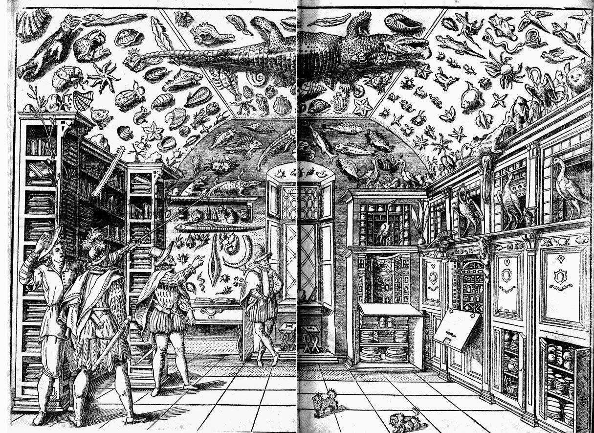 В XVI веке самые разные люди старались создать кабинеты диковин — высушенные морские звезды, необычные раковины, чучела птиц, пресмыкающихся и млекопитающих, артефакты из далеких стран — все как на гравюре выше. Кстати, эта гравюра изображает кабинет диковин неаполитанского аптекаря (!) Ферранте Императо, автора книги "Естественная история" (книга богато иллюстрирована). Как видите, в кабинетах диковин еще и проводили экскурсии — вы ведь не думали, что ходить в музеи это развлечение только нашего времени?