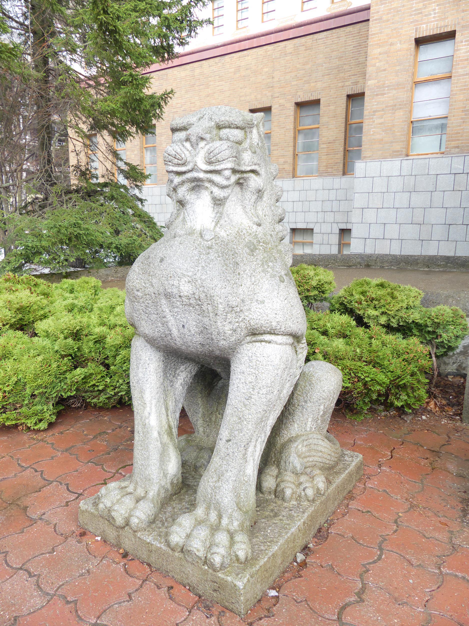 Один лев с открытой пастью (произносит звук "а" — начало Вселенной). Второй лев с закрытой пастью (произносит звук "ун" — конец всего сущего). Эти два звука составляют сакральное "А-Ун", которое означает альфа и омегу, начало и конец, вдох и выдох.