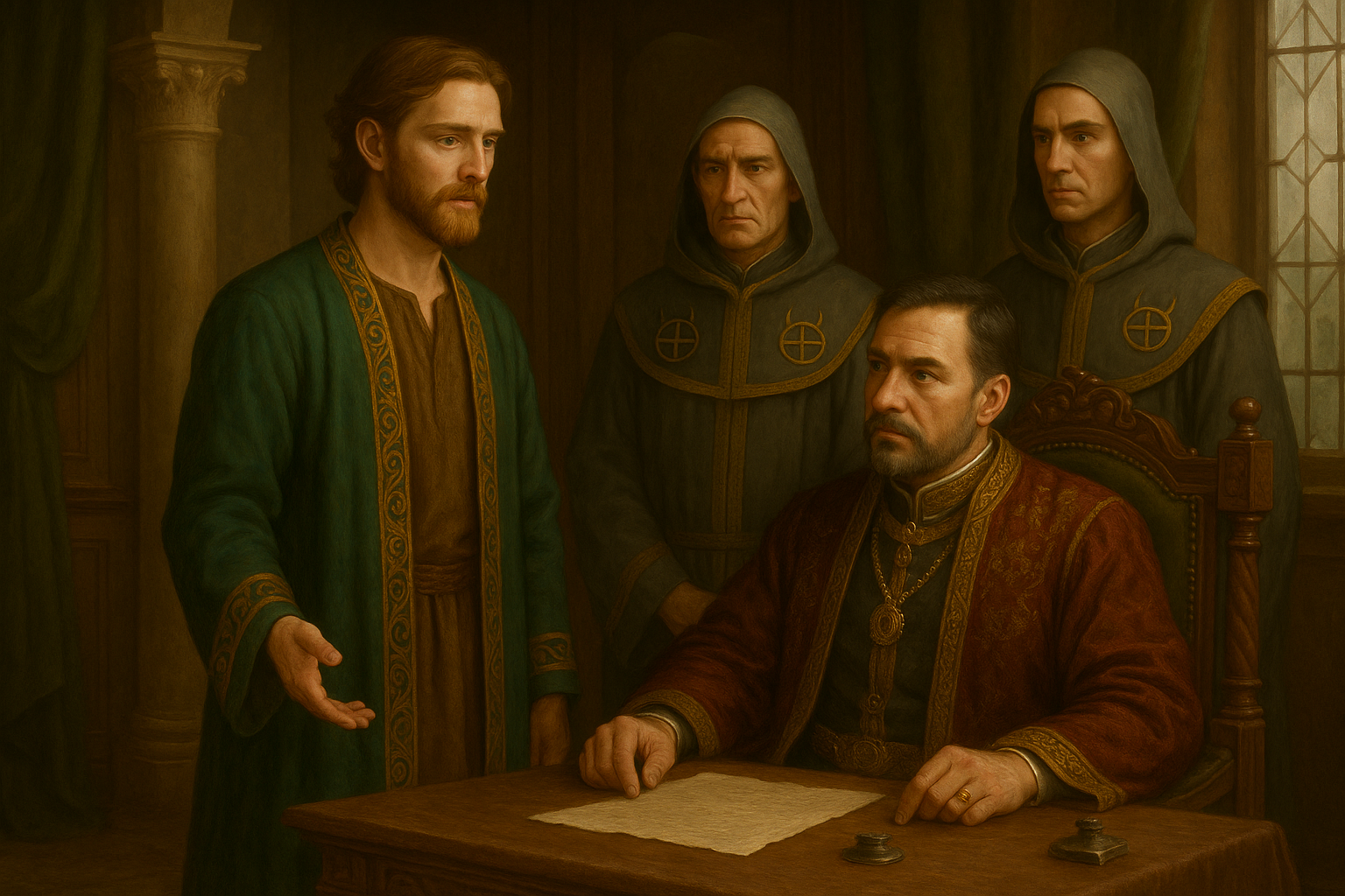 Попасть на встречу с представителями власти было не так просто, бюрократия царила в Гарнаке, как и в других королевствах. Алхимику пришлось остановиться в гостинице на окраине города и вписать себя в списки ожидания приема у многих должностных лиц. Когда Торальв, наконец, добился аудиенции у лорда Элрама, советника короля, разговор вышел совсем не таким, как он ожидал. Лорд выслушал его рассказ о троллях с нахмуренным лицом, но едва он успел вкратце объяснить суть опасности, как в зал вошли священники Объединённой Церкви.