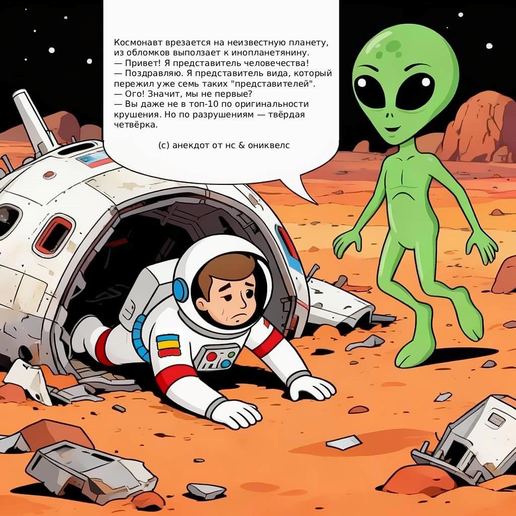 Космонавт врезается на неизвестную планету, из обломков выползает к инопланетянину.