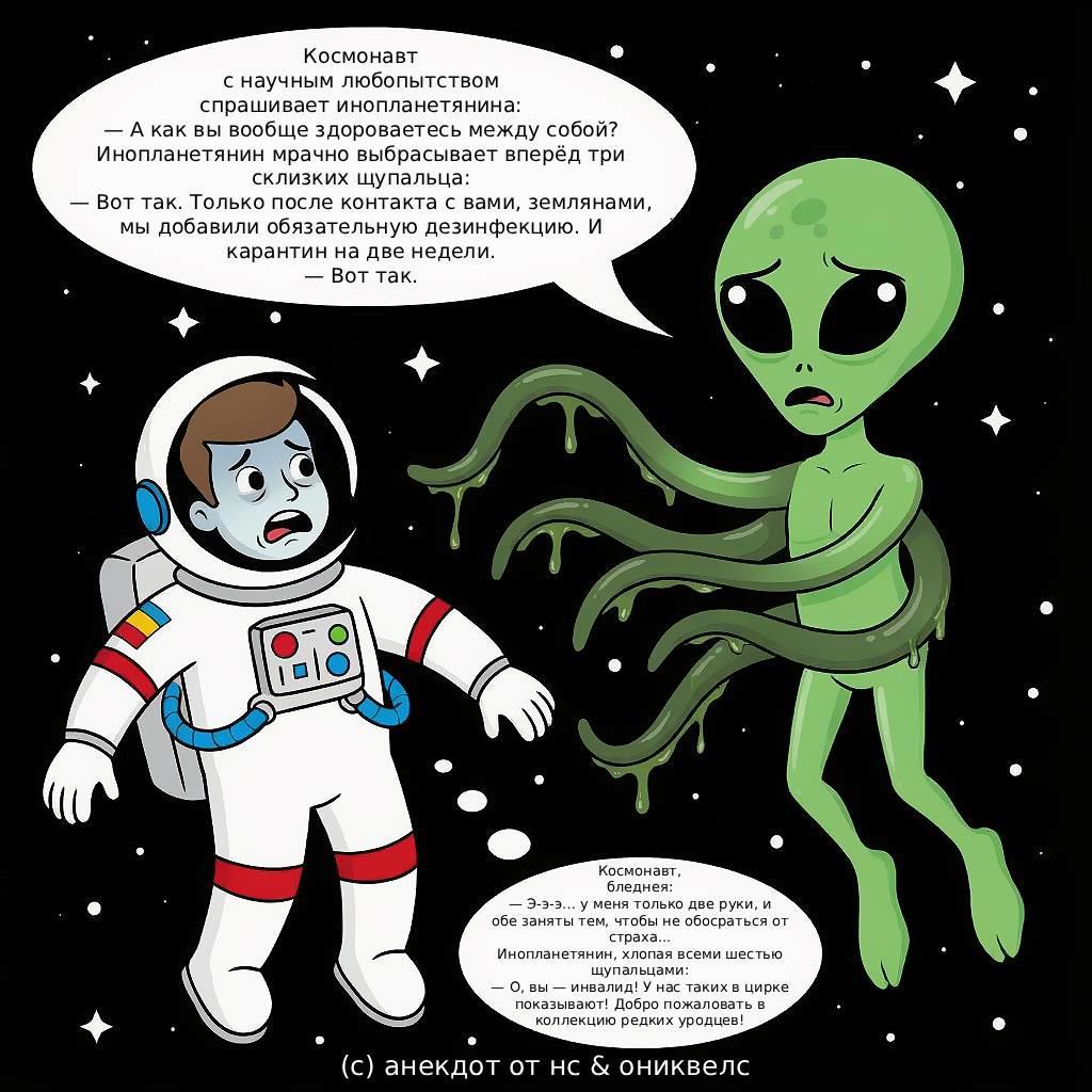 Космонавт с научным любопытством спрашивает инопланетянина: