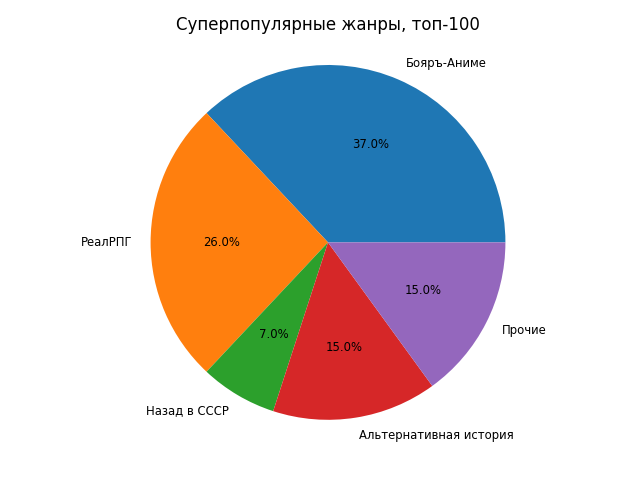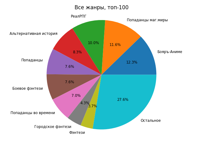 Информация собирается исходя из поисковой выдачи АТ, отсортированной по популярности за месяц: https://author.today/work/genre/all?rp=month&eg=-&fnd=false&page=1 (все фильтры были специально отключены).