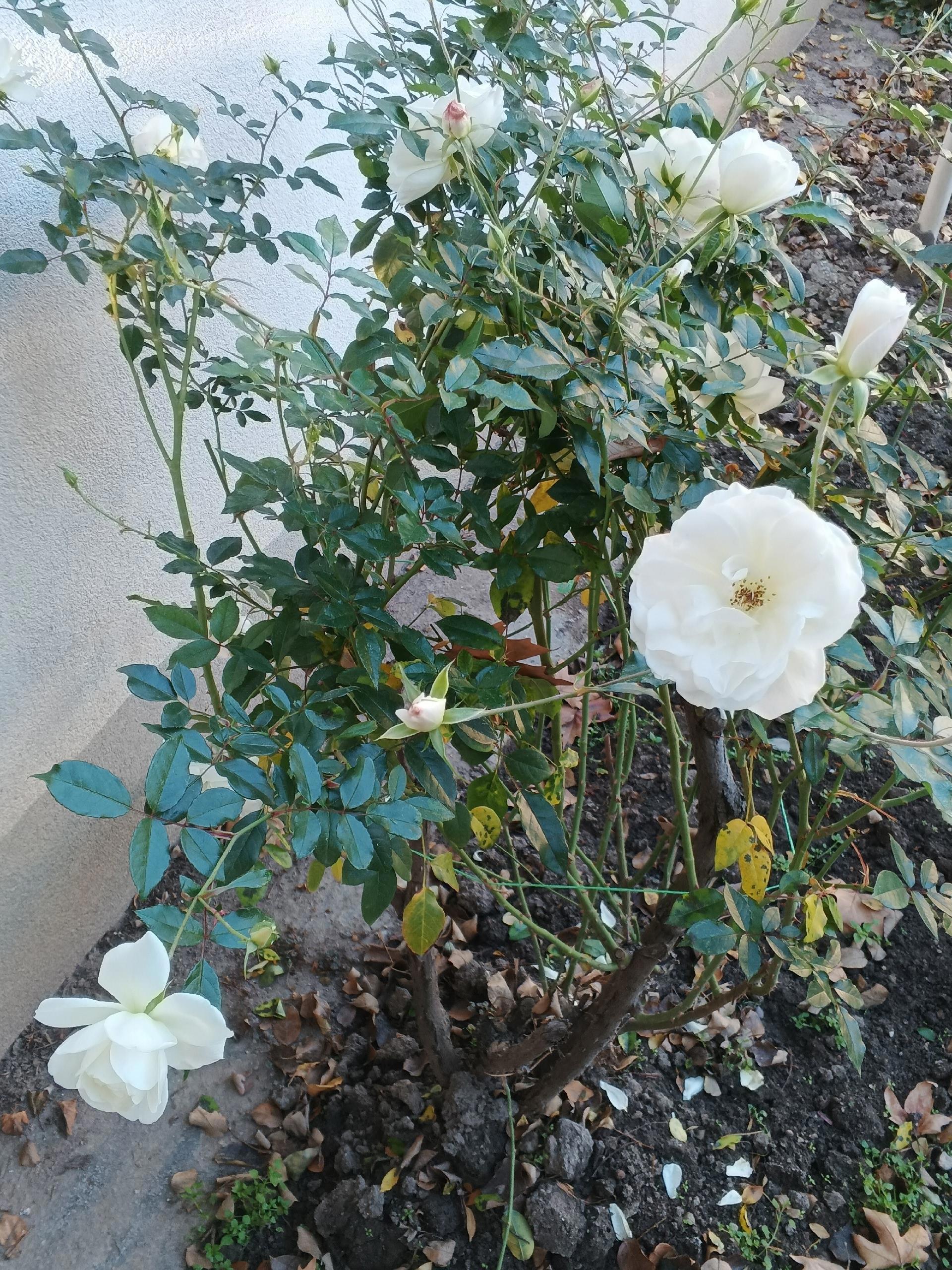 Начнём с нежной розы - белой Катеринки. Она уже осенняя, уже не вьётся вокруг столбиков, но радостно цветёт. Если ей повезёт цвести и зимой, то мы это увидим.