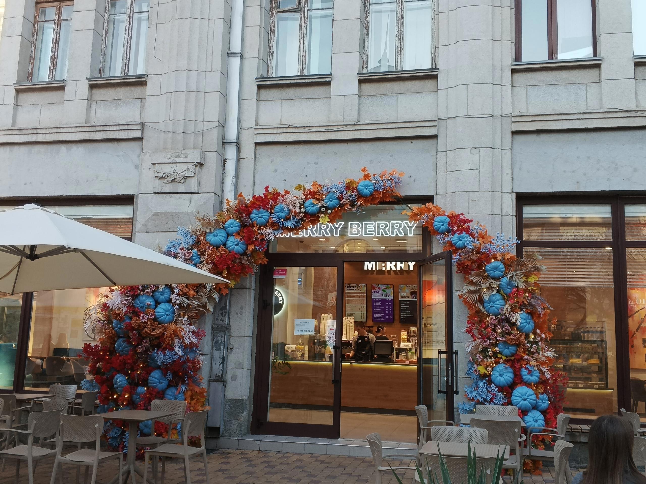 А другие кафе смело ввели в осеннее оформление синие и голубые оттенки, видимо они таким образом намекают на скорый приход зимы.