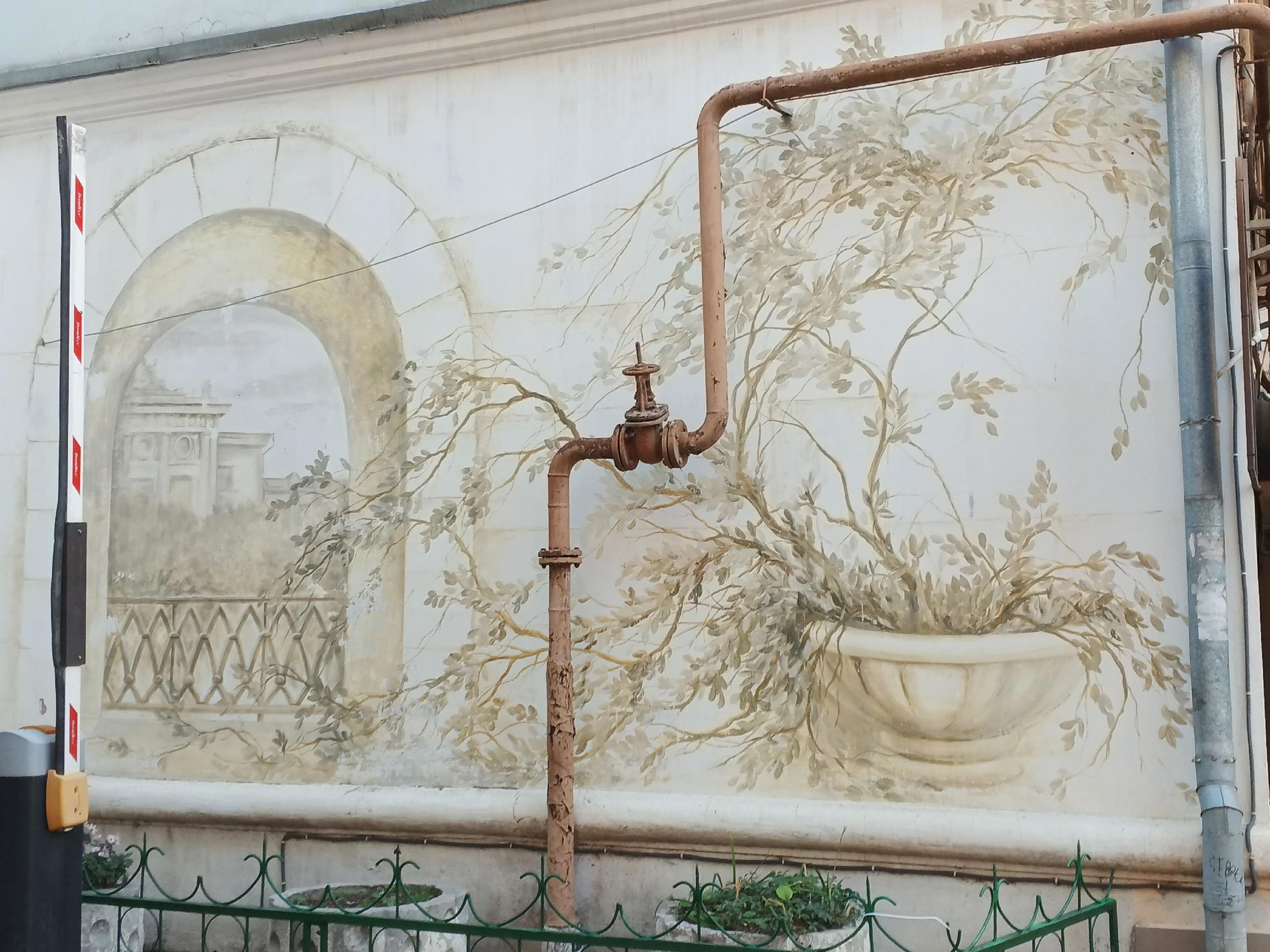 Гуляя по городу мы обнаружили удивительно интересный дворик. И роспись на стене необычная, и сохранилась труба от старой котельни, да и сам двор очень симпатичный.