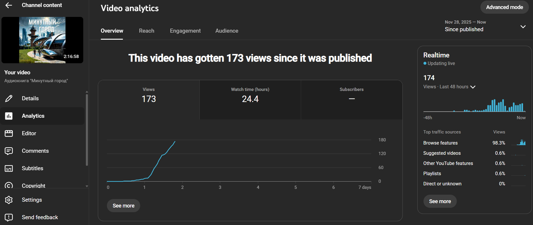 ВК слабенько, но всё равно радует что прослушивания растут потихоньку. Реклама аудиокниги была только на Пикабу и в ВК пару раз.