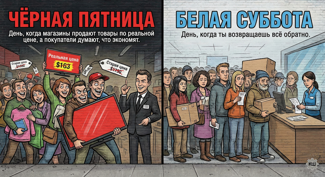 В итоге: вы купите робот-пылесос, который умнее вас (потому что он не ведется на скидки), годовой запас носков и курс по финансовой грамотности за полцены.