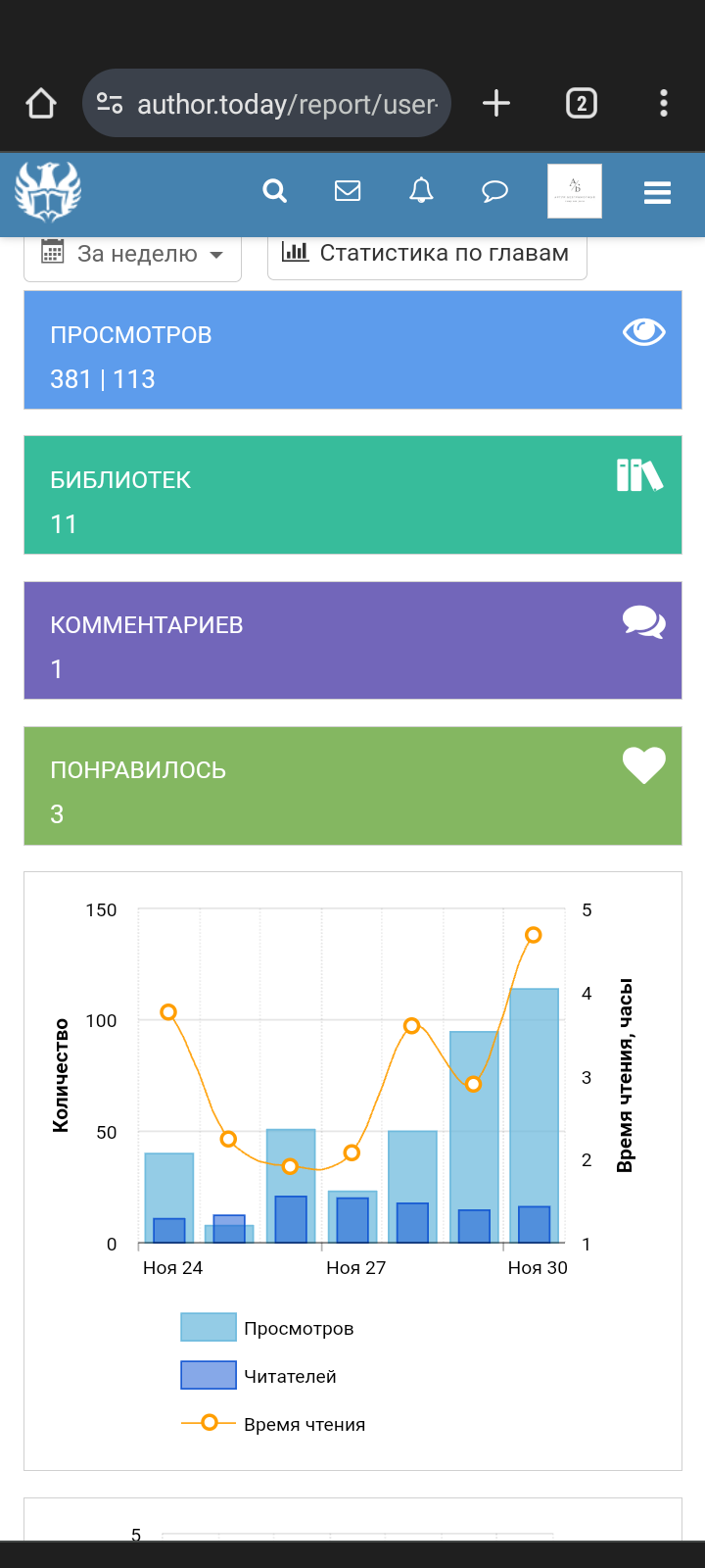 Что по статистике? Одно сердечко и две библиотеки. Плюс самое продолжительно чтение за все время марафона. Очень доволен.