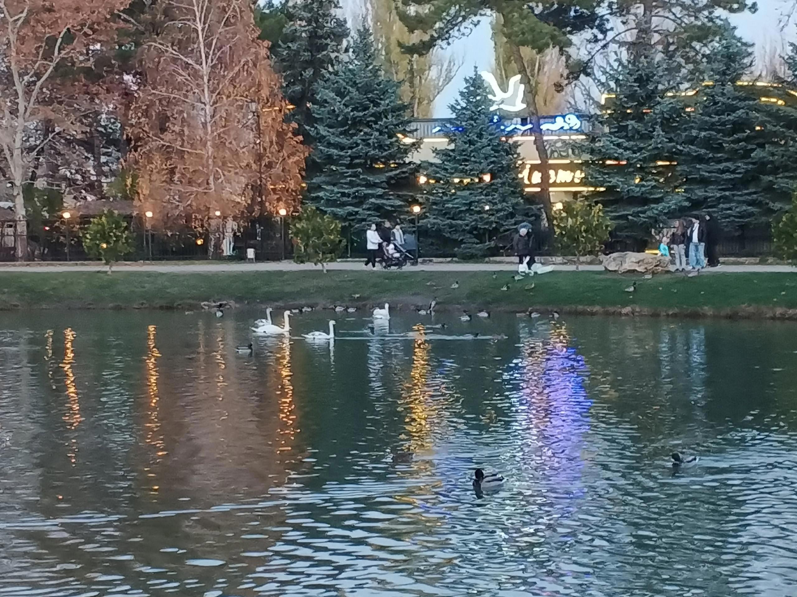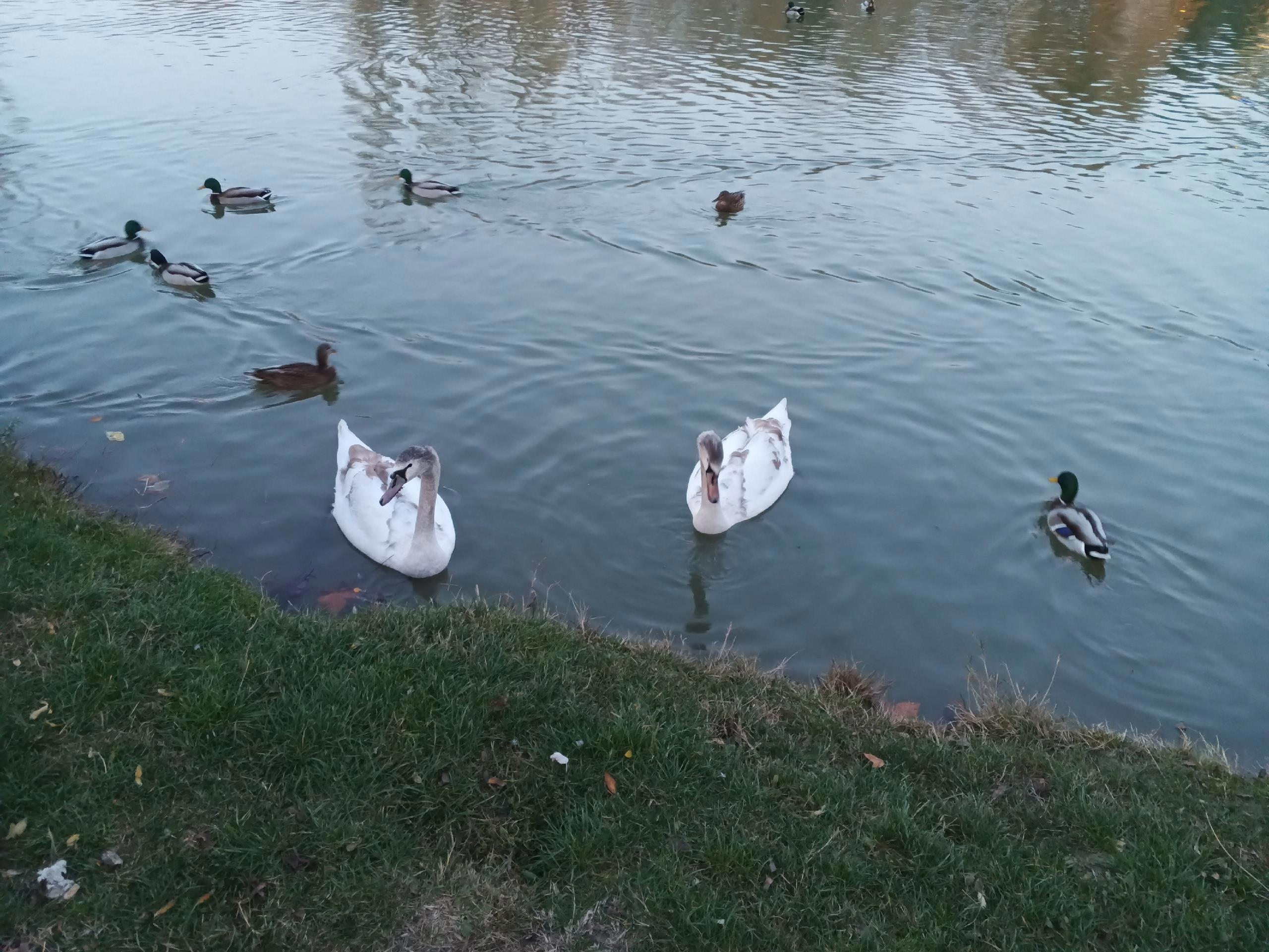 Пруд тоже встречает нас стылой осенней водой. Молодые лебеди изящно выгибают шеи, поглядывая на плавающих в отдалении родителей.
