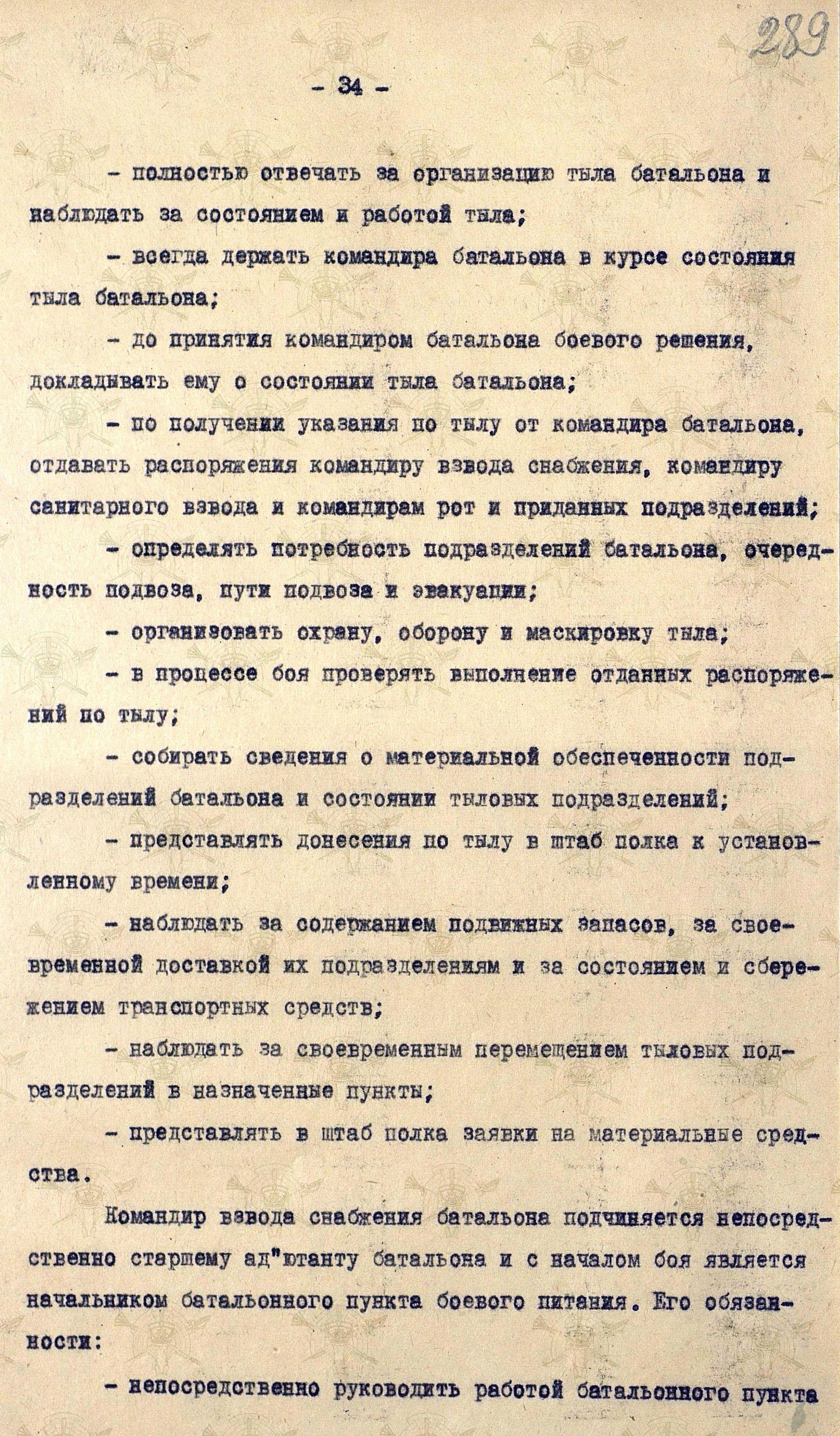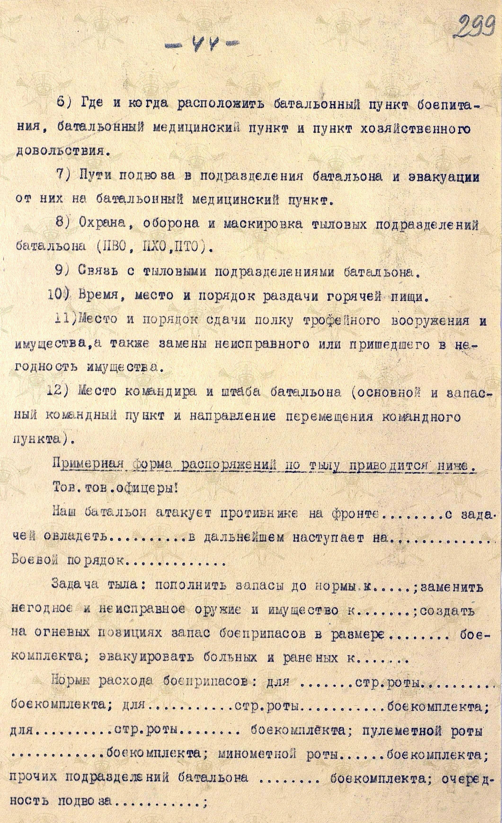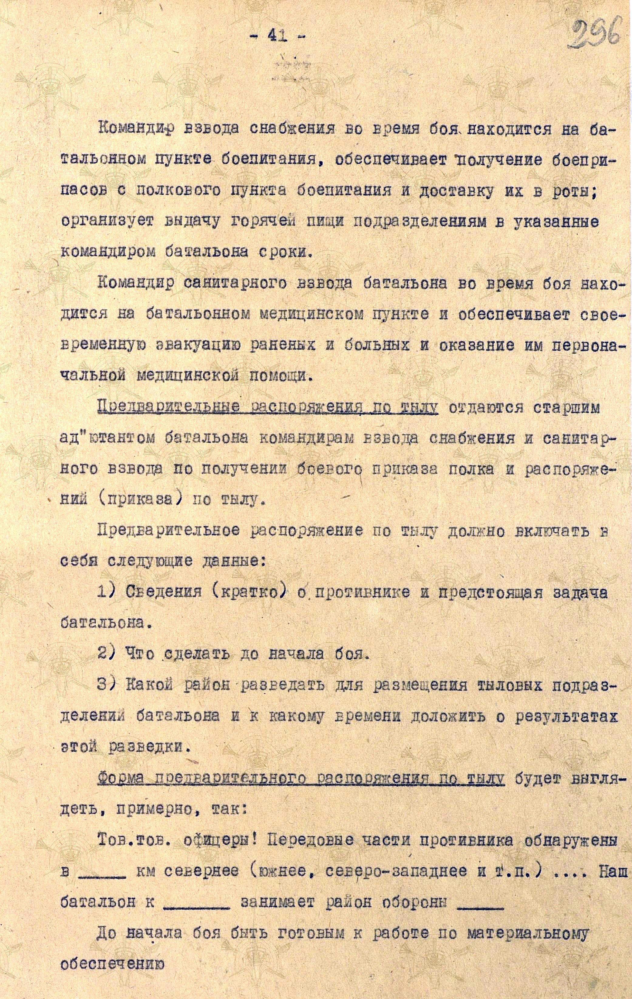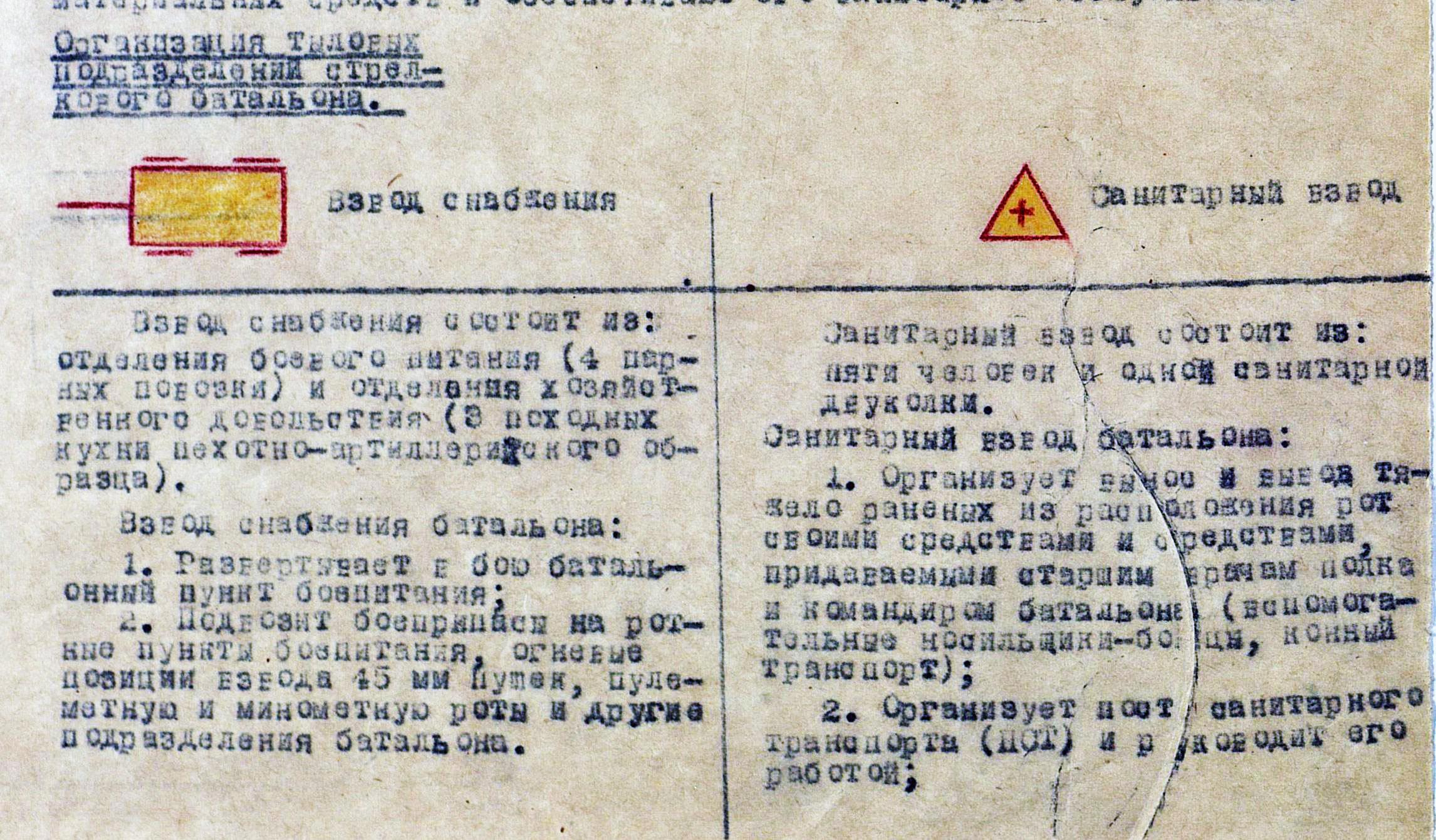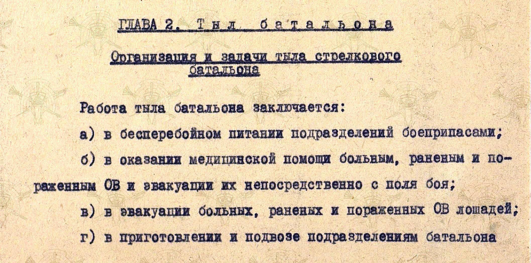 Сегодня же мы подробно разберём батальонный тыл, его организацию, задачи, состав, эшелонирование в бою, обязанности должностных лиц батальона по организации тылового обеспечения, управление тылом батальона, работу служб снабжения при наступлении, в обороне, на марше. Кроме того, в тексте есть и примерные образцы распоряжений, указаний, донесений, которые могут использовать в своей деятельности как писатели, так и реконструкторы. Во всяком случае, думаю, что как минимум с середины 1943 г., они соответствуют всё же представленным образцам, а не тем, что были в части 1 проекта Устава тыла РККА («Войсковой и армейский тыл»), изданного в 1941 году.