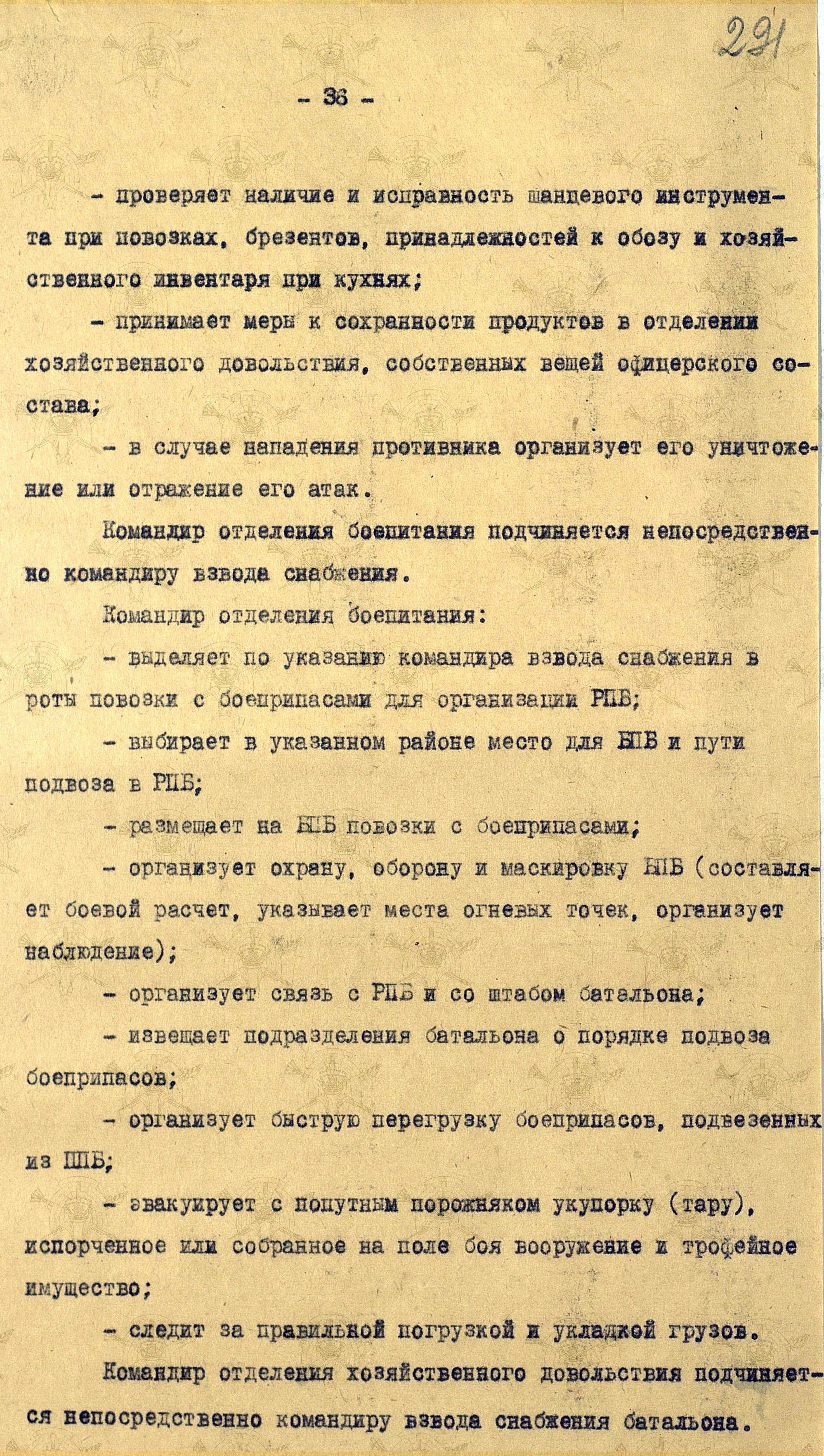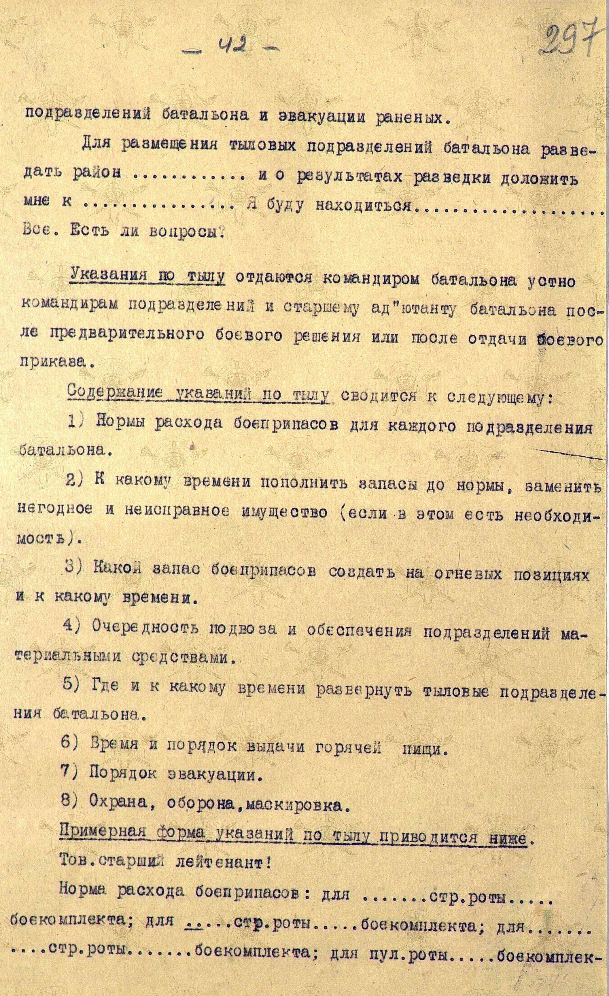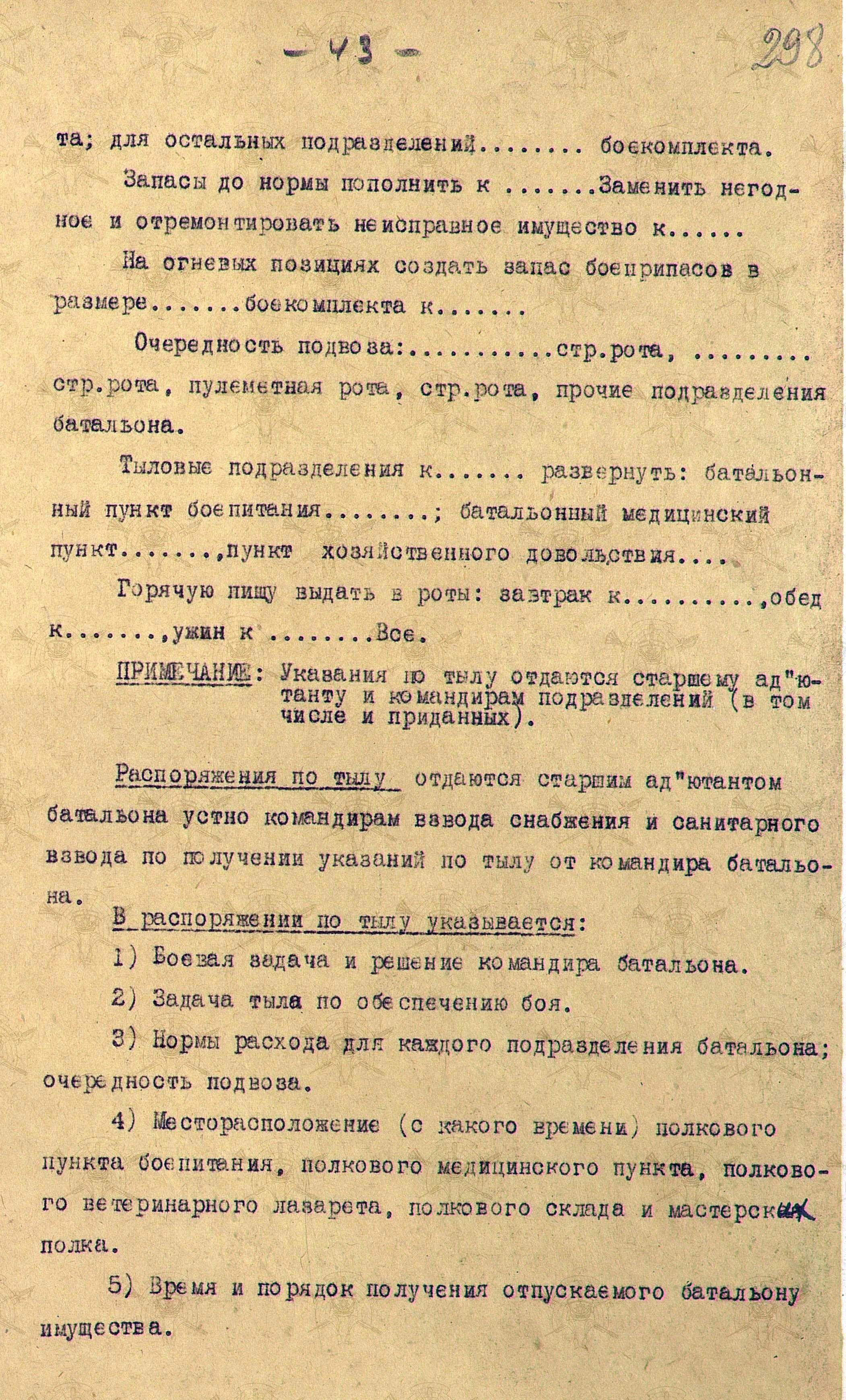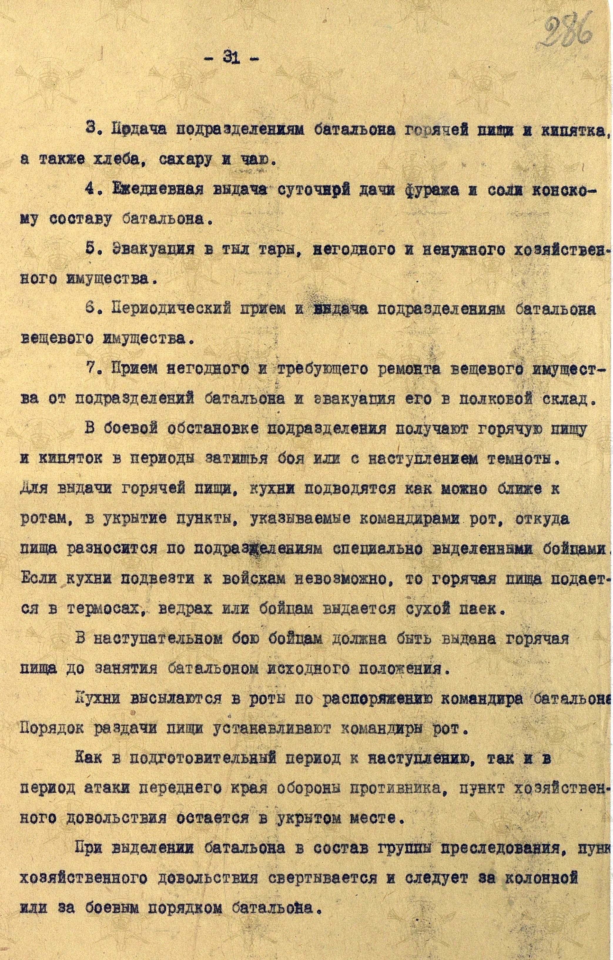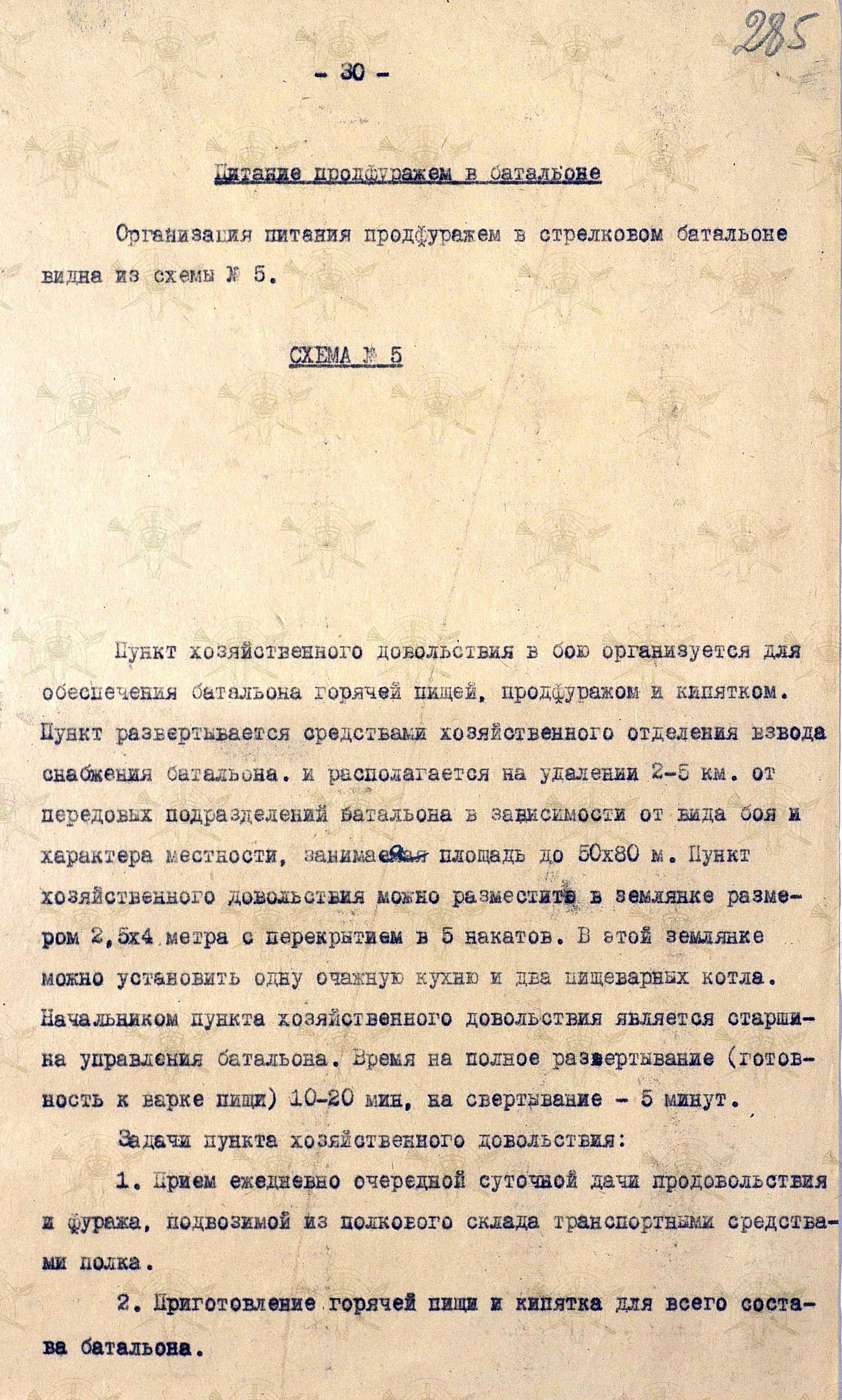 Сегодня же мы подробно разберём батальонный тыл, его организацию, задачи, состав, эшелонирование в бою, обязанности должностных лиц батальона по организации тылового обеспечения, управление тылом батальона, работу служб снабжения при наступлении, в обороне, на марше. Кроме того, в тексте есть и примерные образцы распоряжений, указаний, донесений, которые могут использовать в своей деятельности как писатели, так и реконструкторы. Во всяком случае, думаю, что как минимум с середины 1943 г., они соответствуют всё же представленным образцам, а не тем, что были в части 1 проекта Устава тыла РККА («Войсковой и армейский тыл»), изданного в 1941 году.