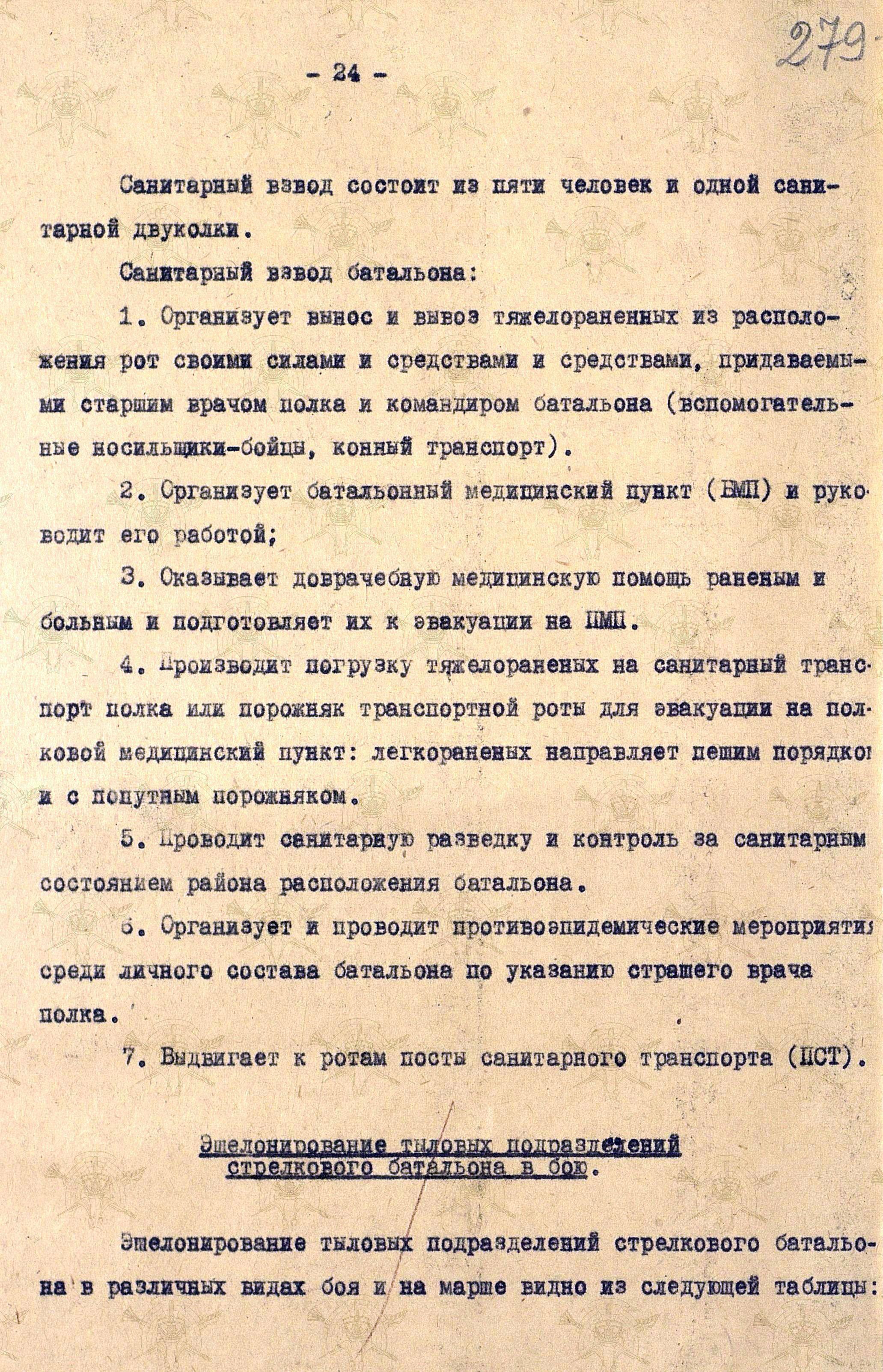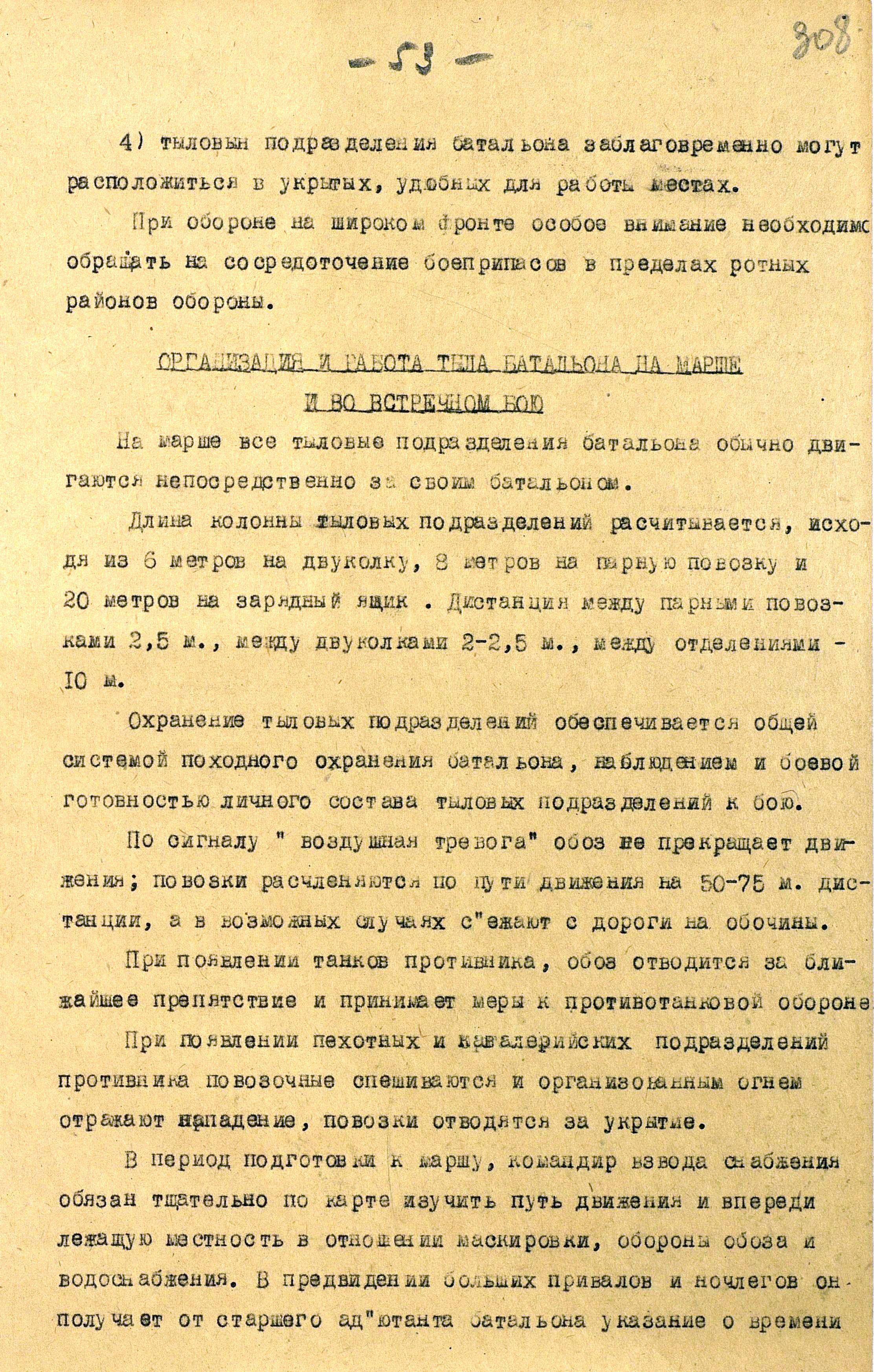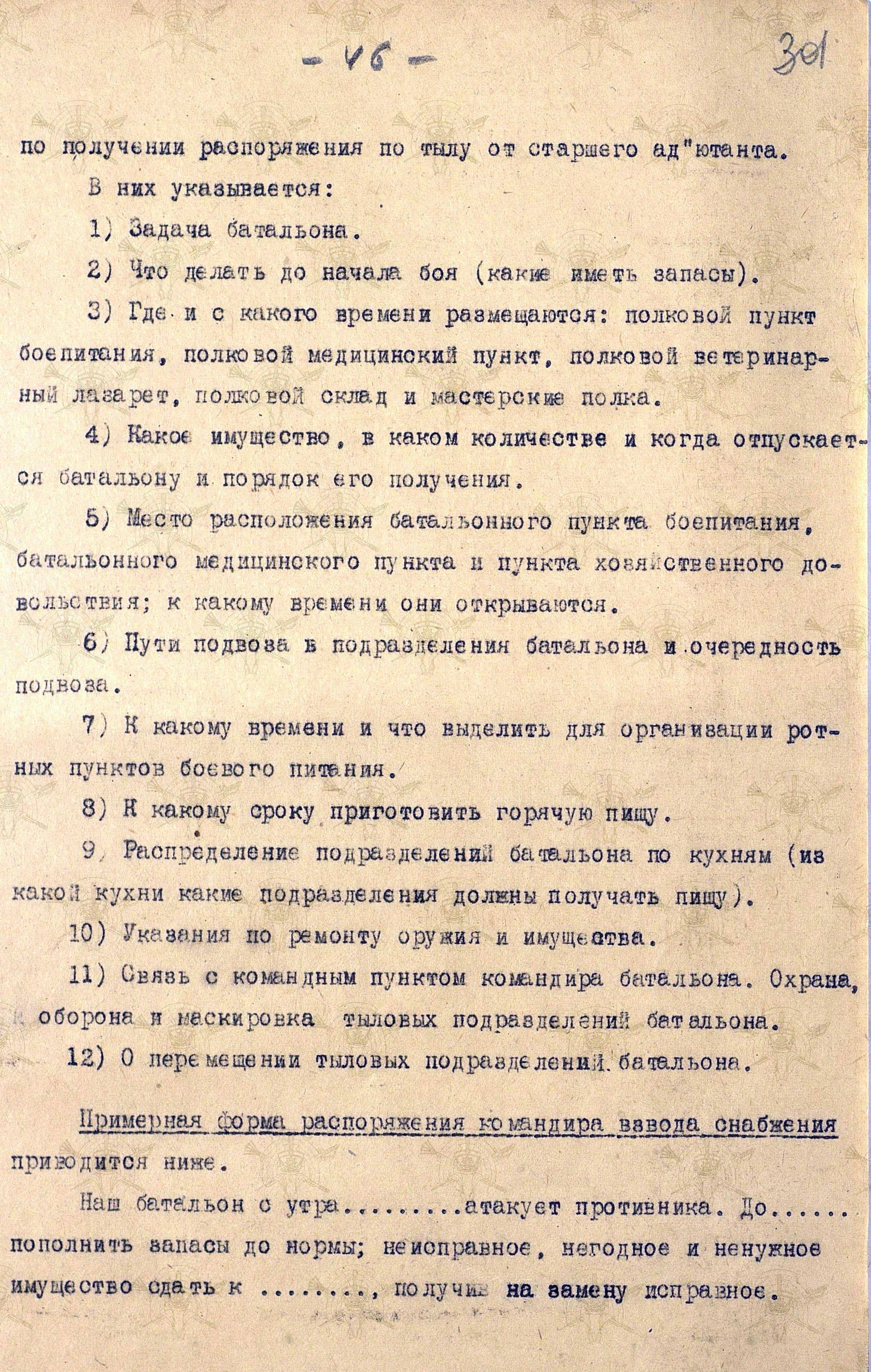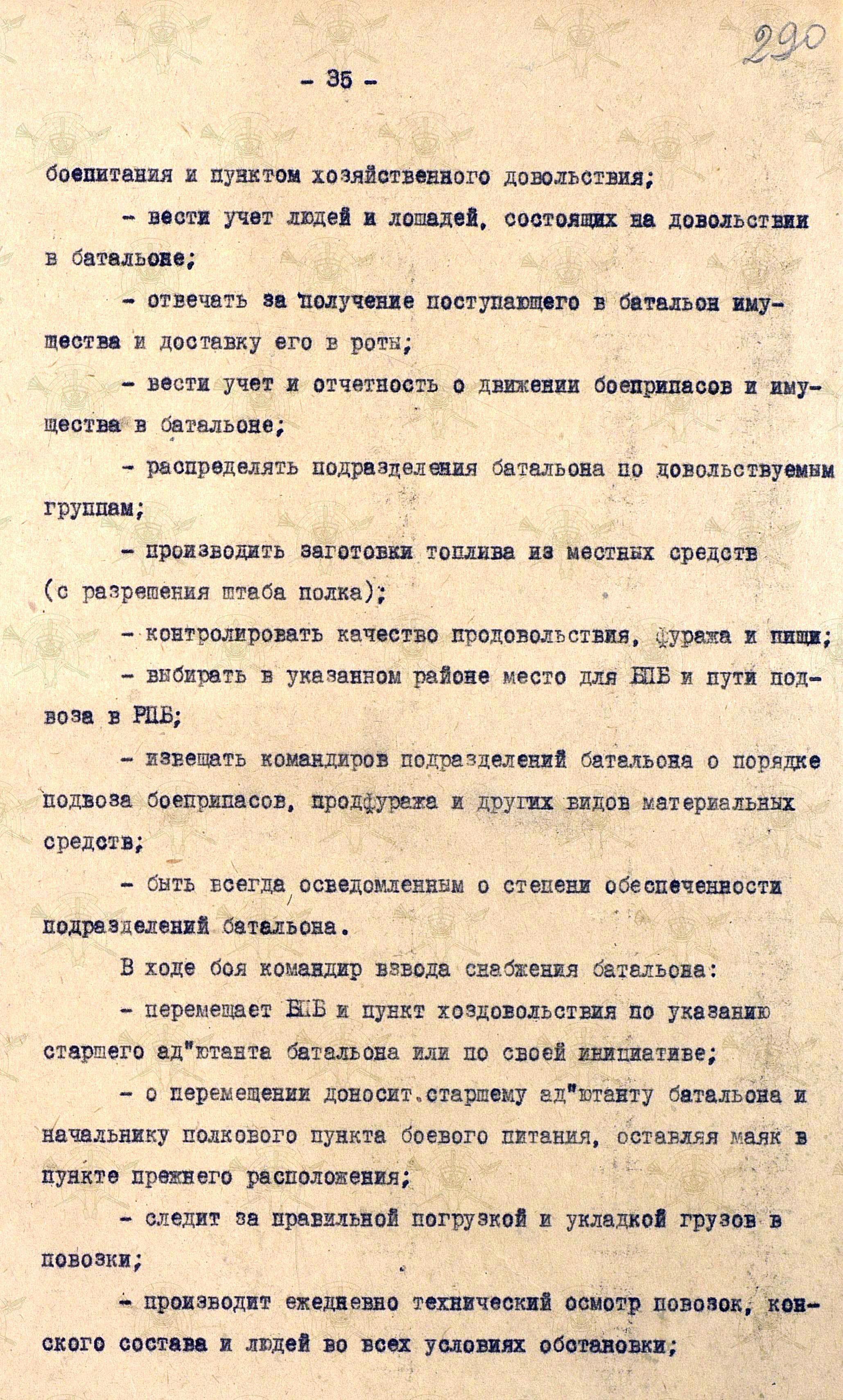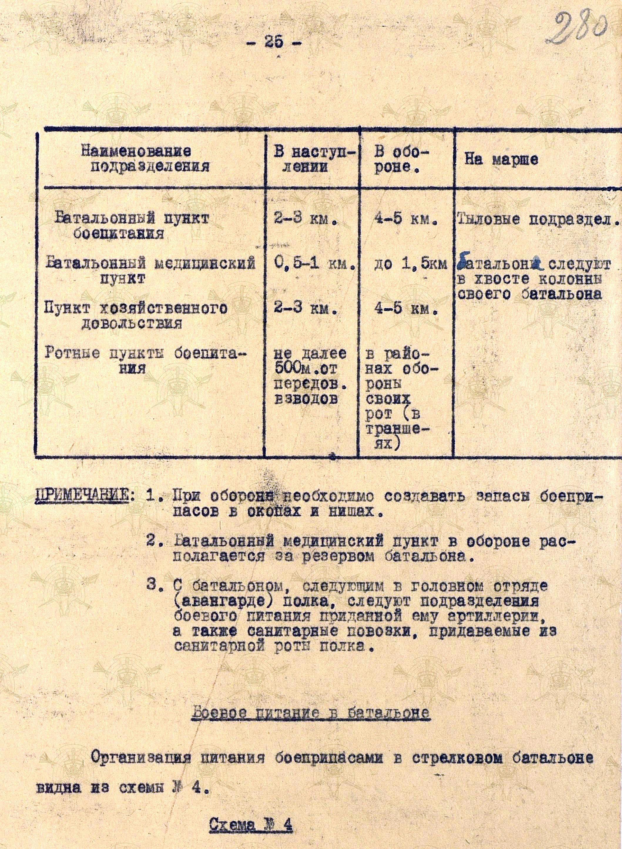 Сегодня же мы подробно разберём батальонный тыл, его организацию, задачи, состав, эшелонирование в бою, обязанности должностных лиц батальона по организации тылового обеспечения, управление тылом батальона, работу служб снабжения при наступлении, в обороне, на марше. Кроме того, в тексте есть и примерные образцы распоряжений, указаний, донесений, которые могут использовать в своей деятельности как писатели, так и реконструкторы. Во всяком случае, думаю, что как минимум с середины 1943 г., они соответствуют всё же представленным образцам, а не тем, что были в части 1 проекта Устава тыла РККА («Войсковой и армейский тыл»), изданного в 1941 году.