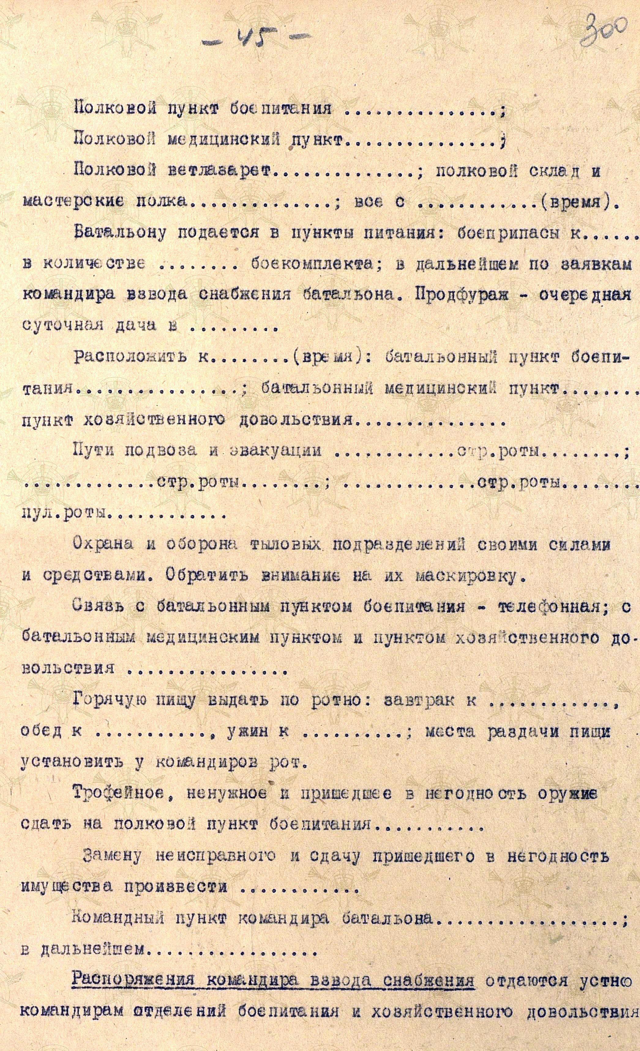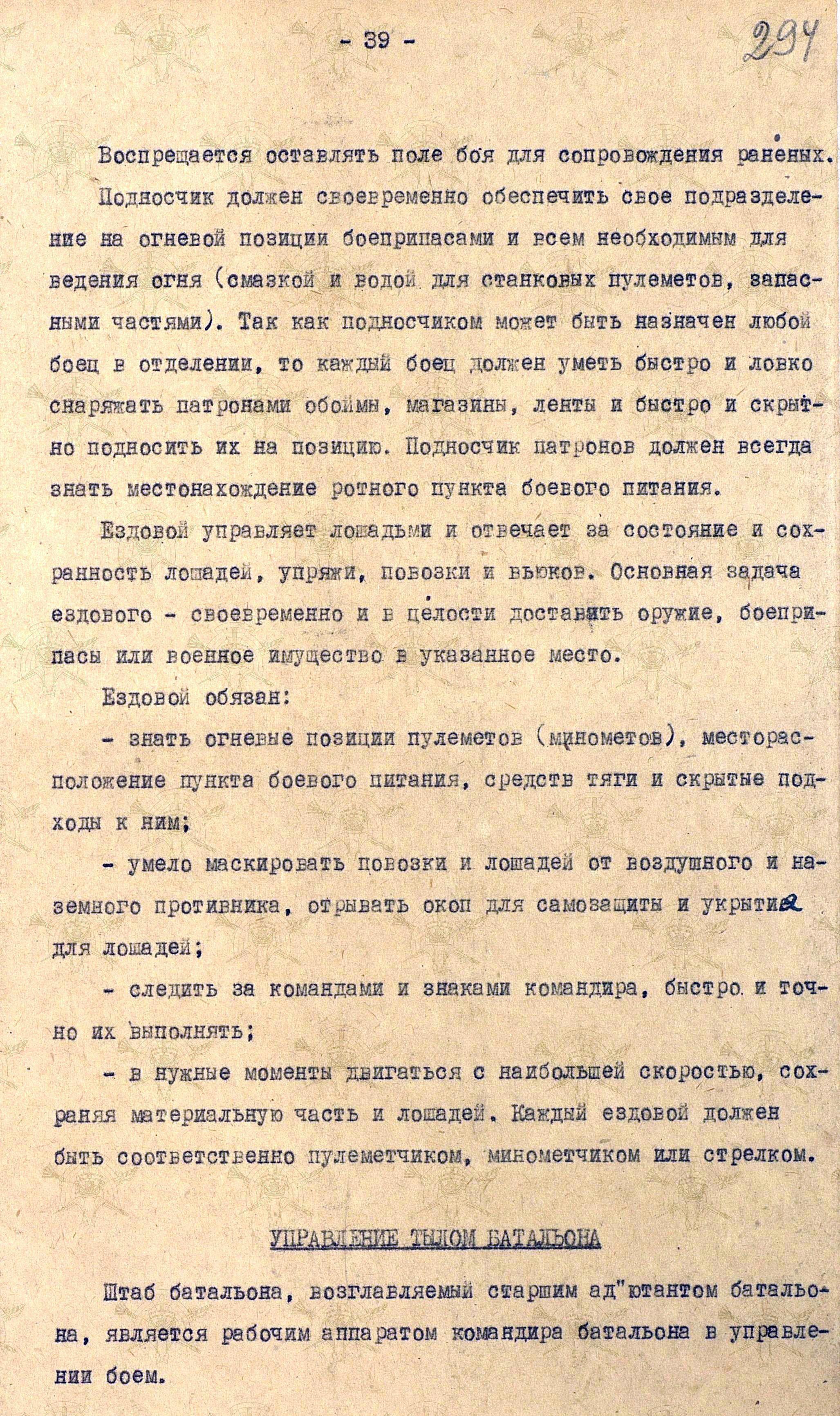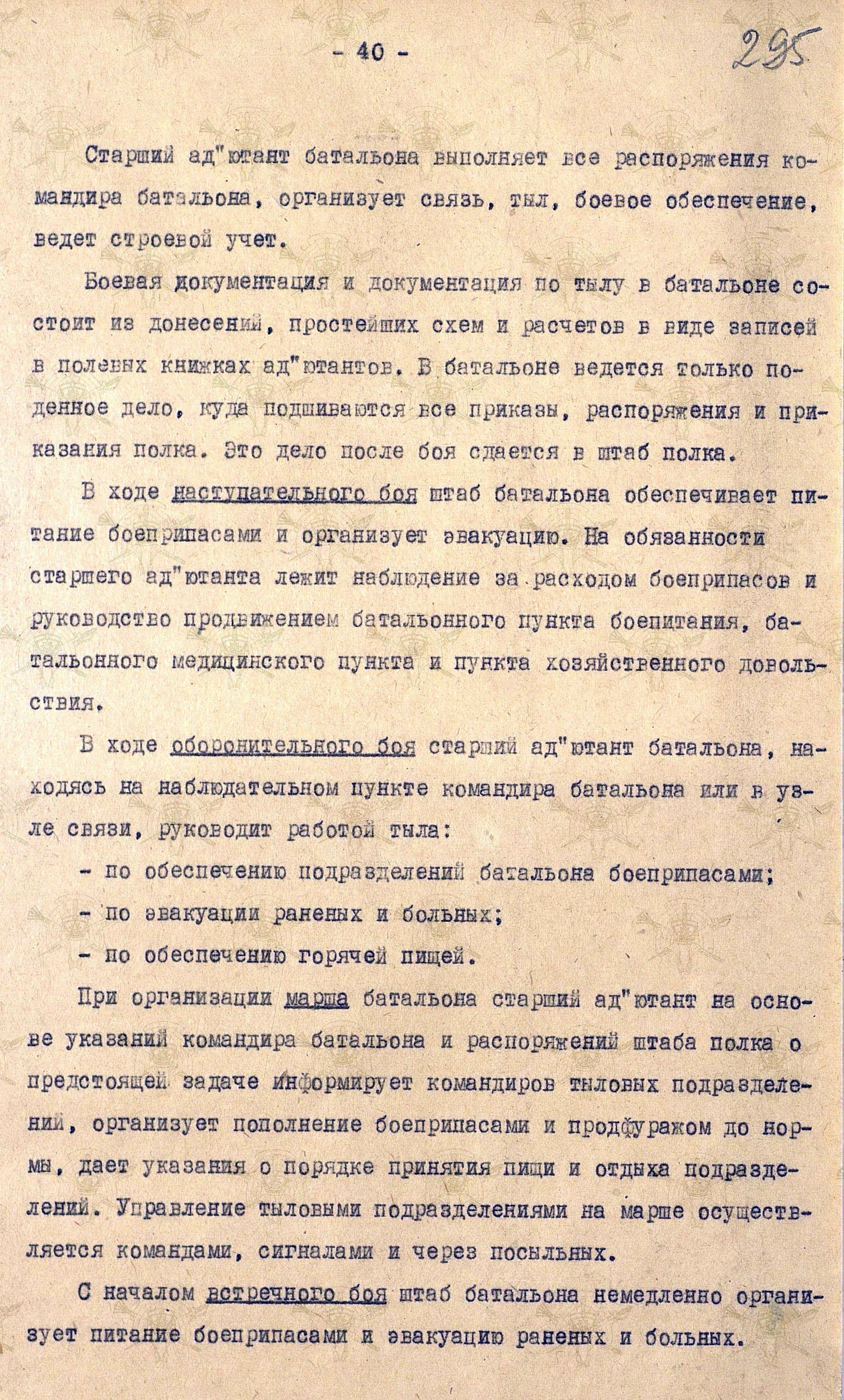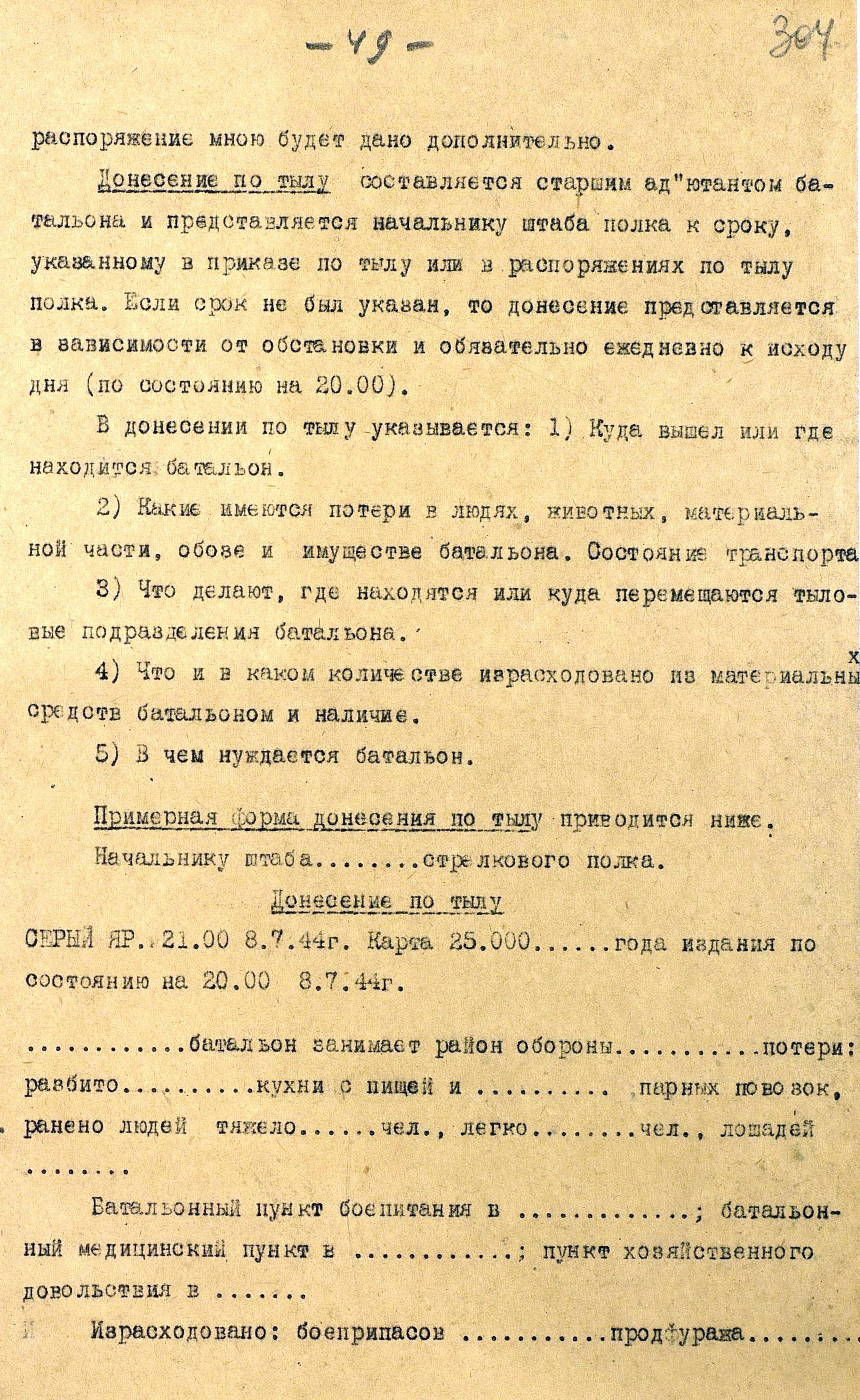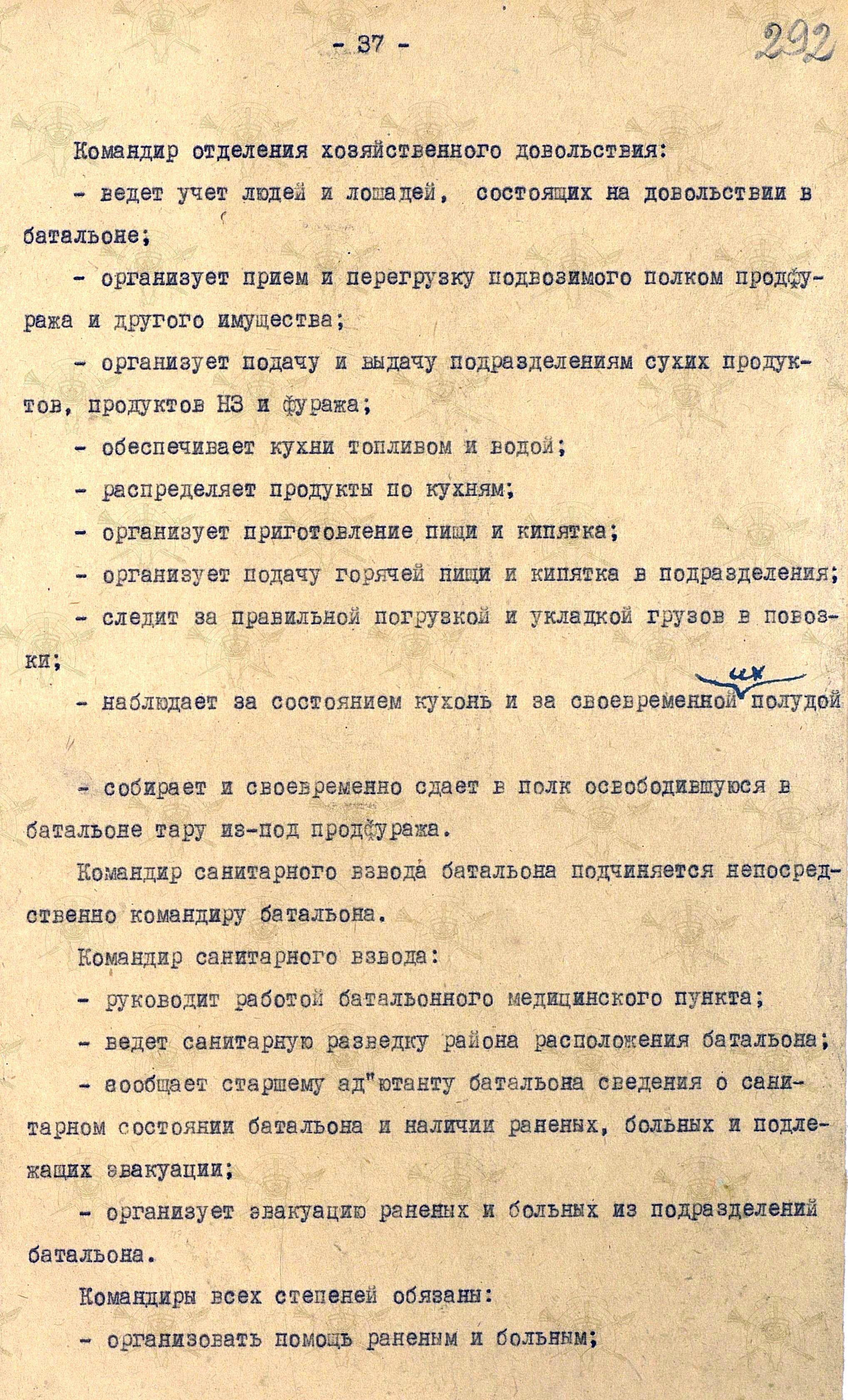 Сегодня же мы подробно разберём батальонный тыл, его организацию, задачи, состав, эшелонирование в бою, обязанности должностных лиц батальона по организации тылового обеспечения, управление тылом батальона, работу служб снабжения при наступлении, в обороне, на марше. Кроме того, в тексте есть и примерные образцы распоряжений, указаний, донесений, которые могут использовать в своей деятельности как писатели, так и реконструкторы. Во всяком случае, думаю, что как минимум с середины 1943 г., они соответствуют всё же представленным образцам, а не тем, что были в части 1 проекта Устава тыла РККА («Войсковой и армейский тыл»), изданного в 1941 году.