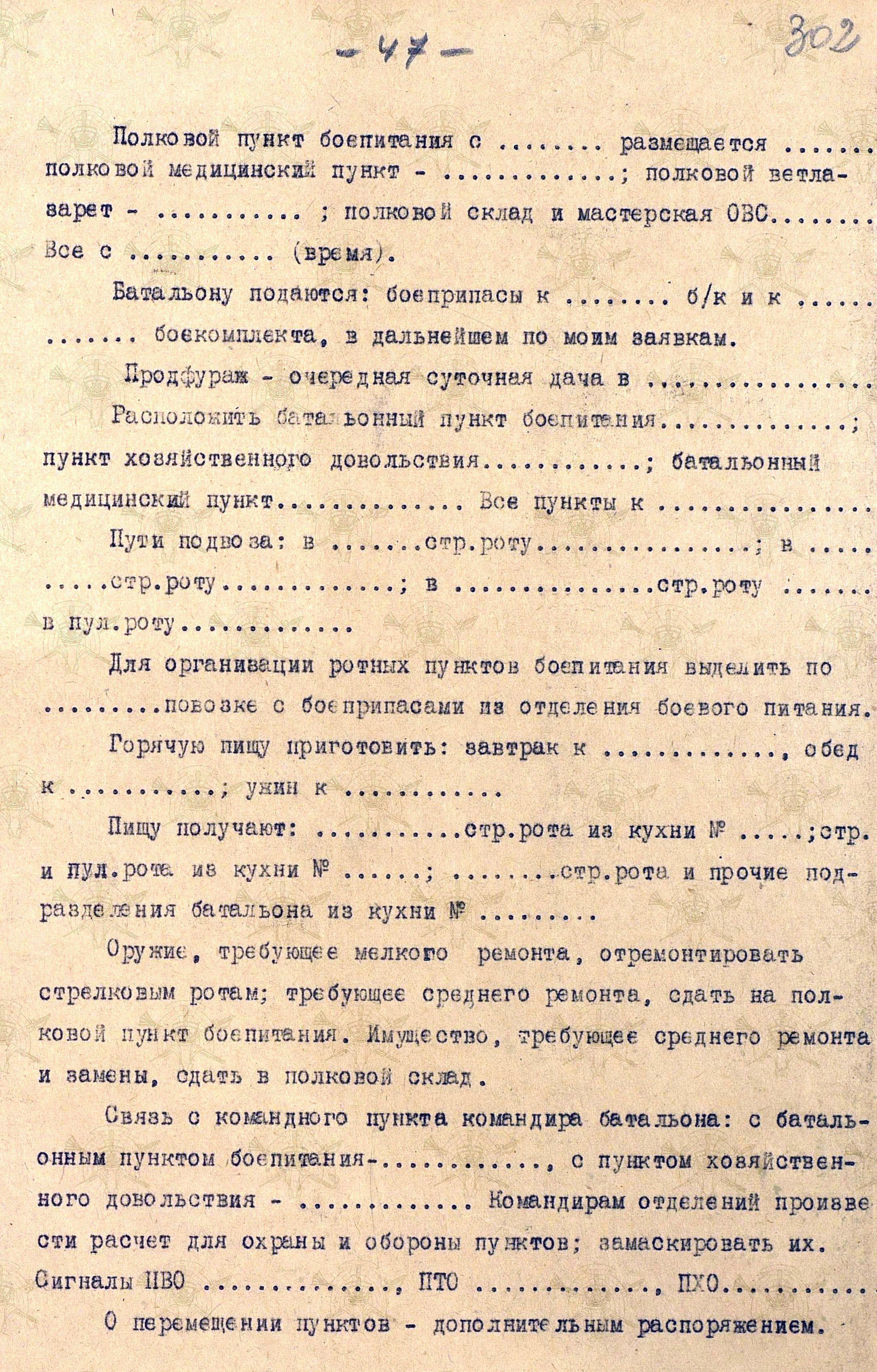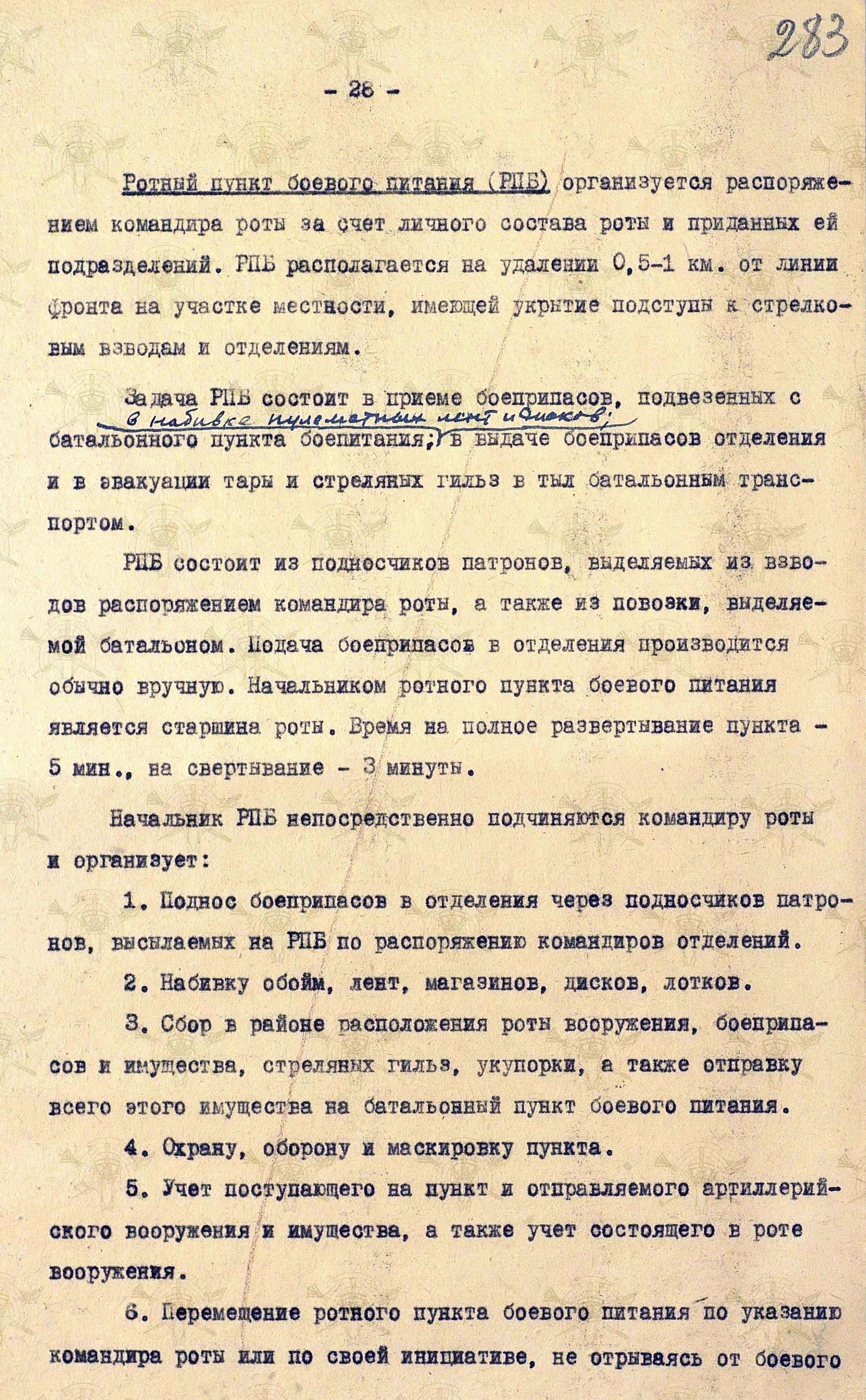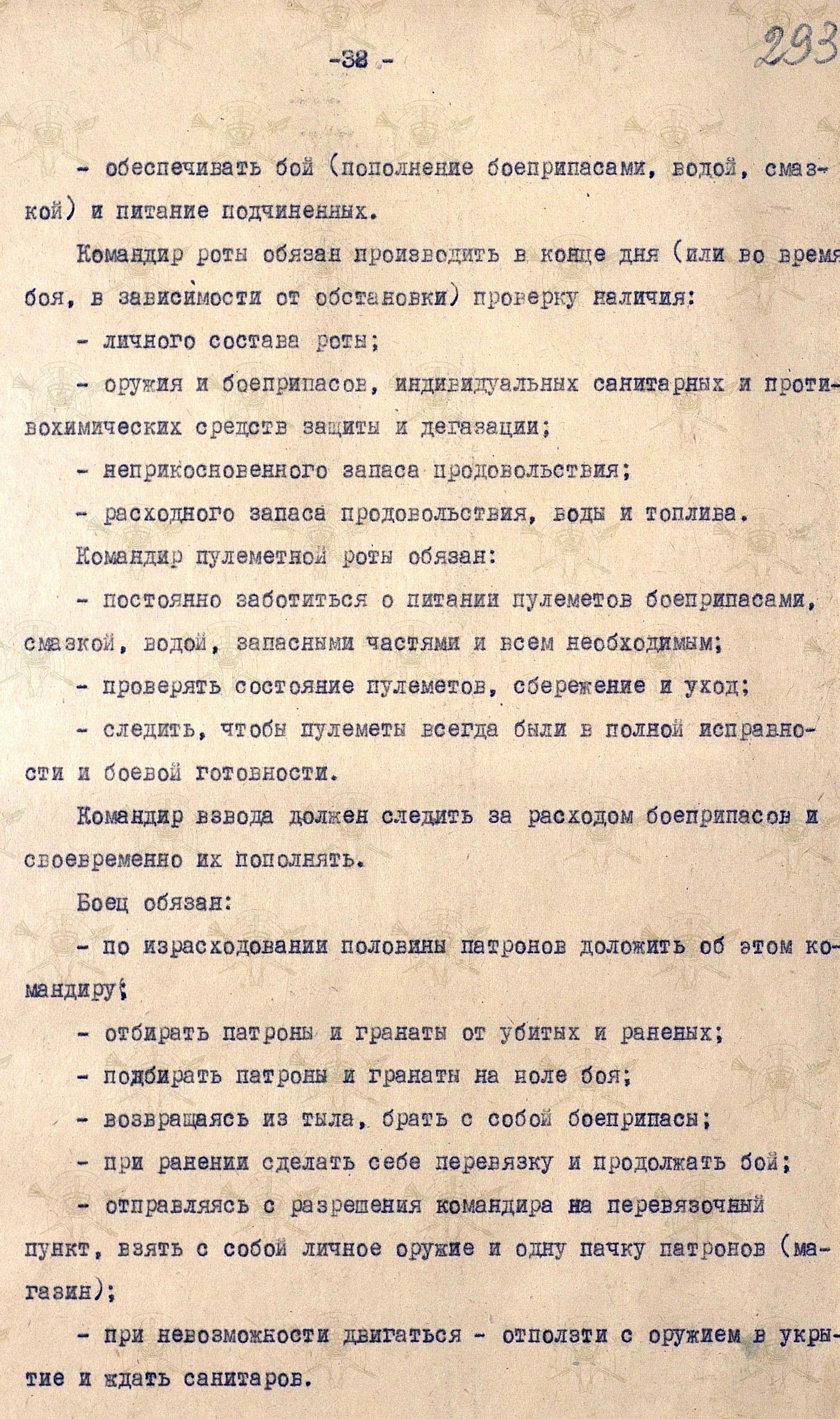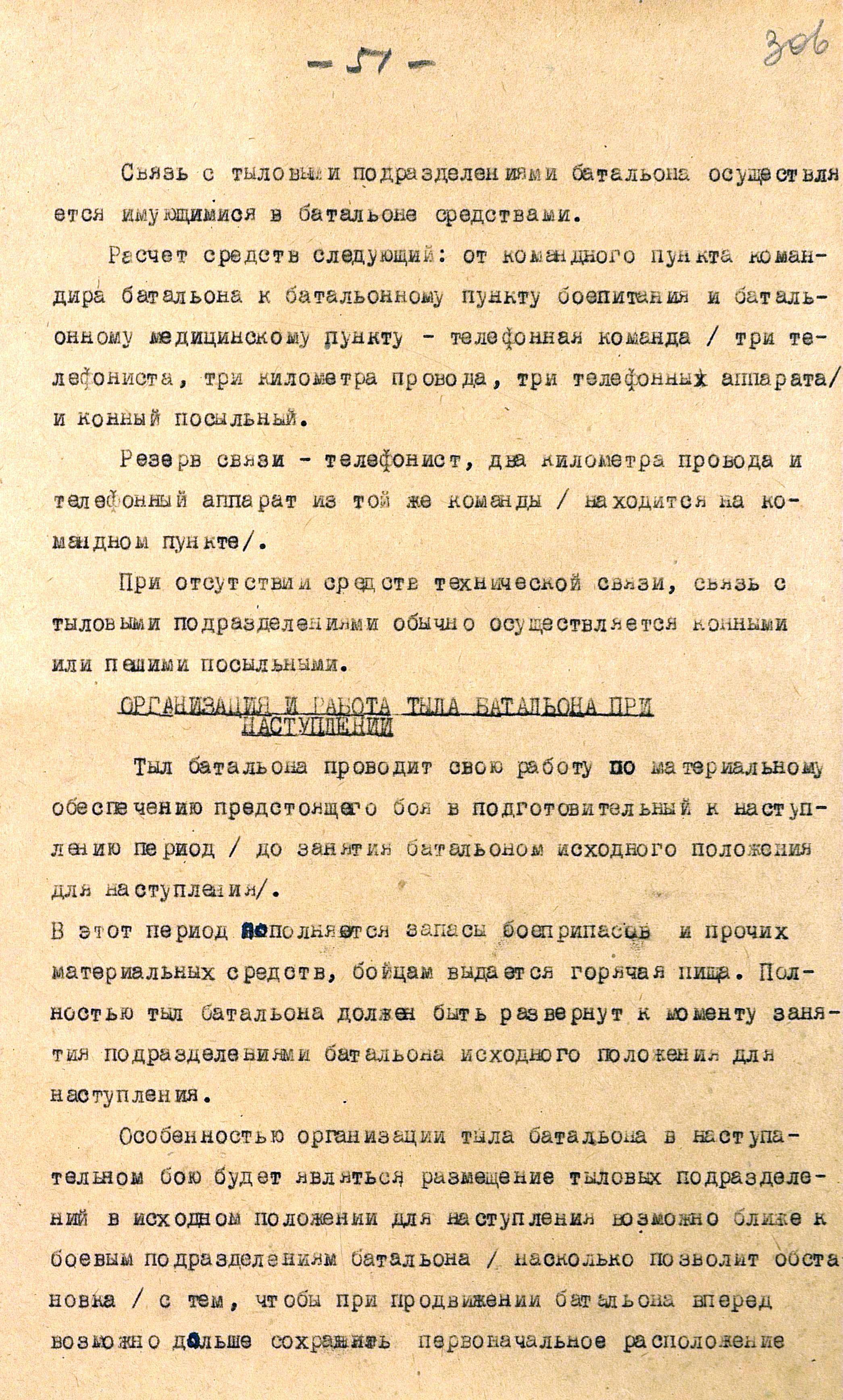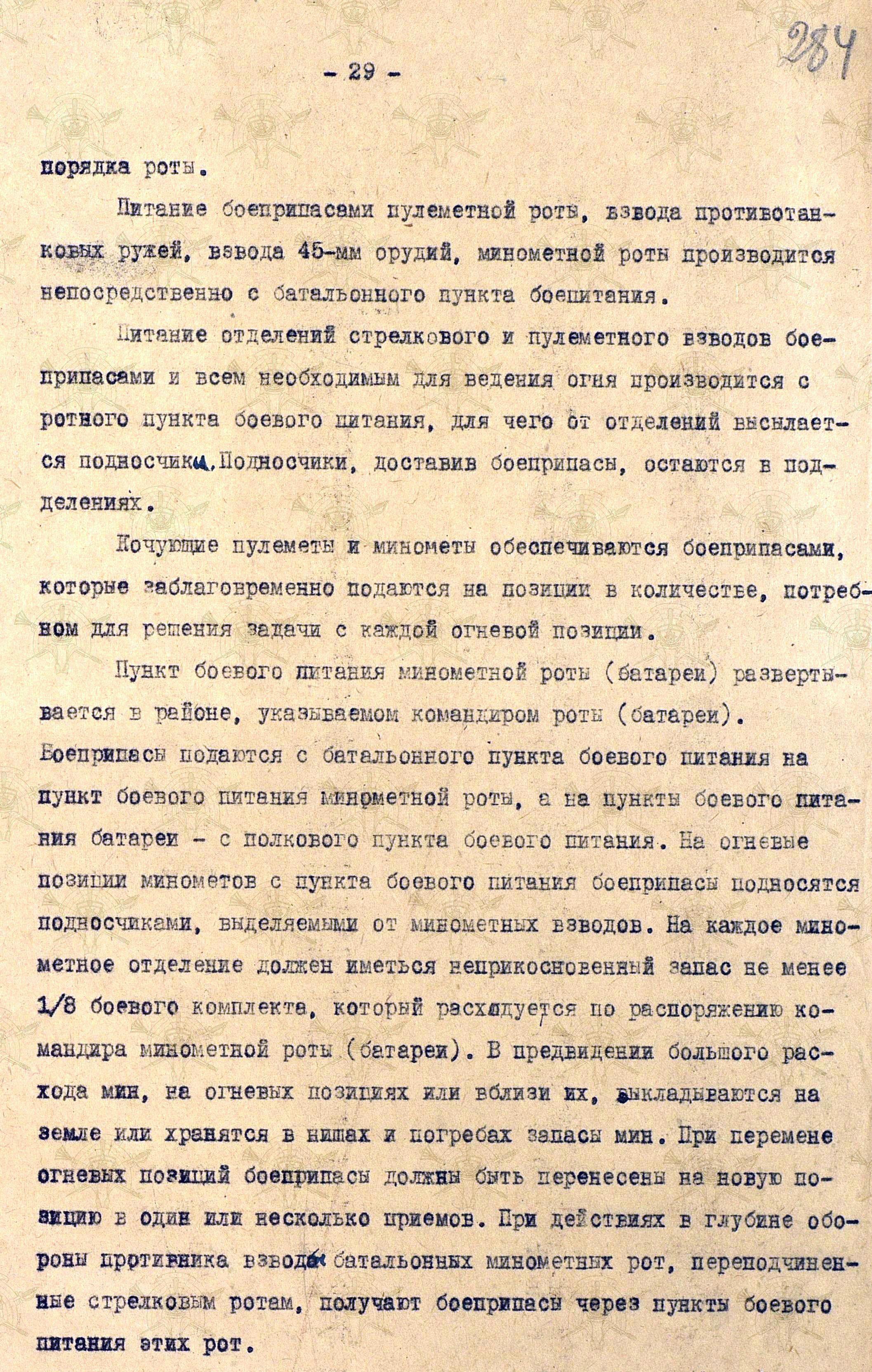 Сегодня же мы подробно разберём батальонный тыл, его организацию, задачи, состав, эшелонирование в бою, обязанности должностных лиц батальона по организации тылового обеспечения, управление тылом батальона, работу служб снабжения при наступлении, в обороне, на марше. Кроме того, в тексте есть и примерные образцы распоряжений, указаний, донесений, которые могут использовать в своей деятельности как писатели, так и реконструкторы. Во всяком случае, думаю, что как минимум с середины 1943 г., они соответствуют всё же представленным образцам, а не тем, что были в части 1 проекта Устава тыла РККА («Войсковой и армейский тыл»), изданного в 1941 году.