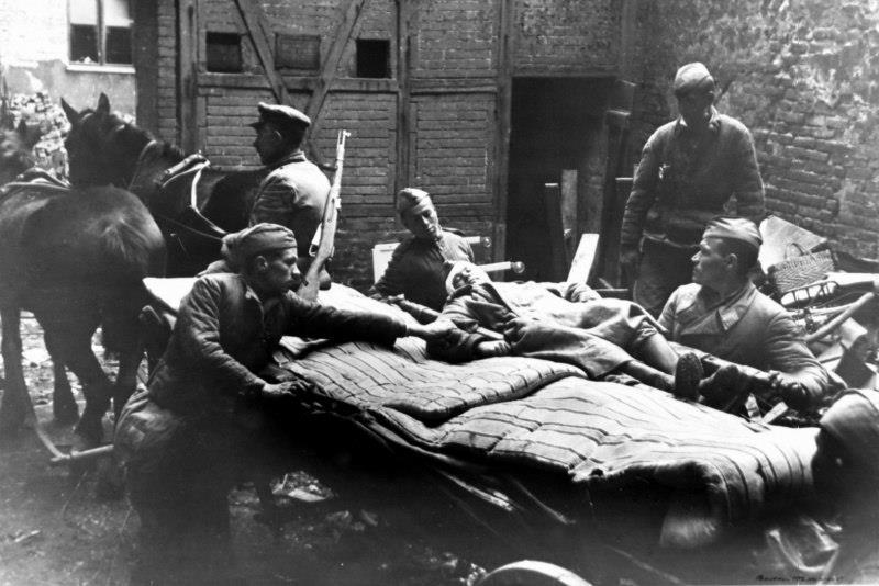 Советские санитары укладывают раненого красноармейца на конную повозку во дворе госпиталя.