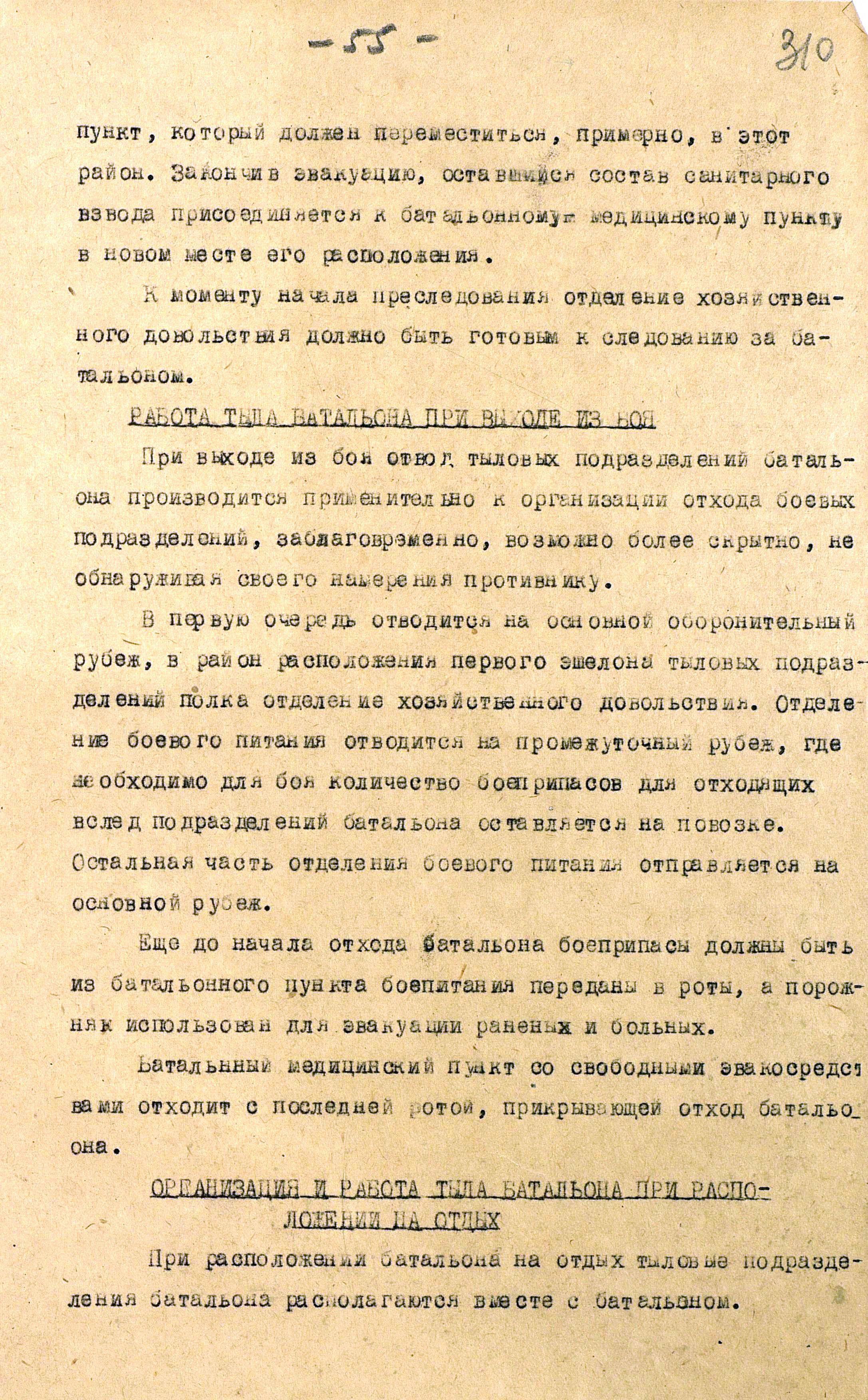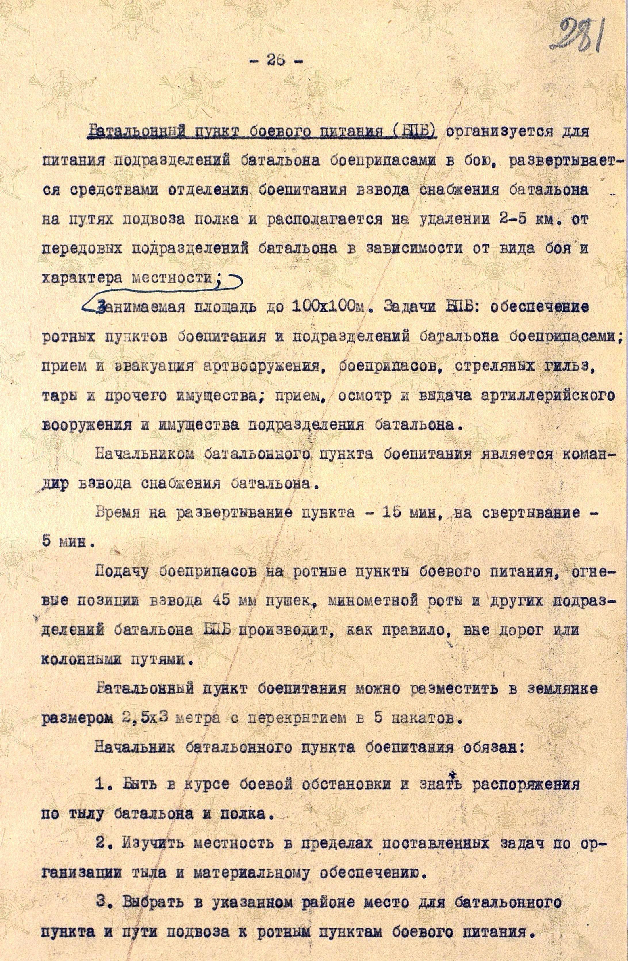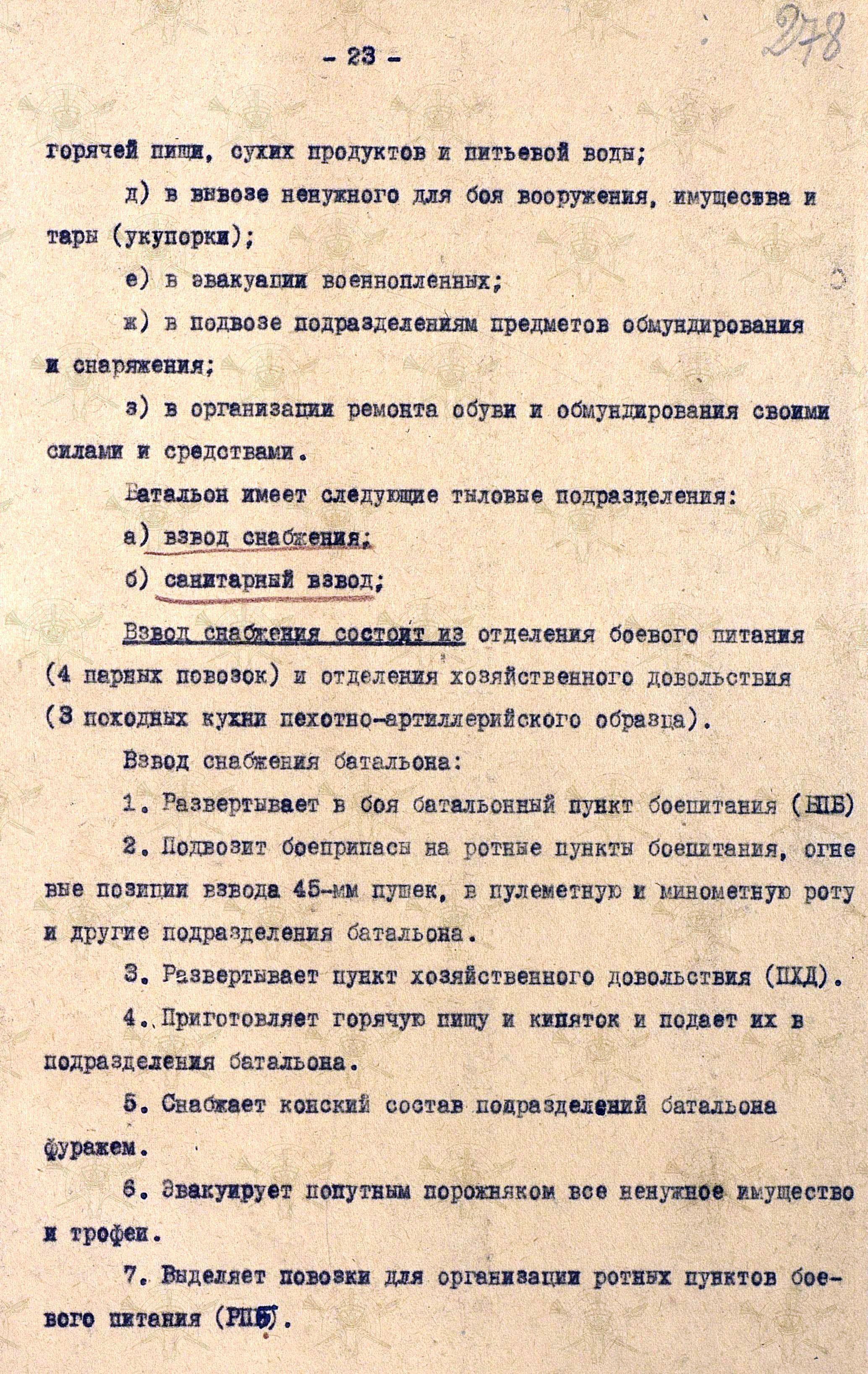 Давно и много обсуждая вопросы снабжения, оперируя понятиями войсковой, армейский и фронтовой тыл, мы ни разу не разбирали вопрос, а что это, собственно такое. Какие задачи выполнял батальонный, полковой и дивизионный тыл, его состав, порядок развертывания, нормативы, действия в наступательном, оборонительном бою и на марше и т.д. И сегодня хочу познакомить вас с общими положениями, пока, не раскрывая их подробно, и обсудить батальонный тыл. И для этого воспользуемся двумя документами: материалами для издания «Библиотеки офицера тыла Красной Армии» (1945 г.) и проектом Наставления по войсковому тылу стрелковых войск Красной Армии (1944 г.). Из проекта мы используем только схемы, качество самого документа – посредственное и читать его очень тяжело. В этом можно убедиться, посмотрев хотя бы несколько листов документа: