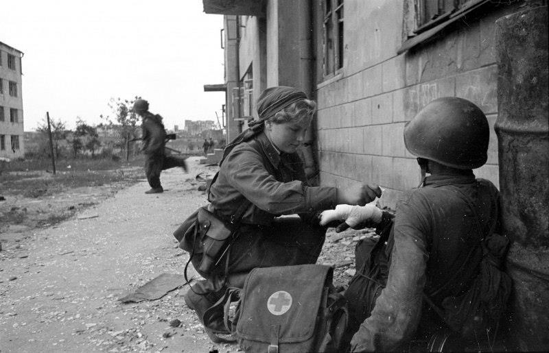 Санинструктор перевязывает руку раненому в бою красноармейцу на улице Воронежа, 1942 г.