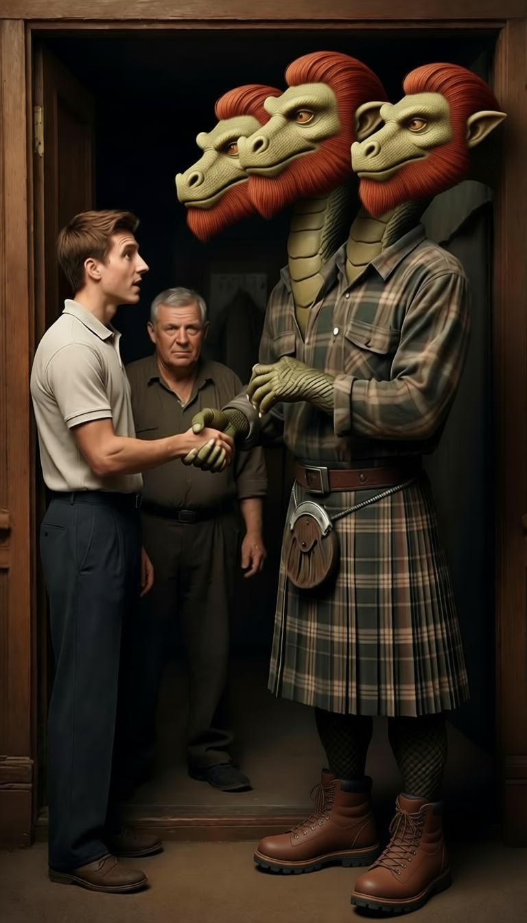 На нём был килт. Настоящий шотландский килт из грубой ткани в зелёно-синий тартан. Из-под его полы туго свисал мощный, покрытый крупной бронзовой чешуёй хвост, который кончиком лениво шуршал по линолеуму. Ноги, толстые, мускулистые, обильно поросшие тем же рыжим волосом, что и головы, были обуты. О, боги, в какую обувь!