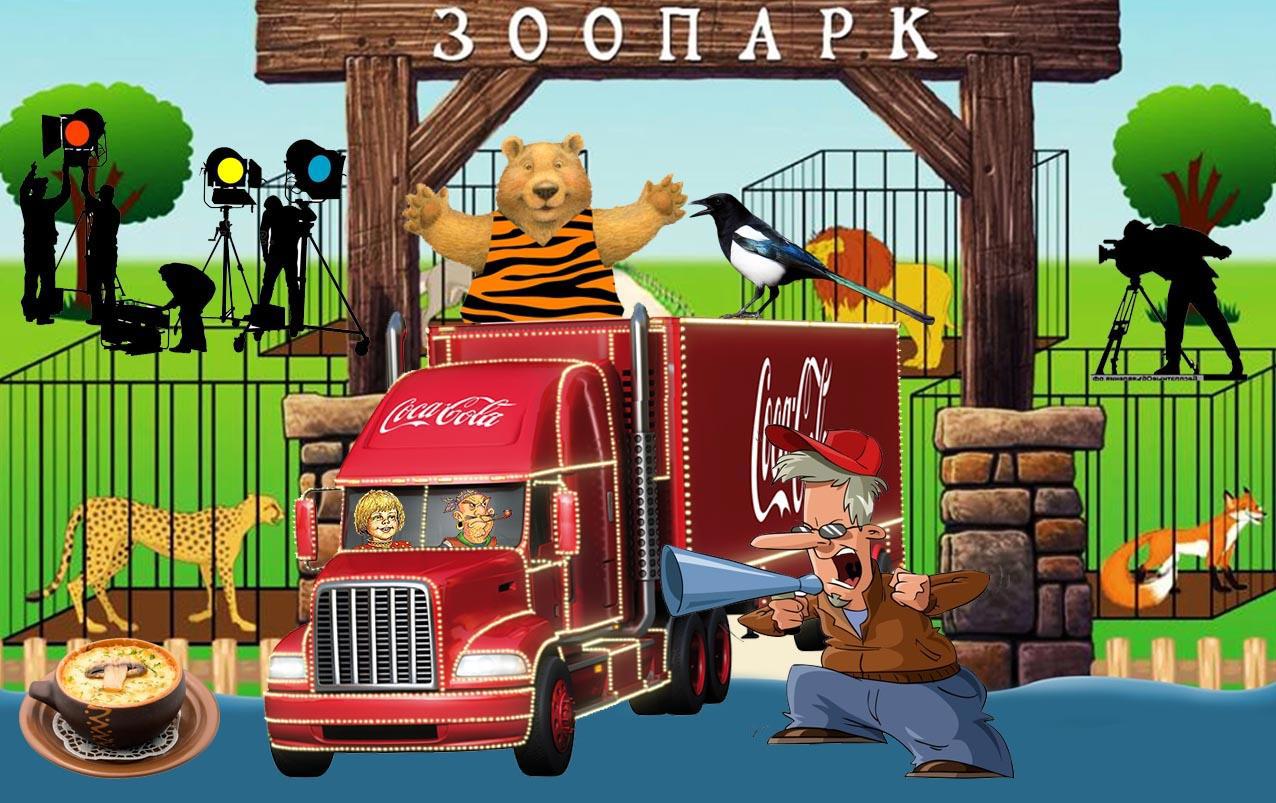 На подножку грузовика, со стороны окошка водителя, вскочил какой-то лохматый человек с сумасшедшими глазами, и стал кричать Пирату, что он опоздал на целый час, и пускай немедленно загоняет машину в Зоопарк и приступает к разгрузке, а то съемочная группа умирает от жажды. Пират радостно подчинился, и ведомый Сорокой, подъехал прямо к клеткам с енотами, а потом, оставив Медведя разгружать ящики с Кока-колой, направился вместе с Петей спасать Барсука.