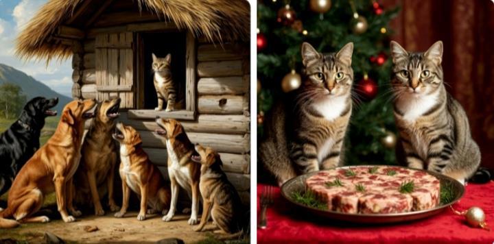 Окна у старой егерской резиденции были расположены достаточно низко и разъярённые псы с низкого старта ринулись в открытое окно, первым делом сбив новогоднюю елку. Кот естественно испарился и начался шурум бурум в процессе которого охотники оправившийся от первого шока ловили и изгоняли своих псов, а парочка шкодливых, но изобретательных котов катались в лотке с холодцом как кабаны в клевере, или вернее как Лукуллы в кремовом торте.