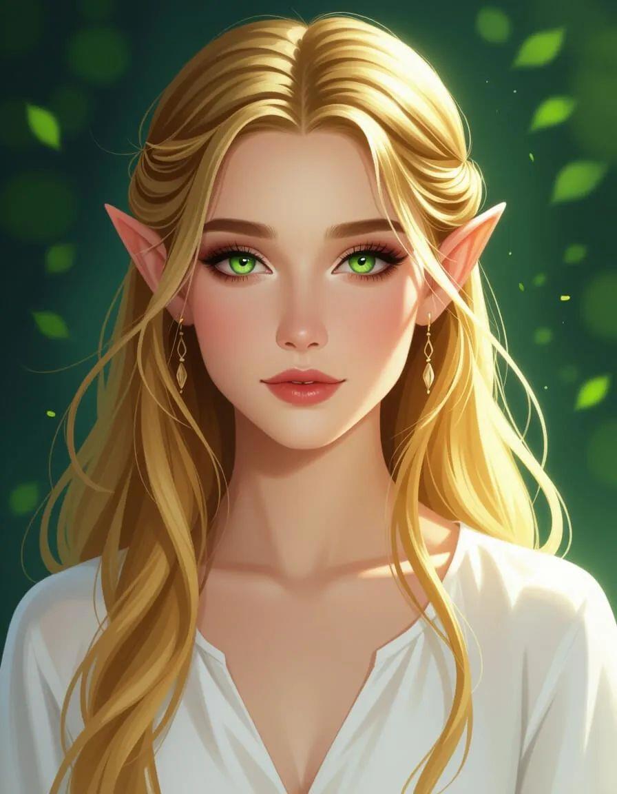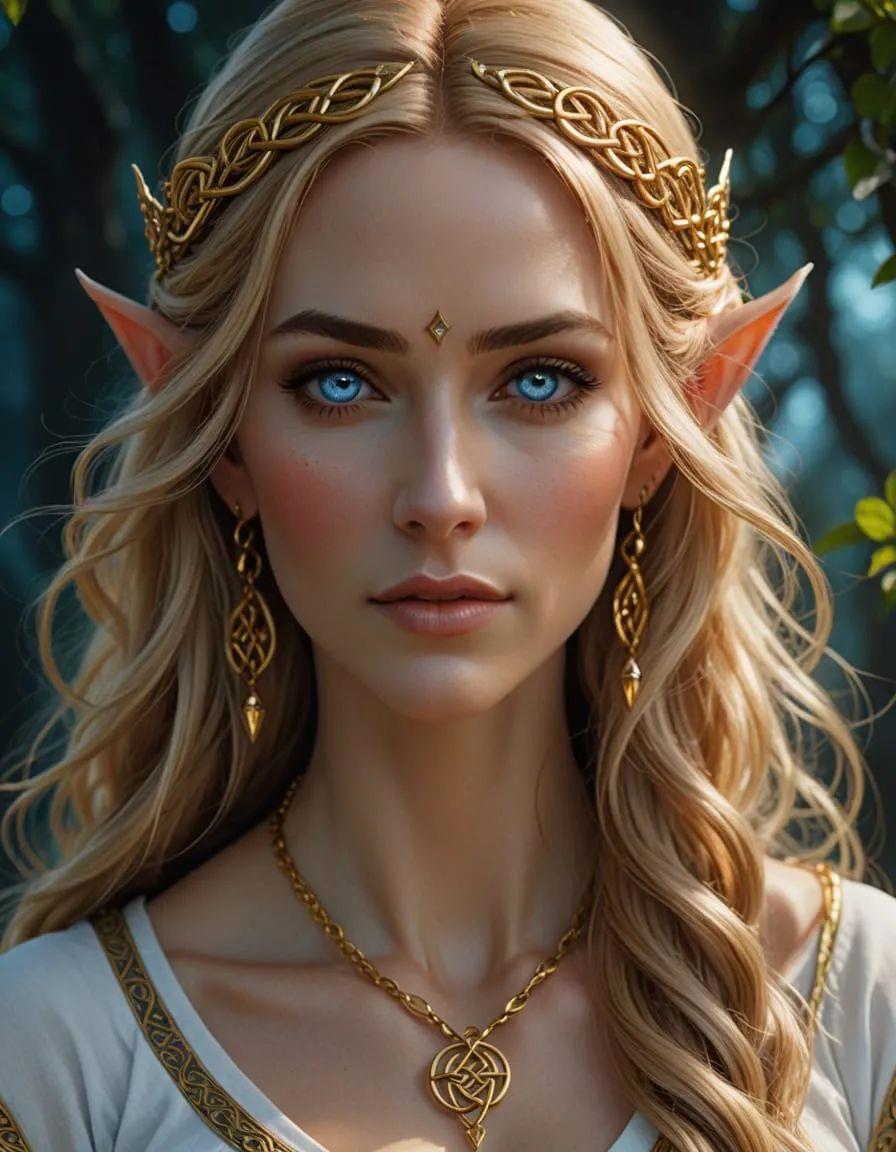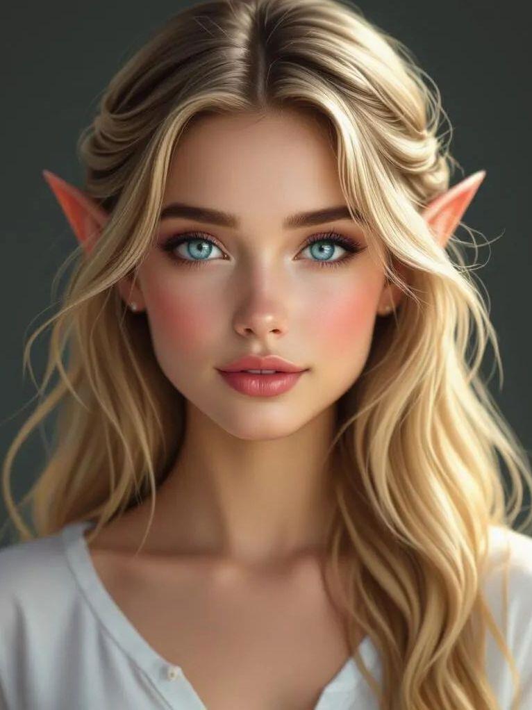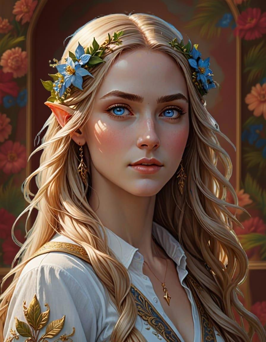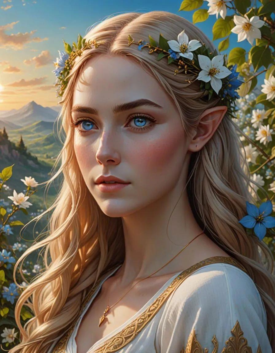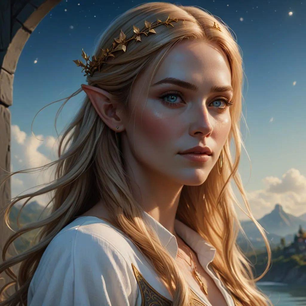 A very beautiful forever young elf female reminiscent of Amanda from Melrose Place series, with deep sky-blue eyes and long golden hair, sensitive, exquisite, tender, full of love. Wearing a simple white shirt. Fantasy illustration, cinematic portrait, close-up, highly realistic, very detailed.