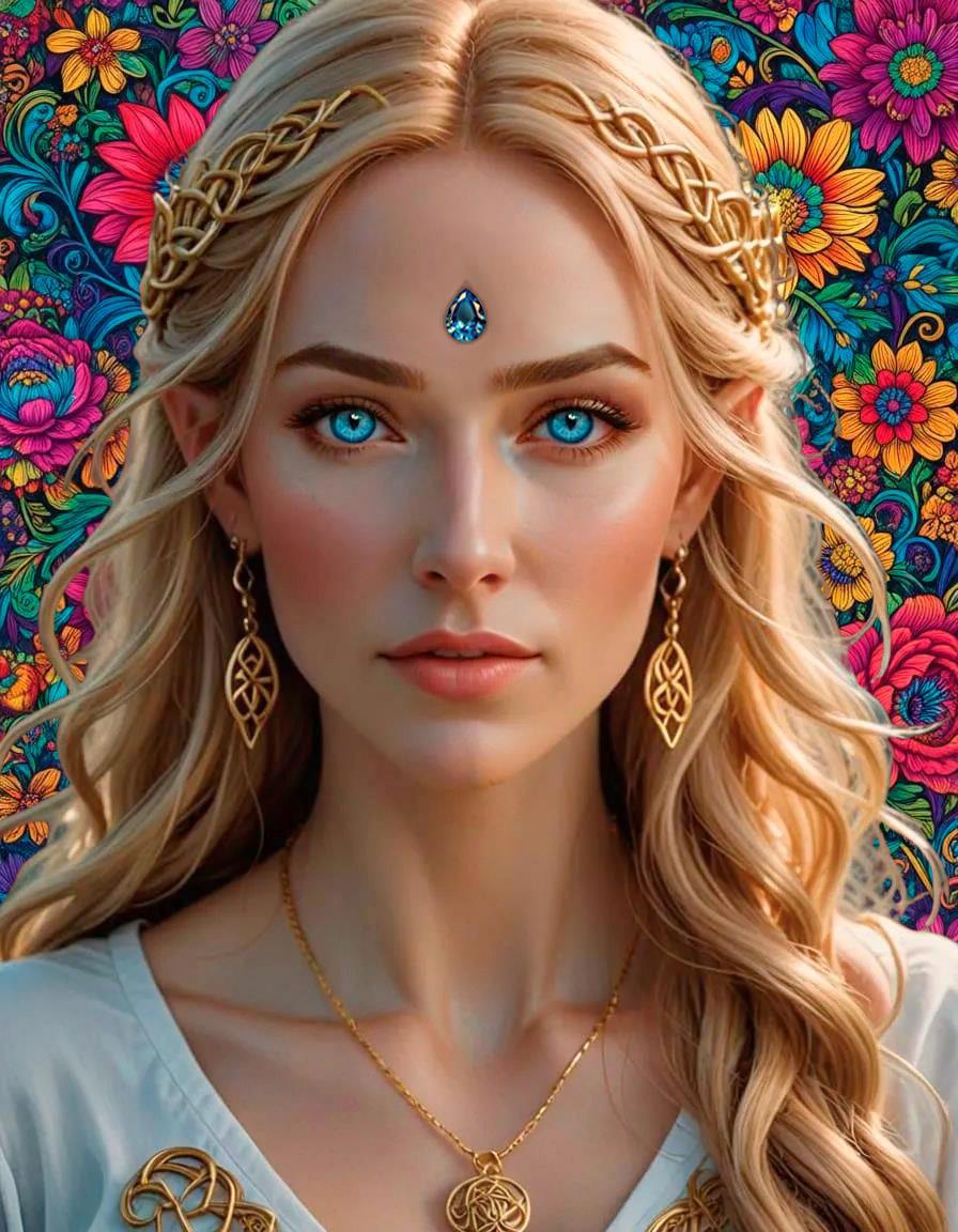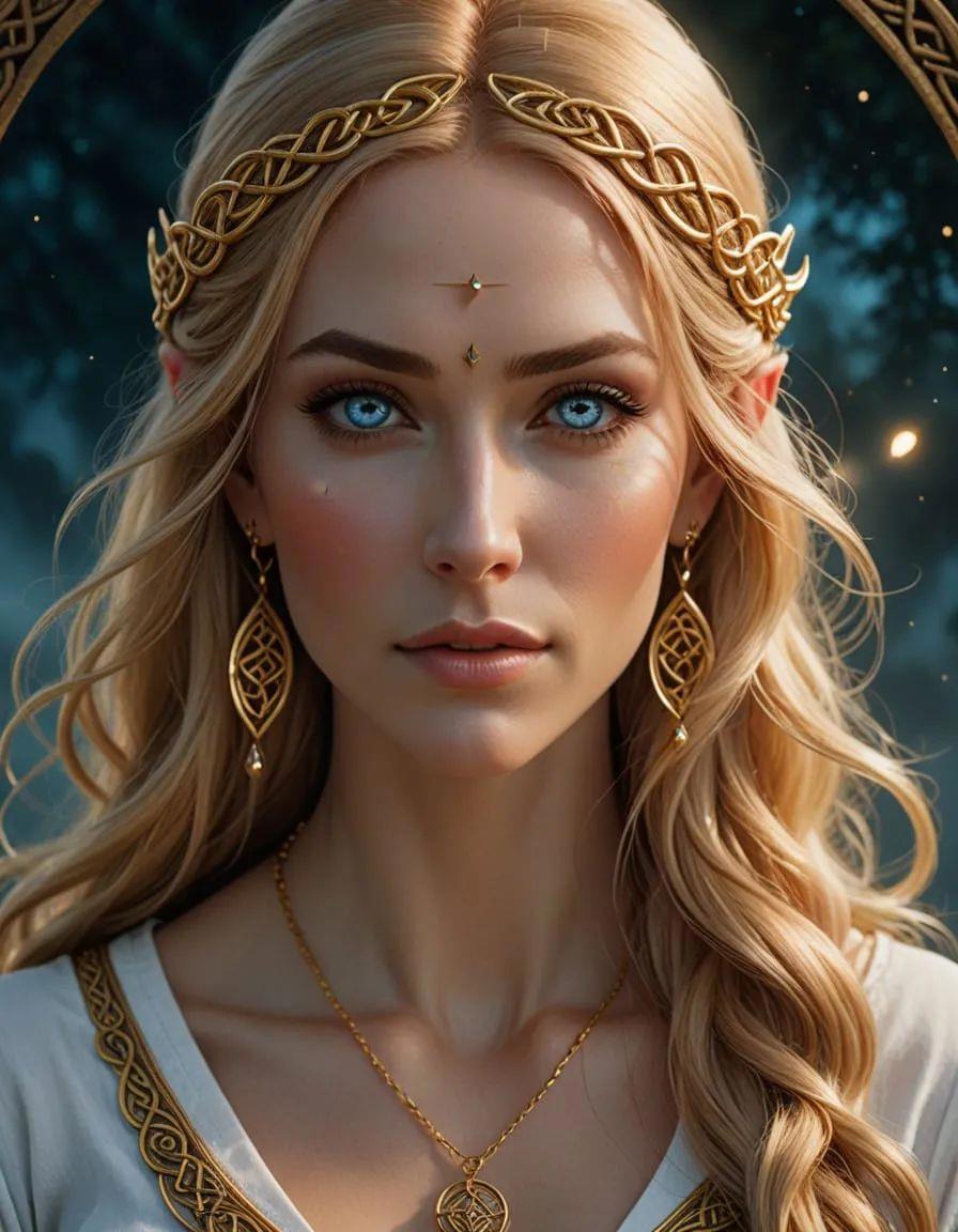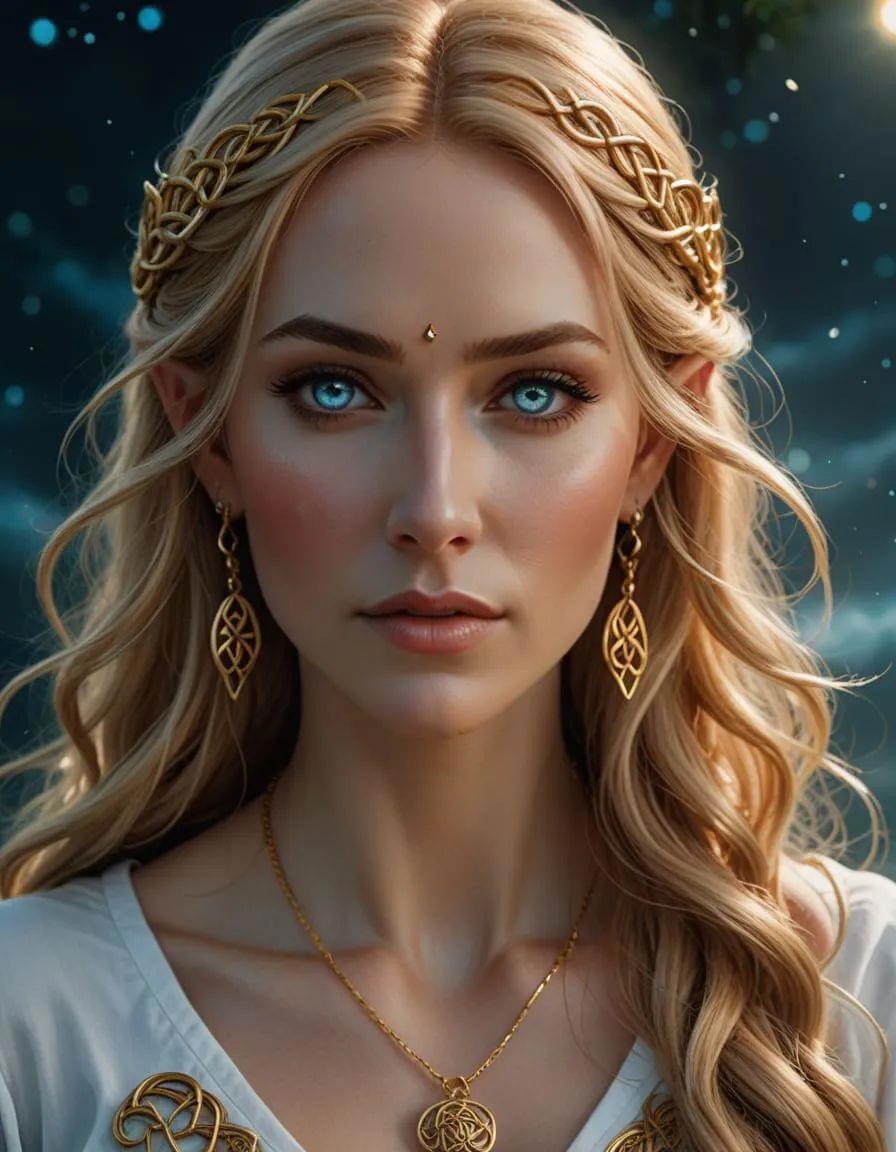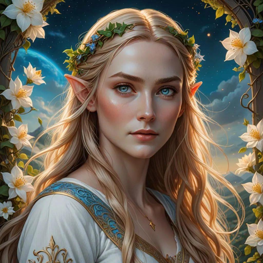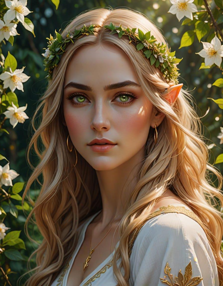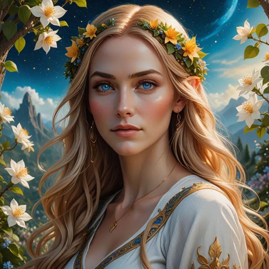 A very beautiful forever young elf female reminiscent of Amanda from Melrose Place series, with deep sky-blue eyes and long golden hair, sensitive, exquisite, tender, full of love. Wearing a simple white shirt. Fantasy illustration, cinematic portrait, close-up, highly realistic, very detailed.