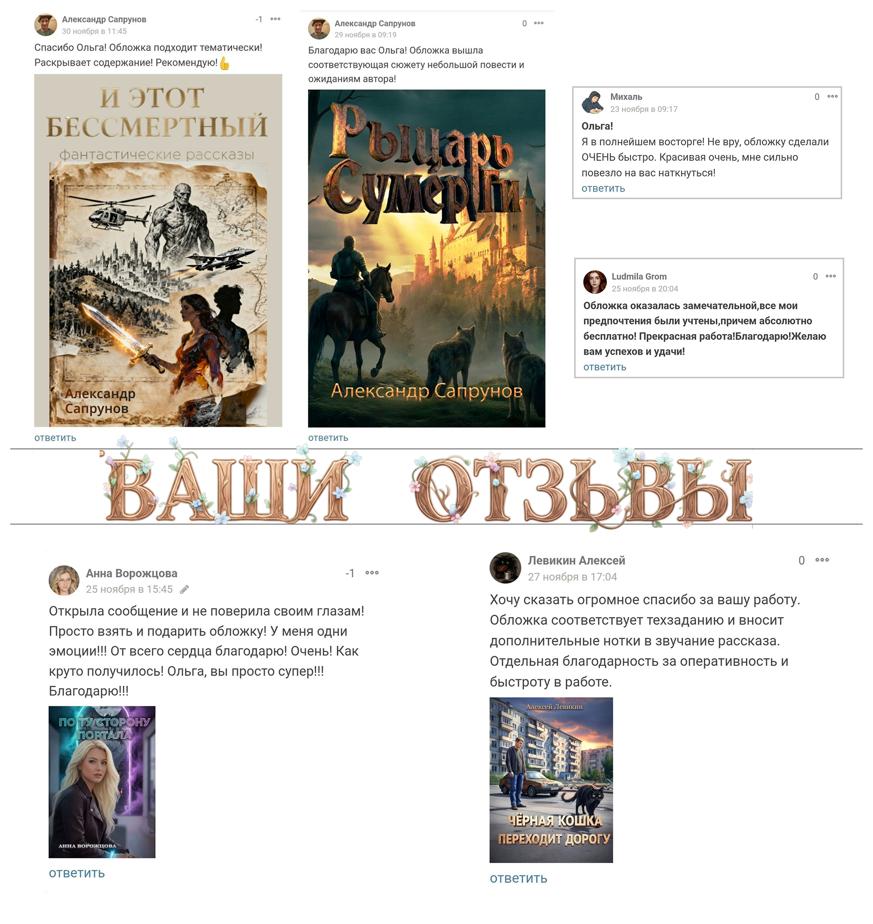 Мне очень повезло работать с талантливыми писателями, и я бесконечно благодарна за их теплые слова и доверие. Эти отзывы для меня — больше, чем просто комплименты. Это подтверждение, что мы с автором смогли найти общий язык и создать именно ту «одежду» для книги, о которой он мечтал.