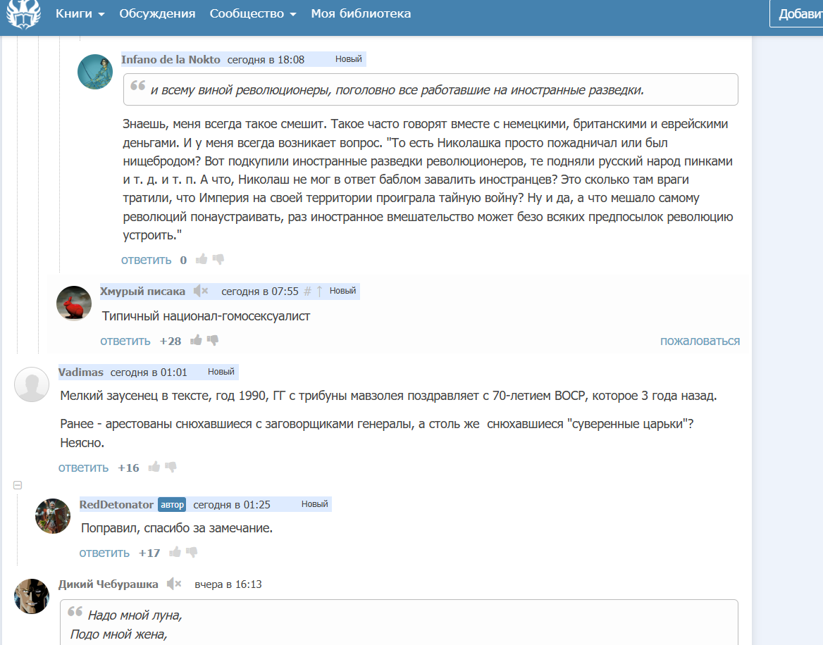 Особенно меня поражает низкий уровень знаний этих людей - это уровень обычной советской школы или постсоветской, где как были нарративы, в РИ всё плохо, а в СССР всё хорошо, так и есть. Отсюда и ненормативная лексика и хамство запредельно и ЧСВ, которое они показывают. При чём, если у меня в блоге некоторые из них не отсвечивают или ведут себя более-менее прилично, то под книгой своего любимого автора они не скрывают своих комплексов.