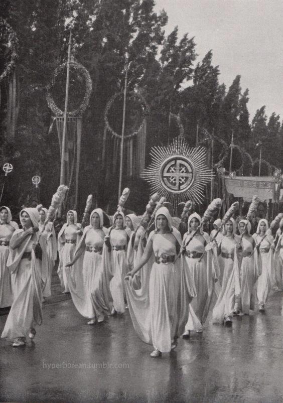Особенно помпезны были разнообразные парады в Третьем Рейхе. При Гитлере это особенно было развито - вот к примеру театрализованный парад истинно германских женщин (и да - до него женские парады были не популярны, тут он первооткрыватель)