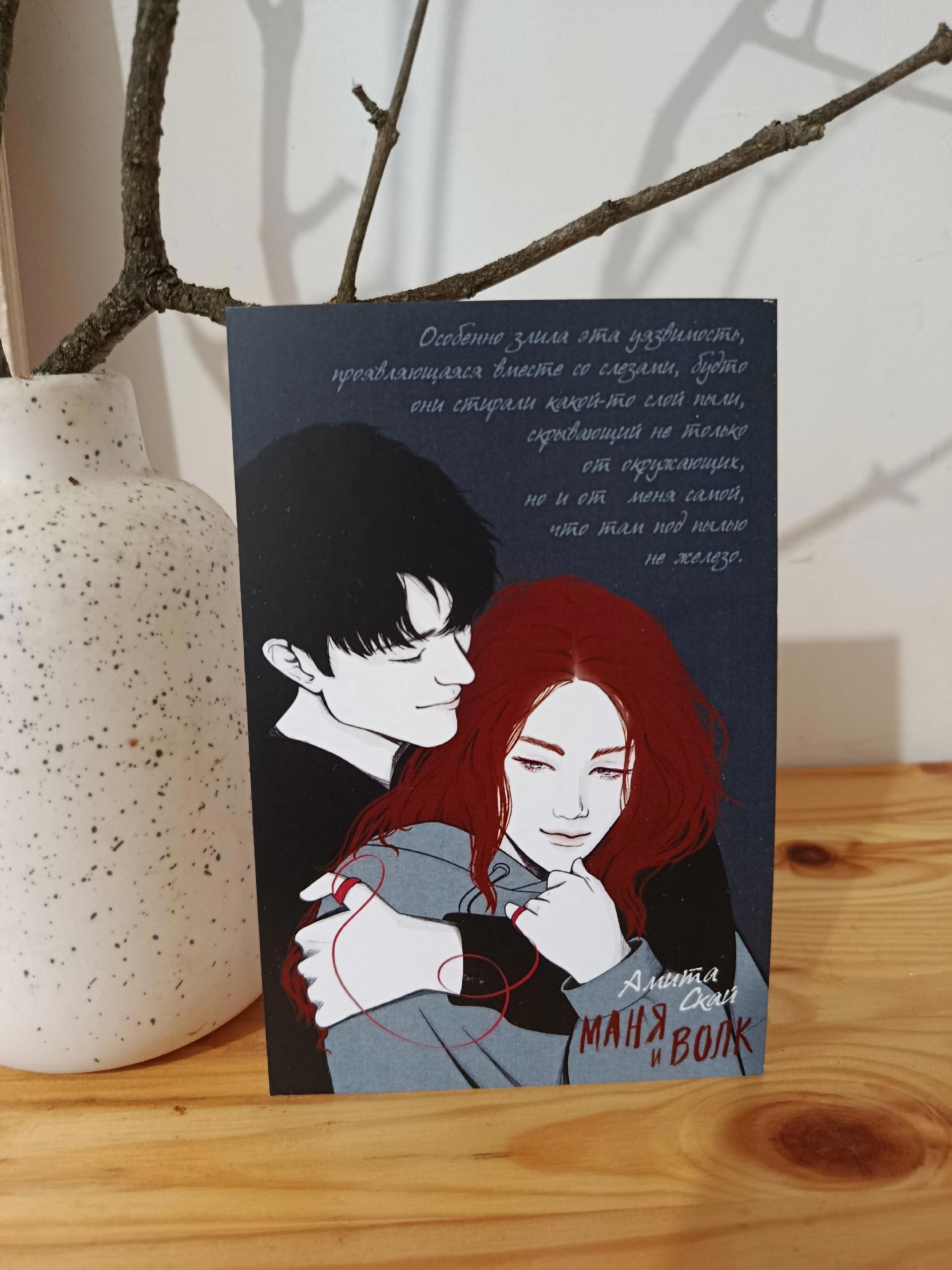 И чтобы эти сердца бились чуть теплее, я разыгрываю авторскую открытку, которую рисовала сама. На ней Маня, ее волк и цитата.