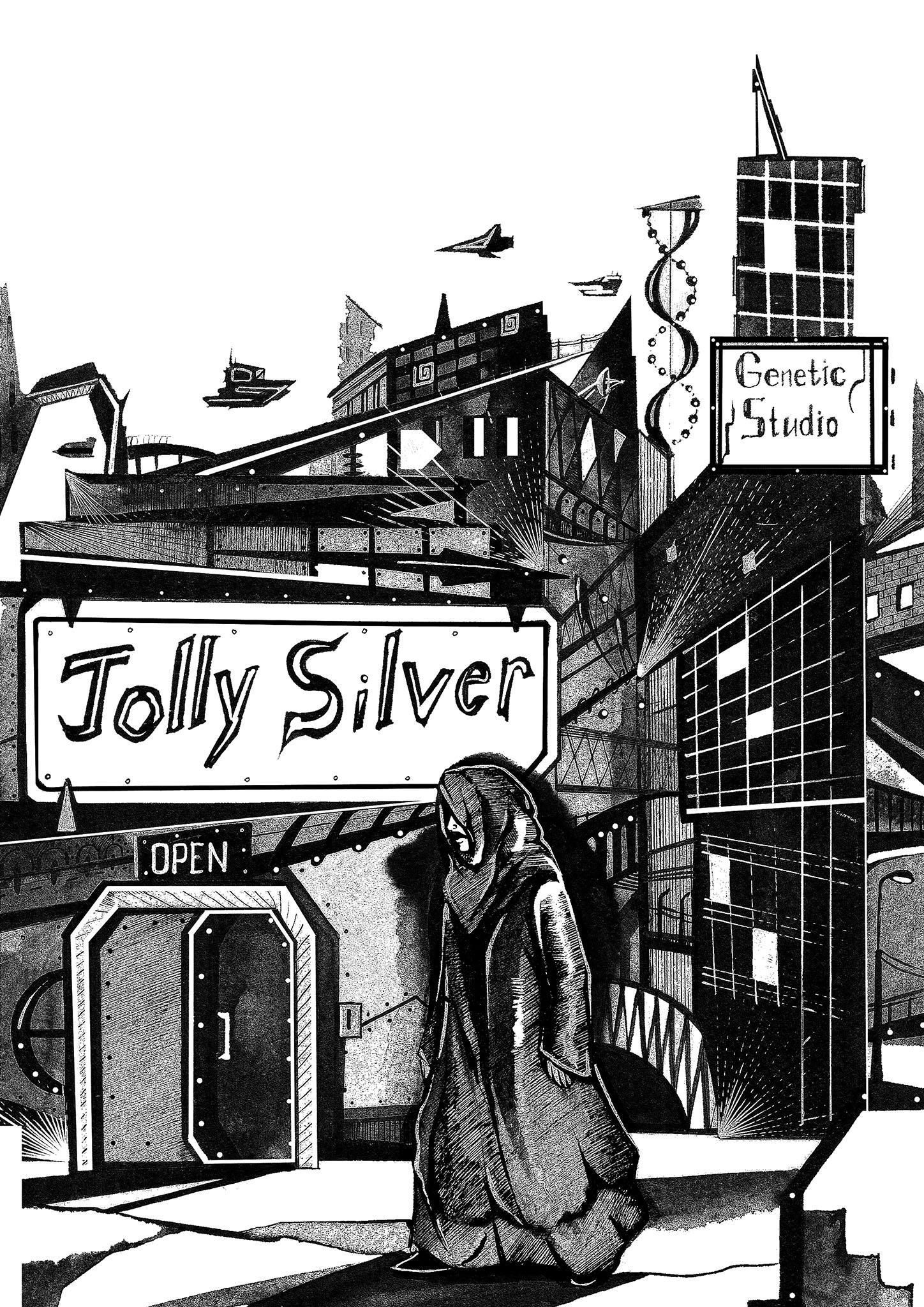 Губернатор Фокс на Кровавом Пределе. Иллюстрация к "Полёту Птитса": Диана Кузнецова. Здесь видны вывески "Весёлого Сильвера" и "Генетик-Студии".